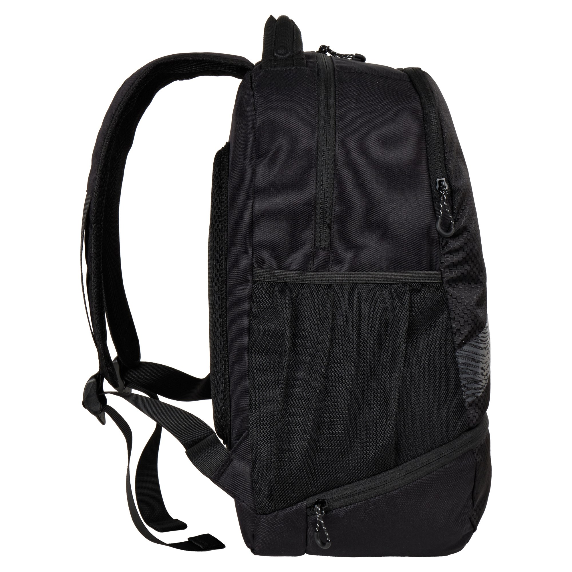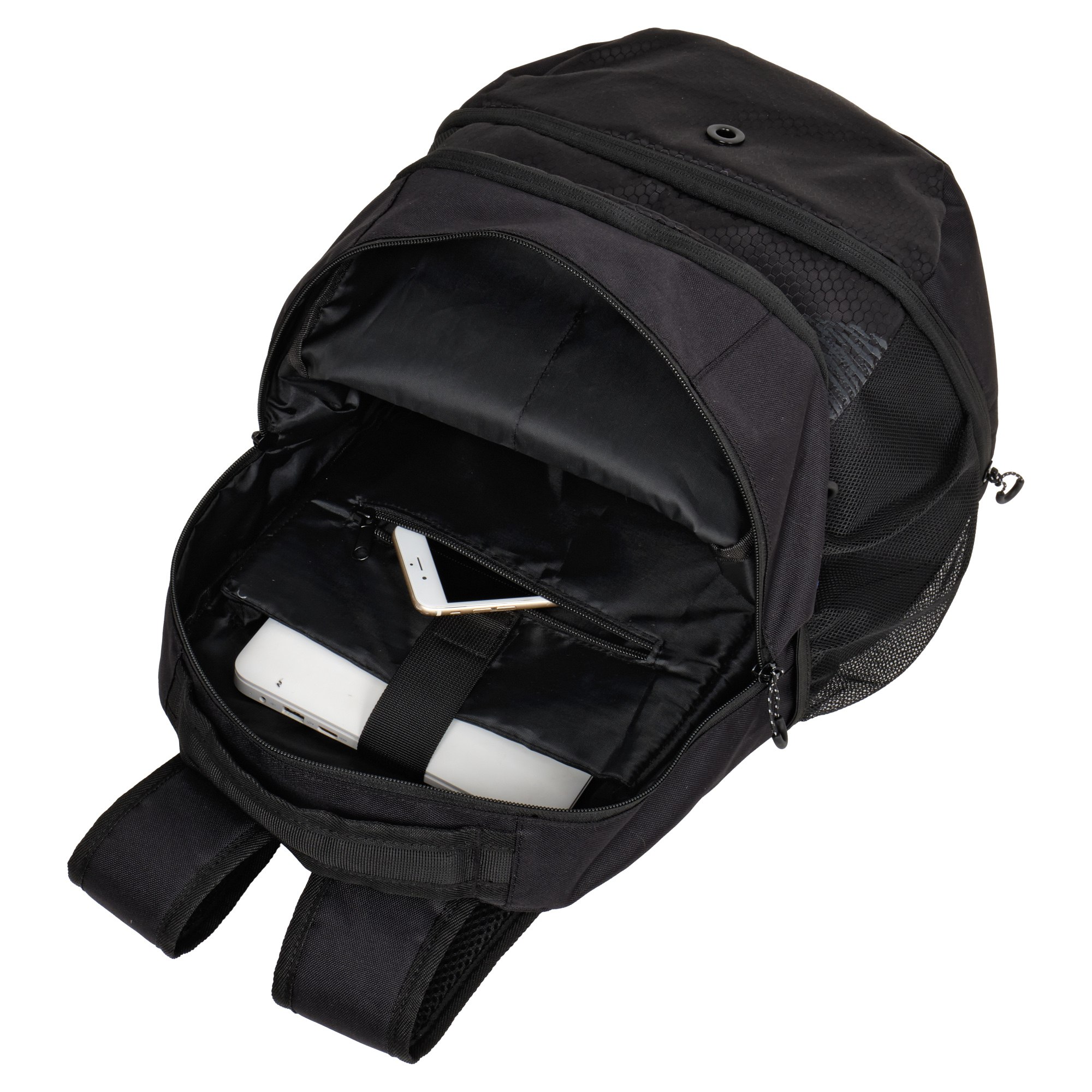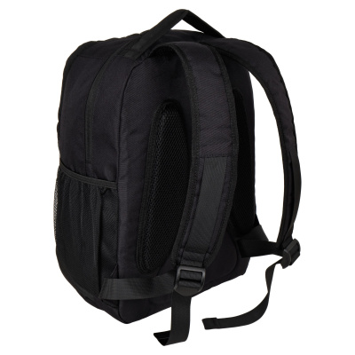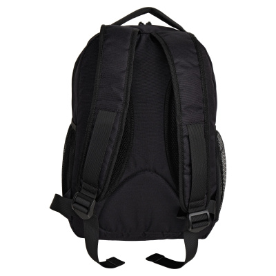 У рюкзака одно основное отделение, внутри которого небольшой карман на молнии для документов и отделение для ноутбука диагональю 14. Спереди большой карман с двумя открытыми кармашками. Боковые карманы на резинке из трикотажной сетки. Ручка рюкзака высотой 5 см.