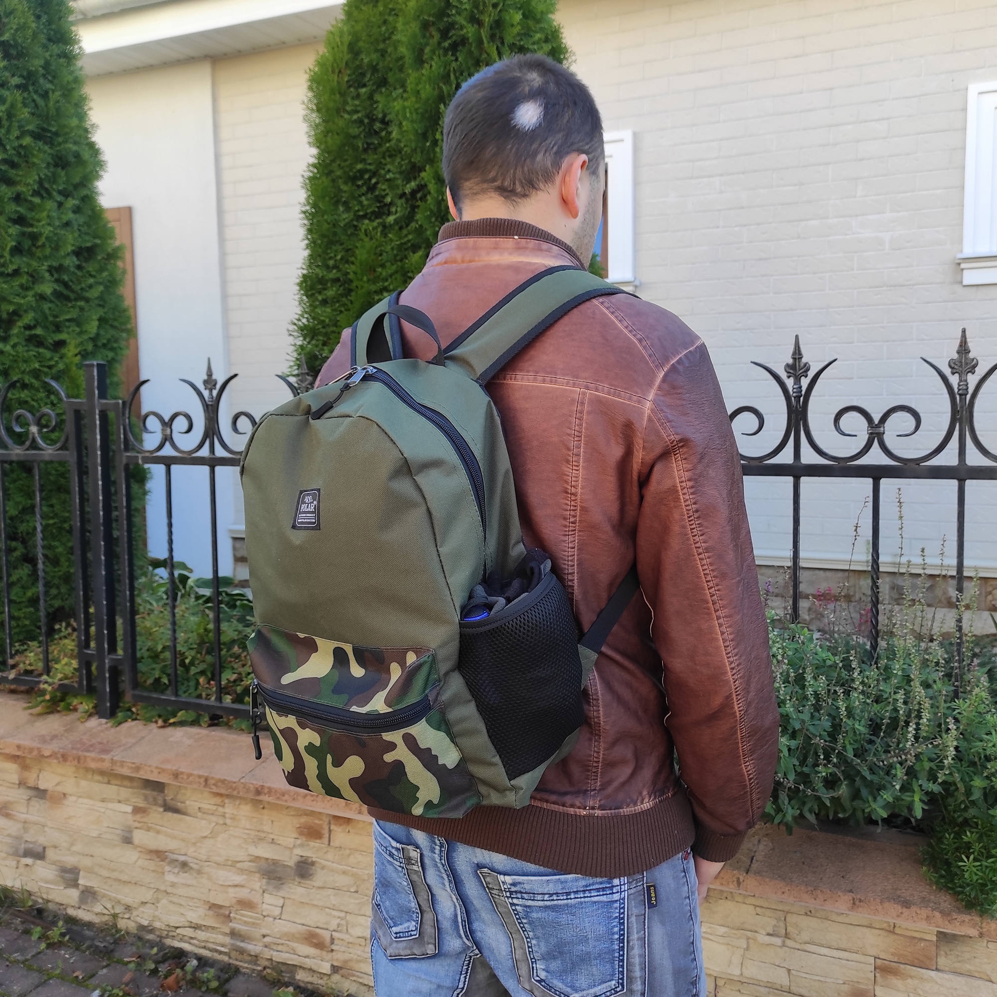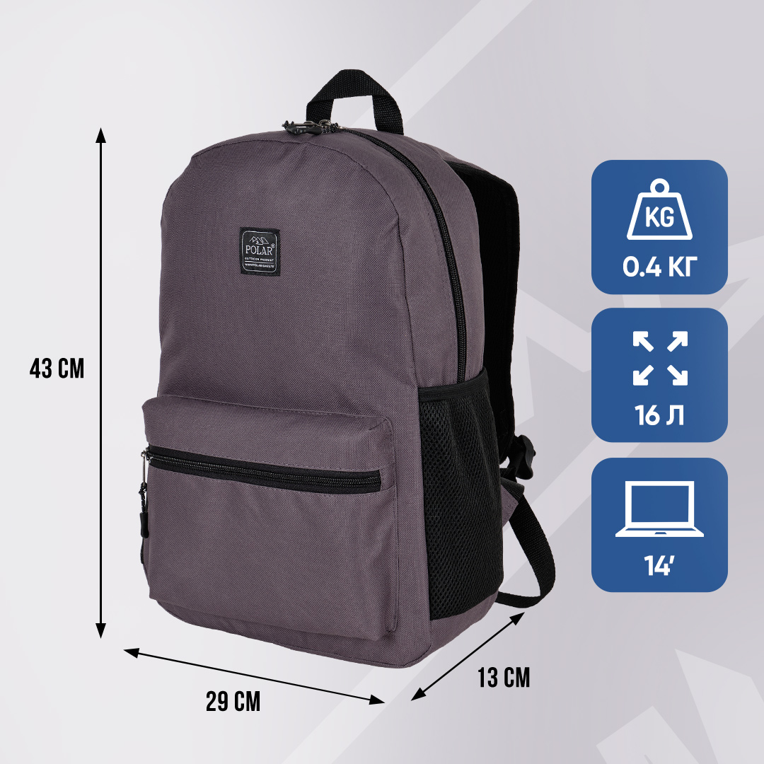 Спереди карман на молнии и два боковых кармана под бутылку или зонт. Внутри удобный карман на молнии для важных мелочей, карман на резинке для планшета или ноутбука до 14 дюймов, сетчатый карман. Вес рюкзака всего 400 грамм. Высота 42 см, ширина 29 см, глубина 12 см. Материал отлично чистится мягкой мыльной губкой.