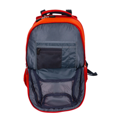 Рюкзак состоит из двух отделений. Большое основное отделение предназначено для изделий и документов формата А4 без сложения. Также внутри расположен карман для ноутбука размером до 16 дюймов, а для дополнительной фиксации предмета отделение оснащено эластичными стяжками на пластиковом карабине. Второе отделение оснащено органайзером и также подходит для крупных и средних предметов. Снаружи расположены два кармана из сетчатой ткани по бокам и один большой карман на молнии на фронтальной части рюкзака. Дополнительно рюкзак оснащен удобной ручкой для переноски, грудной стяжкой и светоотражающей вставкой.