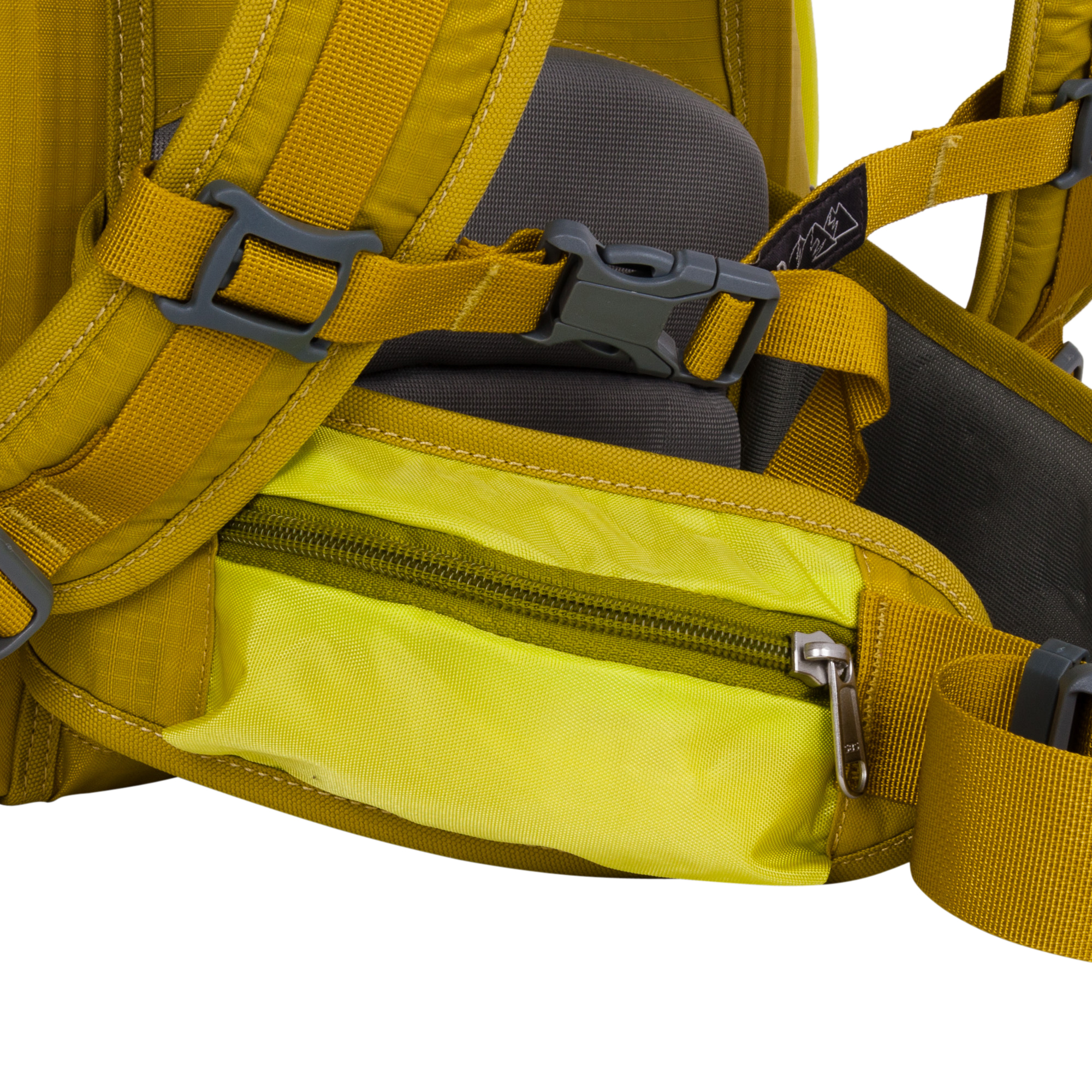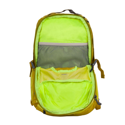 Основное отделение на молнии с большим карманом на резинке. Второе отделение с вместительным сетчатым карманом. Спереди небольшой карман на молнии для мелочей. По бокам располагаются открытые карманы на резинке. Спинка жесткая, имеет вставки из пены для лучшего воздухообмена. Мягкий набедренный пояс с карманом на молнии. Наплечные ремни анатомической формы не натирают плечи, регулируются по длине. Удобная ручка для переноски. Боковыми и нагрудными стяжками регулируется его объем.