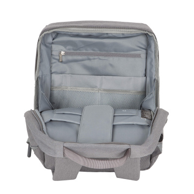Рюкзак имеет одно основное отделение, внутри которого есть карманы для ноутбука диагональю до 15” размер отсека 36 х 28 х 2, и планшета, несколько открытых карманов и потайной карман на молнии.
