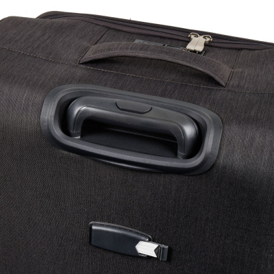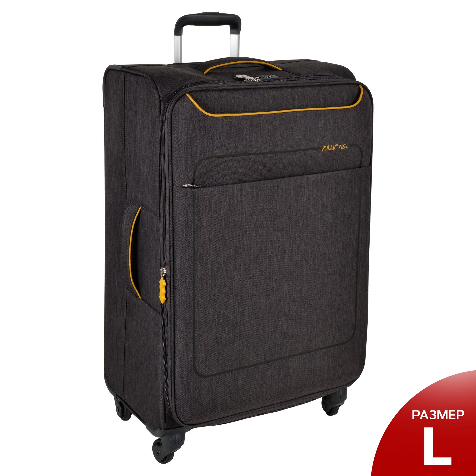 Большой чемодан фирмы Polar. Внутри имеются фиксирующие ремни и карман на молнии. Основное отделение можно увеличить в объеме, расстегнув молнию, при этом чемодан увеличивается в глубину на 5 см. Максимальный объем при увеличении 114 л.. Ручка выдвигается в два сложения до 30 см, Ручка расположена внутри корпуса чемодана, что способствует ее защите при погрузке чемодана. Снаружи на передней стенке — два больших кармана на молнии. Надежные четыре колеса на подшипниках, вращаются на 360° градусов. У чемодана встроенный TSA кодовый замок.