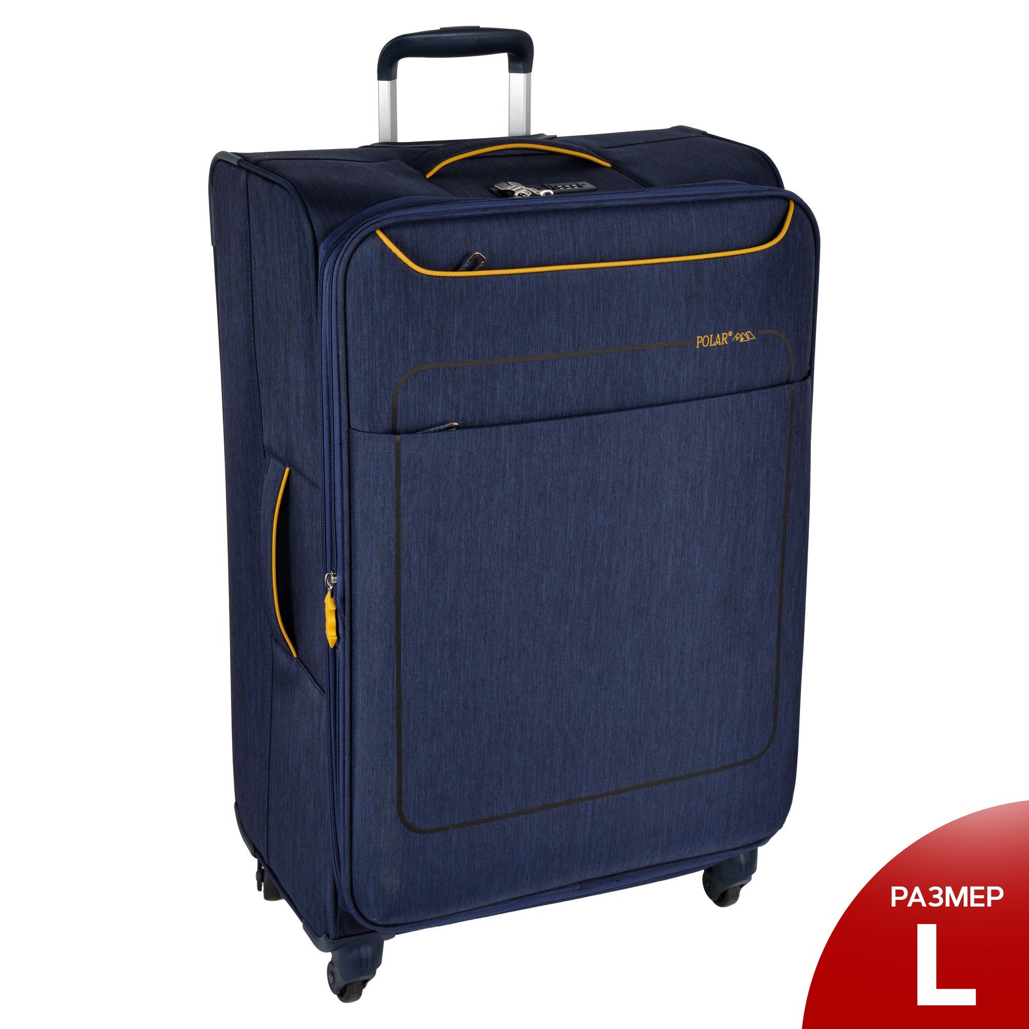 Большой чемодан фирмы Polar. Внутри имеются фиксирующие ремни и карман на молнии. Основное отделение можно увеличить в объеме, расстегнув молнию, при этом чемодан увеличивается в глубину на 5 см. Максимальный объем при увеличении 114 л.. Ручка выдвигается в два сложения до 30 см, Ручка расположена внутри корпуса чемодана, что способствует ее защите при погрузке чемодана. Снаружи на передней стенке — два больших кармана на молнии. Надежные четыре колеса на подшипниках, вращаются на 360° градусов. У чемодана встроенный TSA кодовый замок.