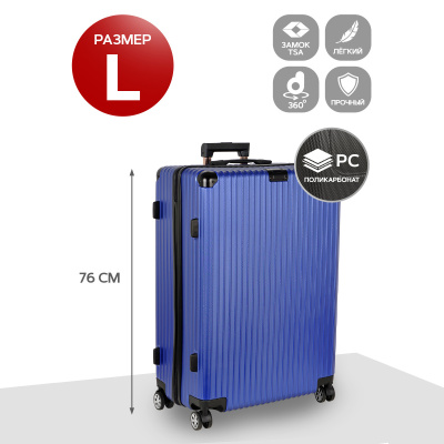 Чемодан на четырех прорезиненных колесиках. Чемодан выполнен из нового легкого материал PC (Поликарбонат). В отличие от ABS-пластика чемоданы из PC можно эксплуатировать при очень низких температурах. PC (Поликарбонат) обладает высокой прочностью, эластичностью и высокой ударостойкостью. Особенностью чемоданов из PC (Поликарбонат) является малый вес. Внутри подкладка из полиэстра. Одна секция чемодана с креплением резинками для одежды. Вторая секция застегивается на молнию для удобства упаковки вещей. Есть кодовый замок TSA.