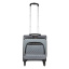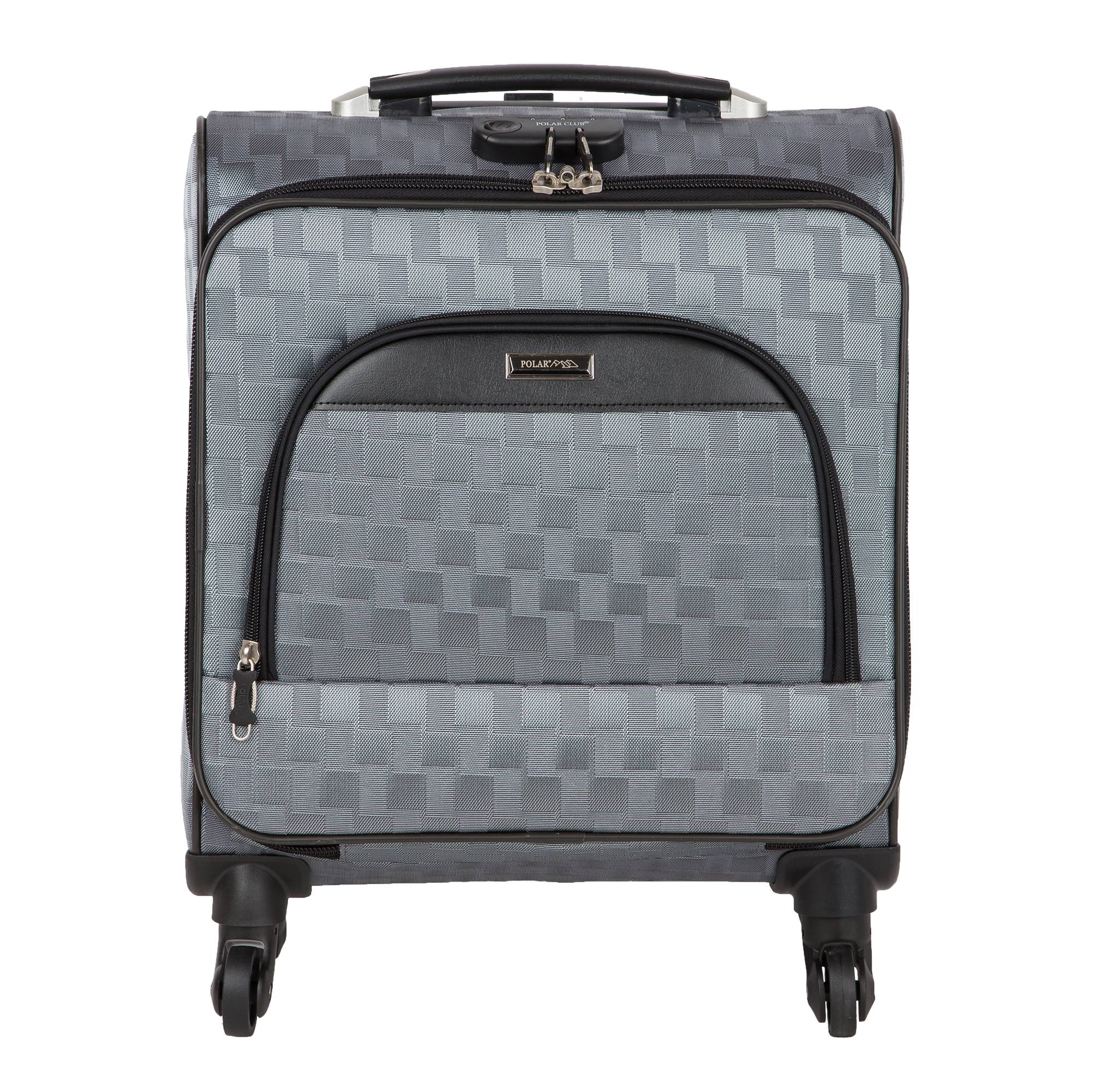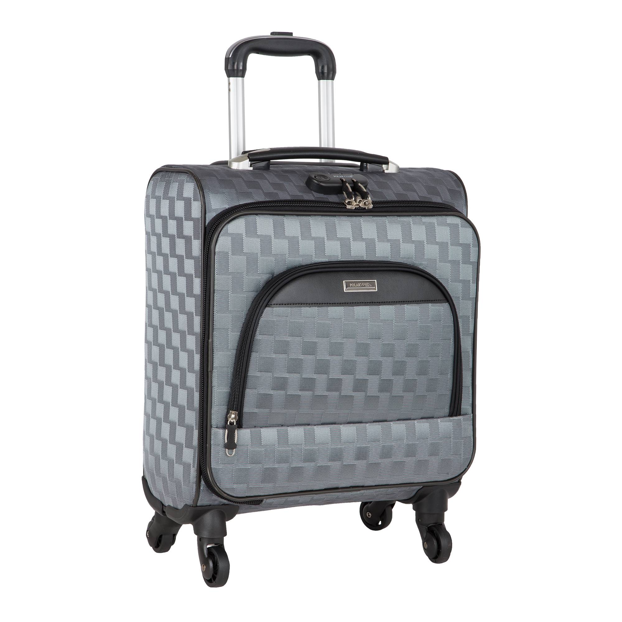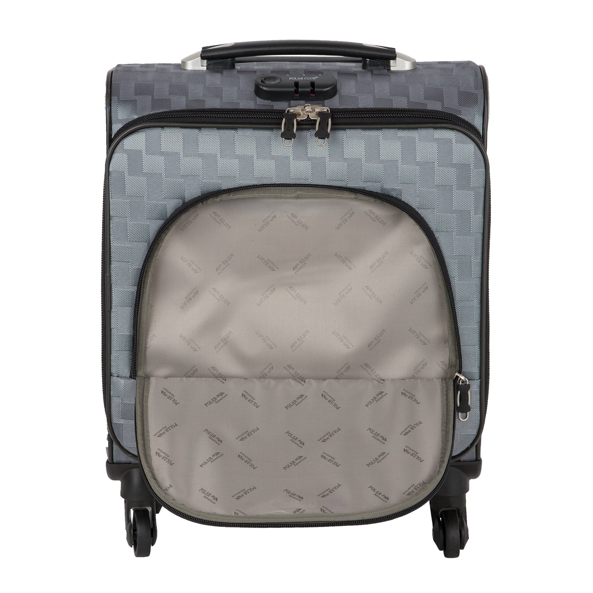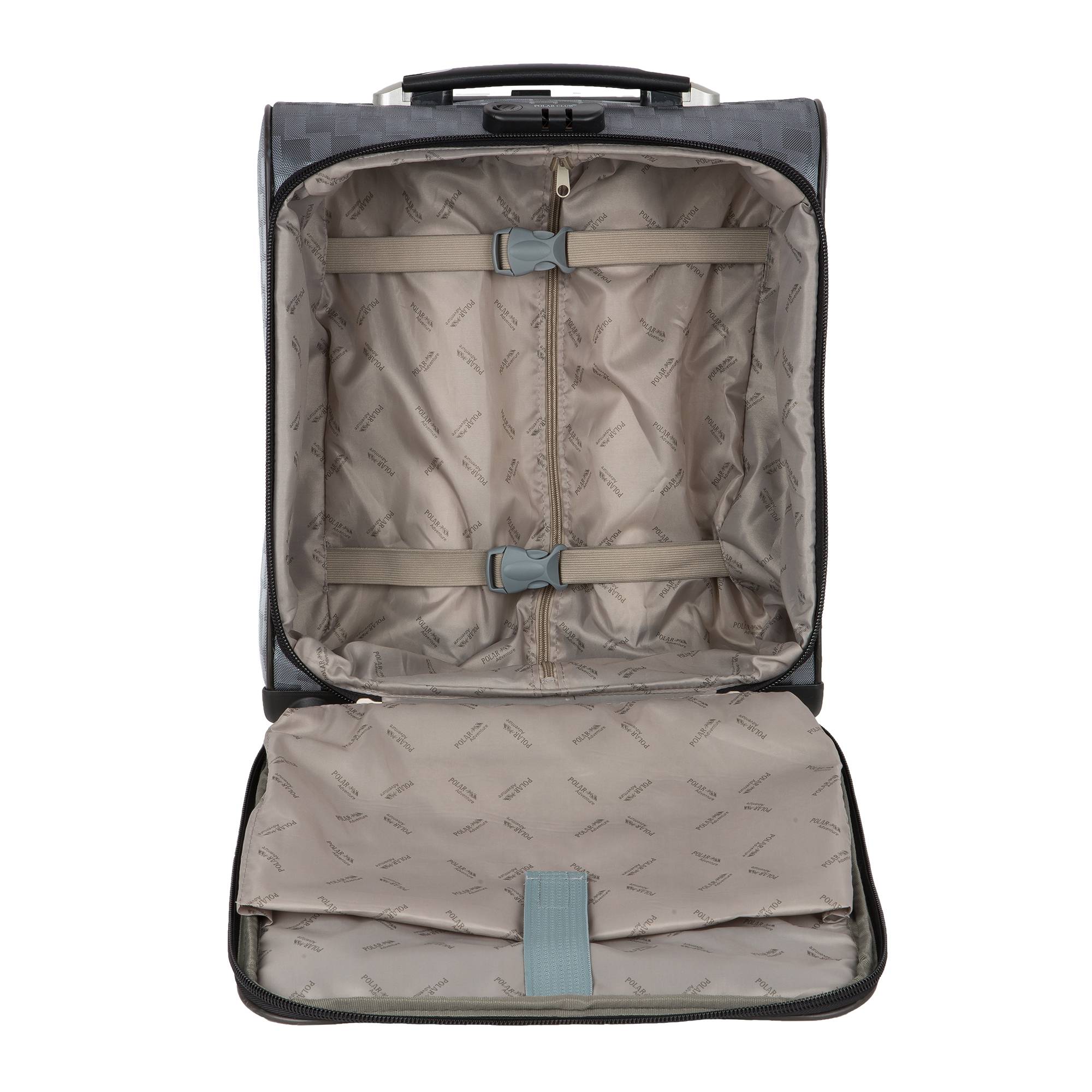 Чемодан от компании "Polar" на четырёх колёсах выполнен из прочного материала (нейлона и полиэстера). Подходит как ручная кладь. Чемодан закрывается на молнию, присутствует также встроенный кодовый замок.Внутри есть одно большое отделение , в котором присутствуют ремни для фиксации вещей, отделение для ноутбука и маленький карман на молнии для документов. Снаружи расположен объёмный карман на молнии для мелких вещей. У чемодана есть небольшая ручка для переноски и металлическая ручка, которая выдвигается на 55см.