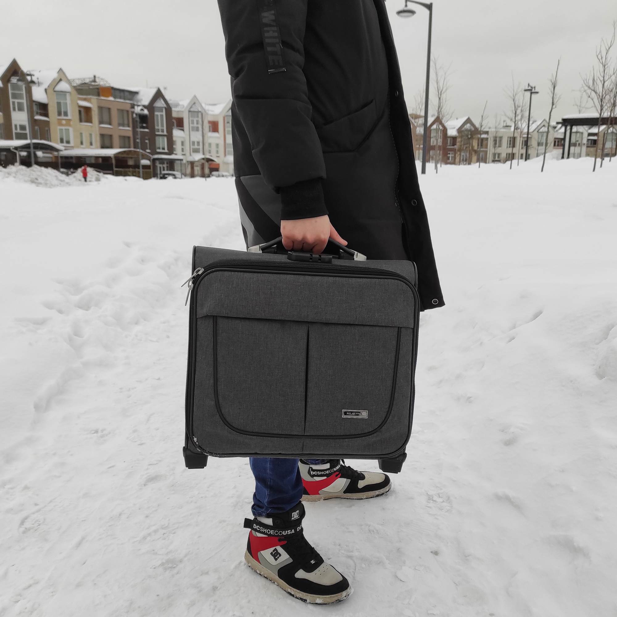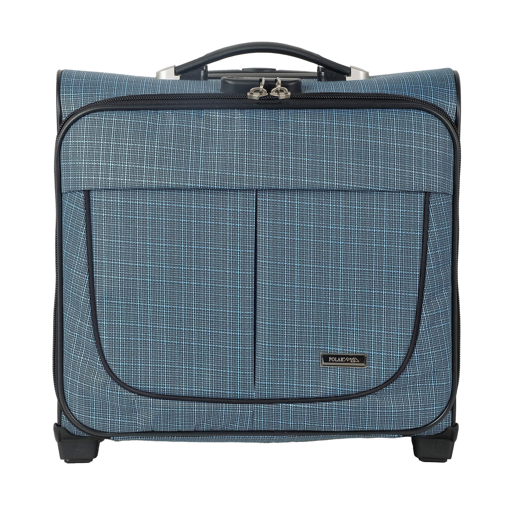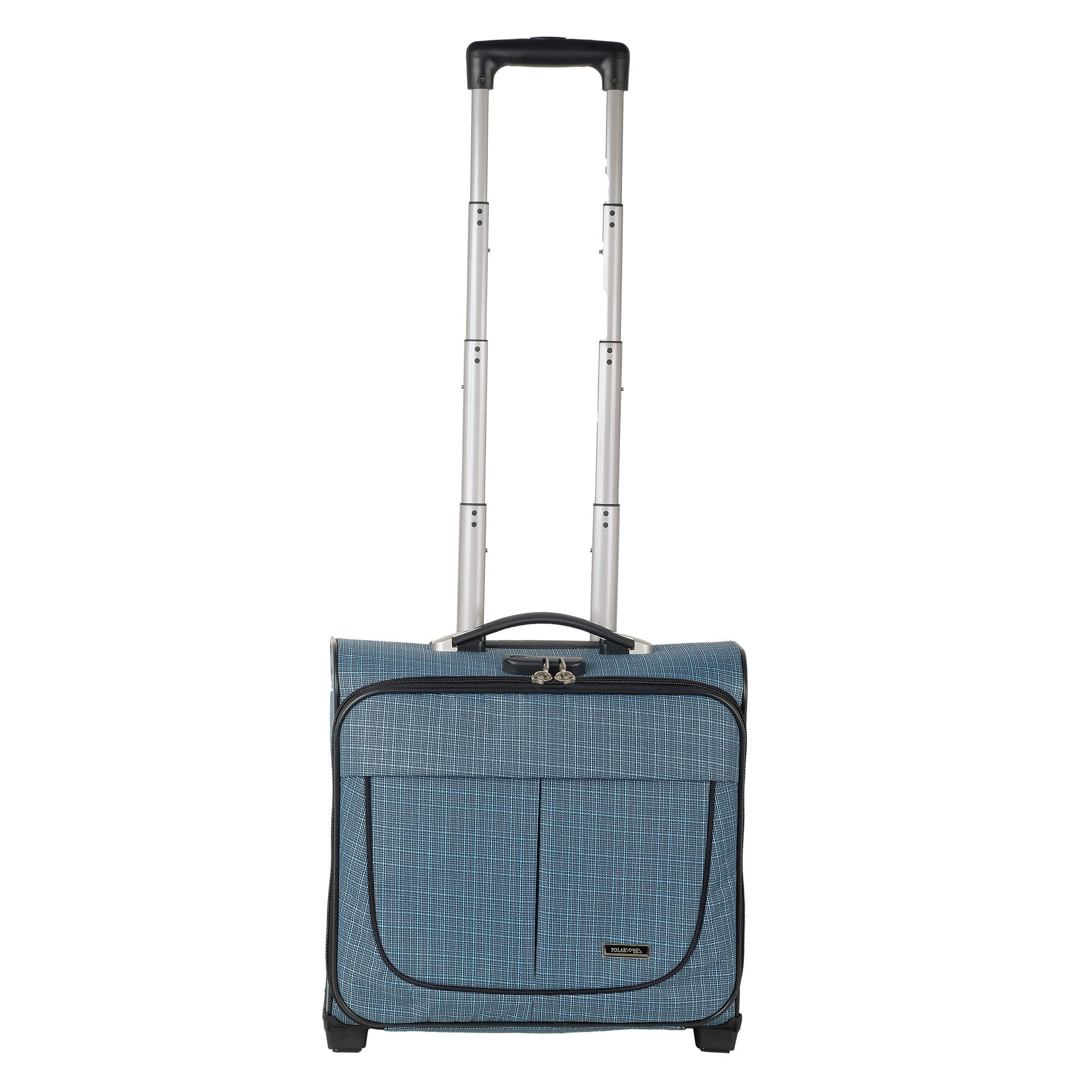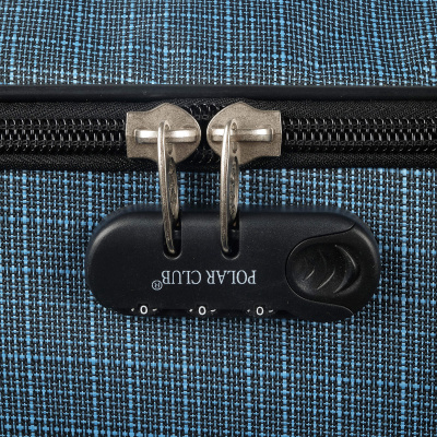 Чемодан от компании "Polar" на двух колёсах выполнен из прочного материала жаккарда. Подходит как ручная кладь. Чемодан закрывается на молнию, присутствует также встроенный кодовый замок.Внутри есть одно большое отделение , в котором присутствуют ремни для фиксации вещей. Снаружи расположен объёмный карман на молнии для мелких вещей. У чемодана есть небольшая ручка для переноски и металлическая ручка, которая выдвигается на 67 см.