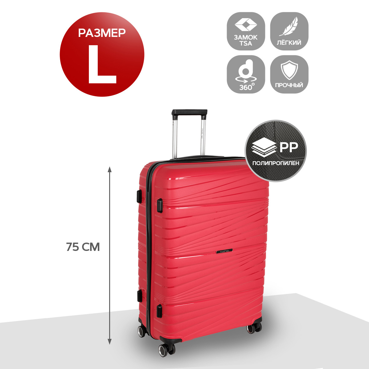 Чемодан фирмы POLAR, размер L, выполнен из PP (полипропилен). Основное отделение разделено на две части. Одно имеет фиксирующие ремни, второе на молнии. Выдвигающаяся ручка расположена внутри корпуса чемодана, что способствует большей прочности и защите от ударов при разгрузке/погрузке чемодана. Выдвигающаяся ручка фиксируется в двух положениях. Есть кодовый замок. Надежные 4 колеса.