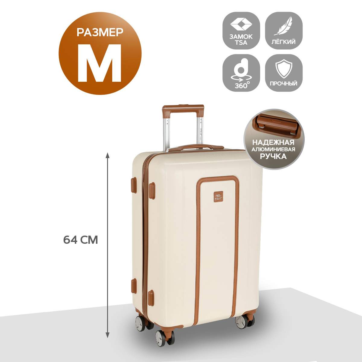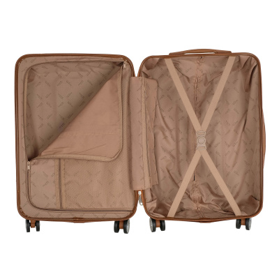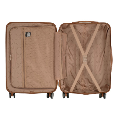 Чемодан средний 24" на четырех прорезиненных колесиках. Внутри подкладка из полиэстра. Одна секция чемодана с креплением резинками для одежды. Вторая секция застегивается на молнию для удобства упаковки вещей. Есть кодовый замок TSA.