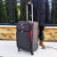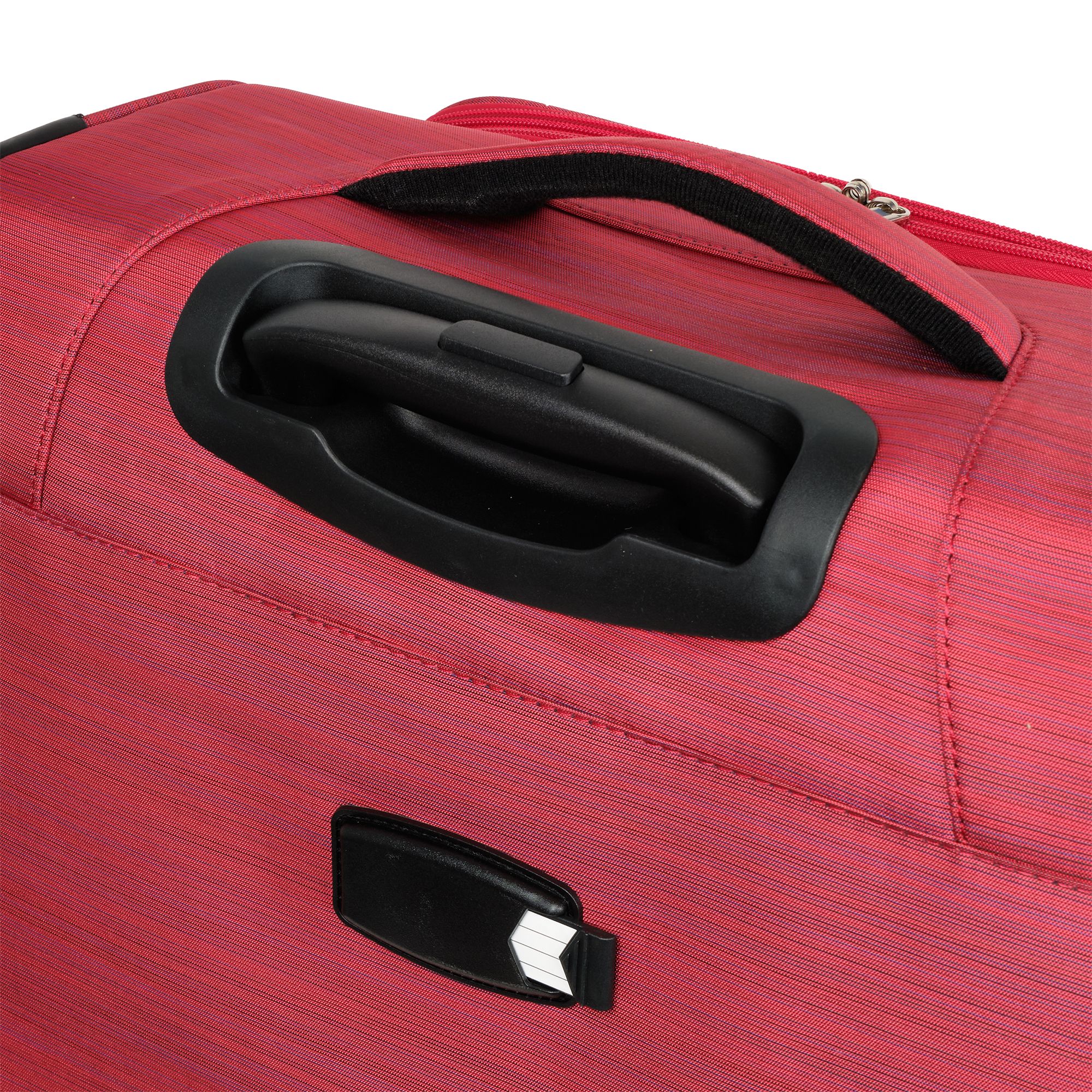 Стильный чемодан модной расцветки имеет в наличии две ручки для переноски сбоку и сверху чемодана, а также выдвижную ручку, максимальная высота которой составляет 40 см. Кодовый замок в комплект не входит.