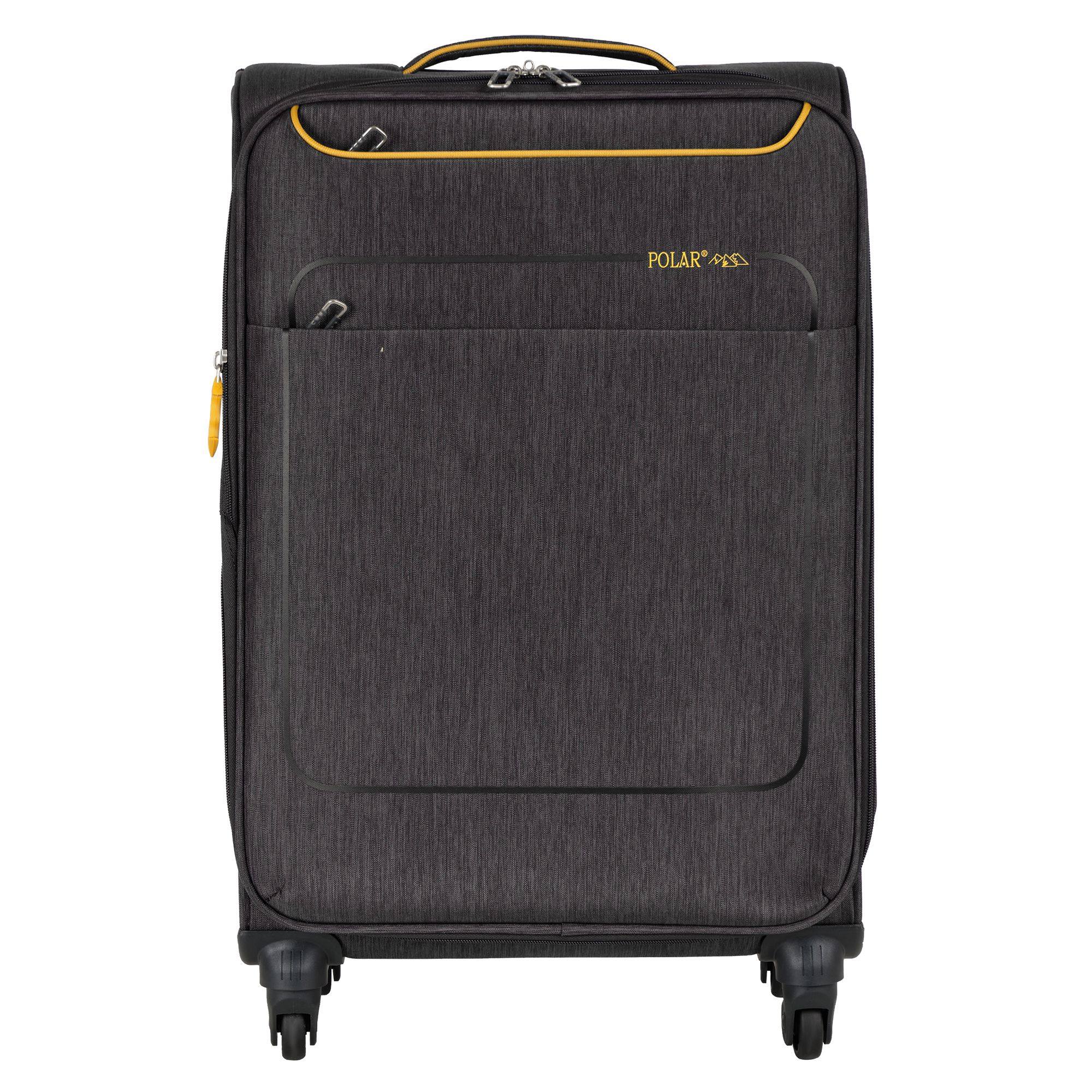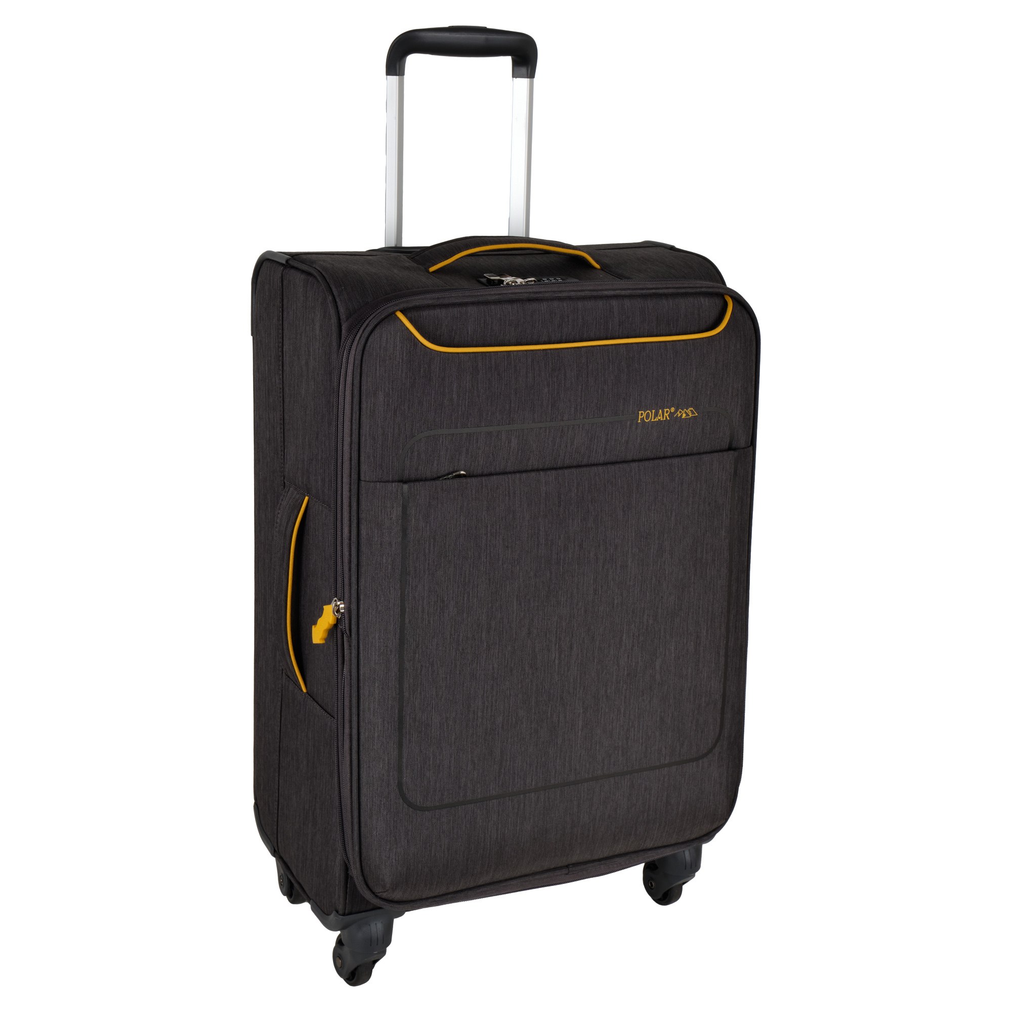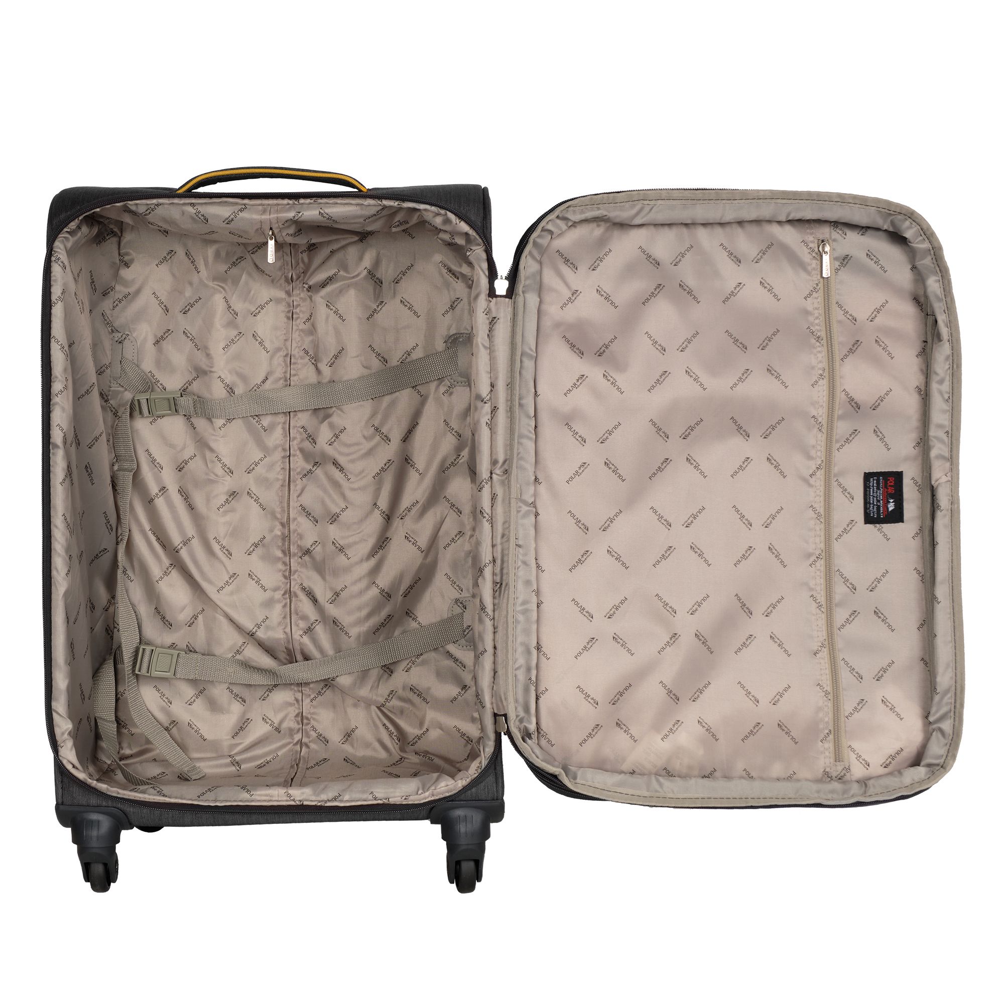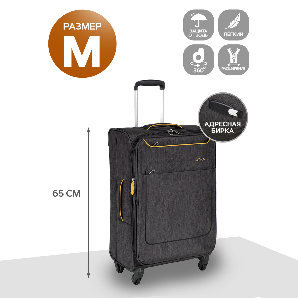 Средний чемодан фирмы Polar. Внутри имеются фиксирующие ремни и карман на молнии. Основное отделение можно увеличить в объеме, расстегнув молнию, при этом чемодан увеличивается в глубину на 5 см. Максимальный объем при увеличении 76.5 л.. Ручка выдвигается в два сложения до 40 см, Ручка расположена внутри корпуса чемодана, что способствует ее защите при погрузке чемодана. Снаружи на передней стенке — два больших кармана на молнии. Надежные четыре колеса на подшипниках, вращаются на 360° градусов. У чемодана встроенный TSA кодовый замок.
