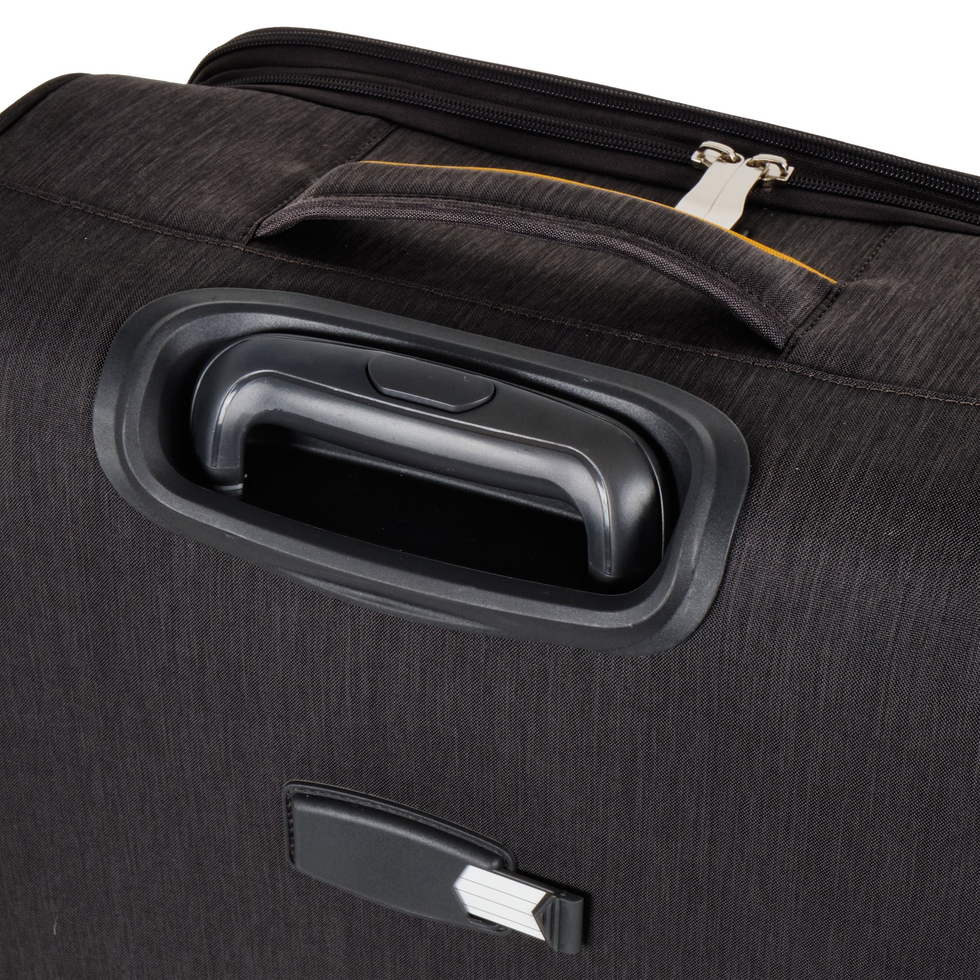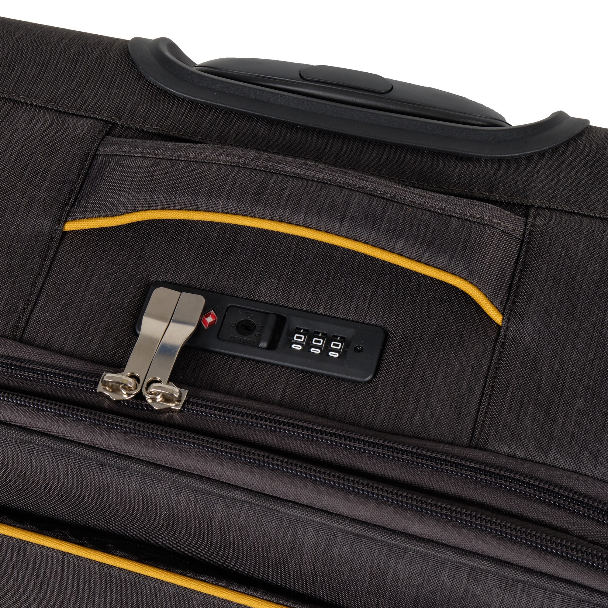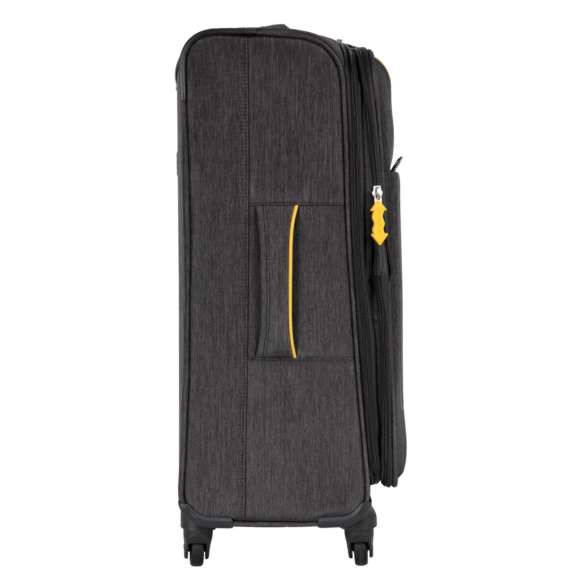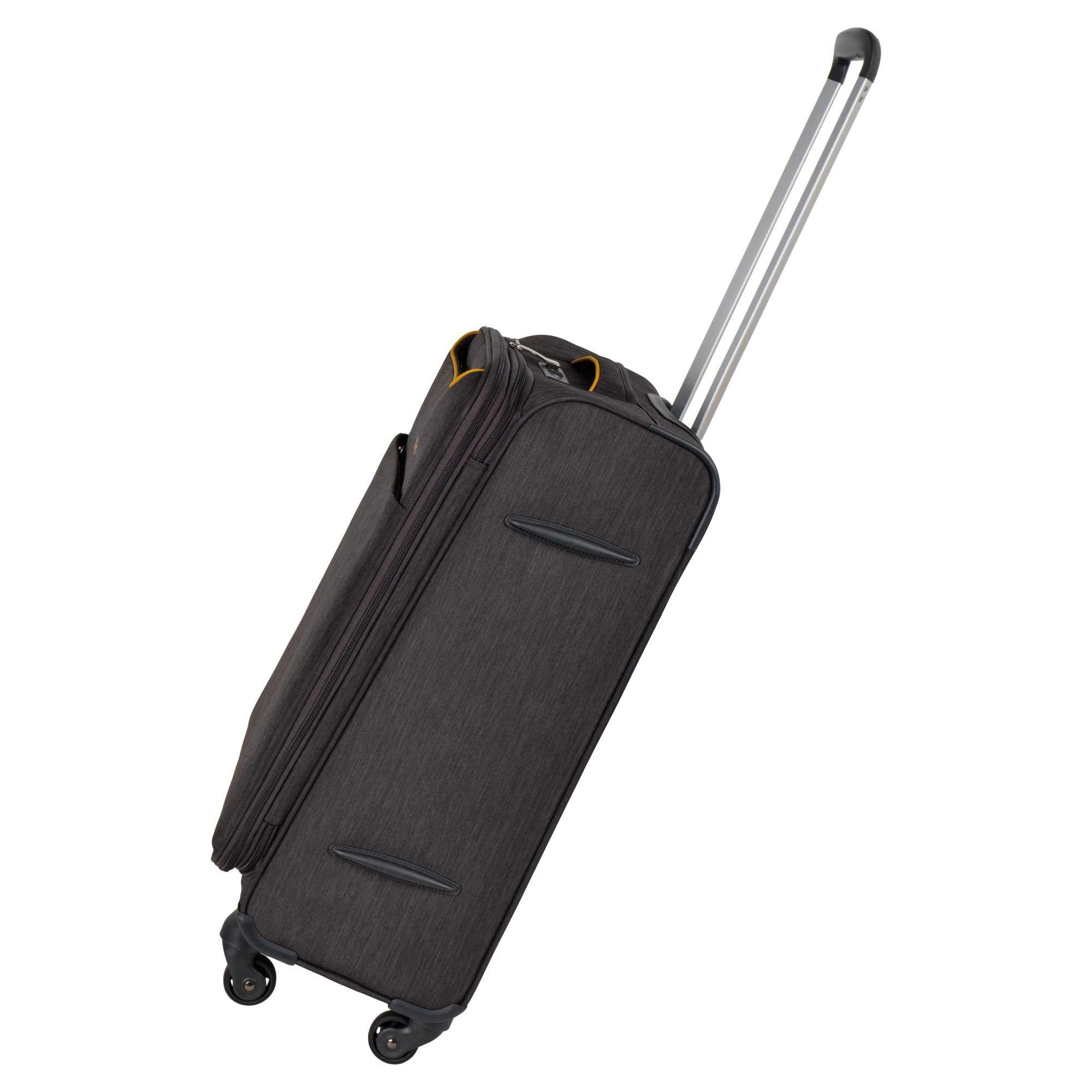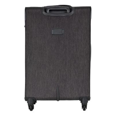 Средний чемодан фирмы Polar. Внутри имеются фиксирующие ремни и карман на молнии. Основное отделение можно увеличить в объеме, расстегнув молнию, при этом чемодан увеличивается в глубину на 5 см. Максимальный объем при увеличении 76.5 л.. Ручка выдвигается в два сложения до 40 см, Ручка расположена внутри корпуса чемодана, что способствует ее защите при погрузке чемодана. Снаружи на передней стенке — два больших кармана на молнии. Надежные четыре колеса на подшипниках, вращаются на 360° градусов. У чемодана встроенный TSA кодовый замок.