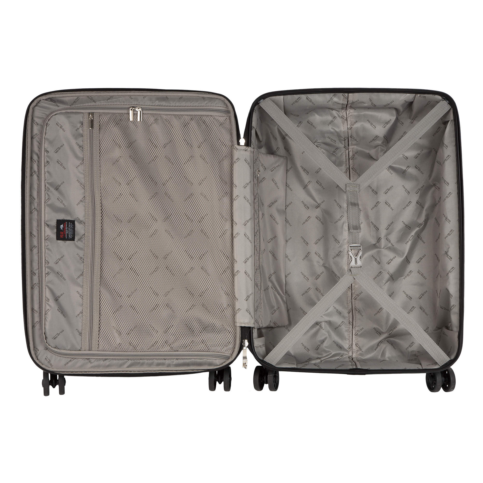 Средний пластиковый чемодан Спиннер 24". Основное отделение разделено на две части. Одно имеет фиксирующие ремни, второе на молнии. Выдвигающаяся ручка расположена внутри корпуса чемодана, что способствует большей прочности и защите от ударов при разгрузке/погрузке чемодана. Выдвигающаяся ручка фиксируется в двух положениях. Чемодан увеличивается в объеме за счет раздвижения молнии. Есть встроенный кодовый замок с таможенным ключом TSA. Надежные 4 колеса диаметром 4.8 см.