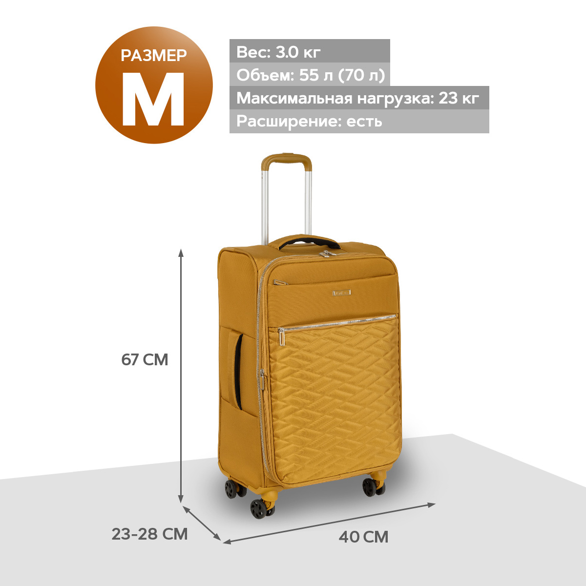 Внутри- основное отделение с прижимными ремнями и карман на молнии. На передней стенке глубокий карман на молнии. Чемодан закрывается на надежную молнию, на бегунках есть отверстия для кодового замка. Кодовый замок в комплект не входит. Основное отделение можно увеличить в объеме, расстегнув молнию с прямоугольным бегунком , при этом чемодан увеличивается в глубину на 5 см.