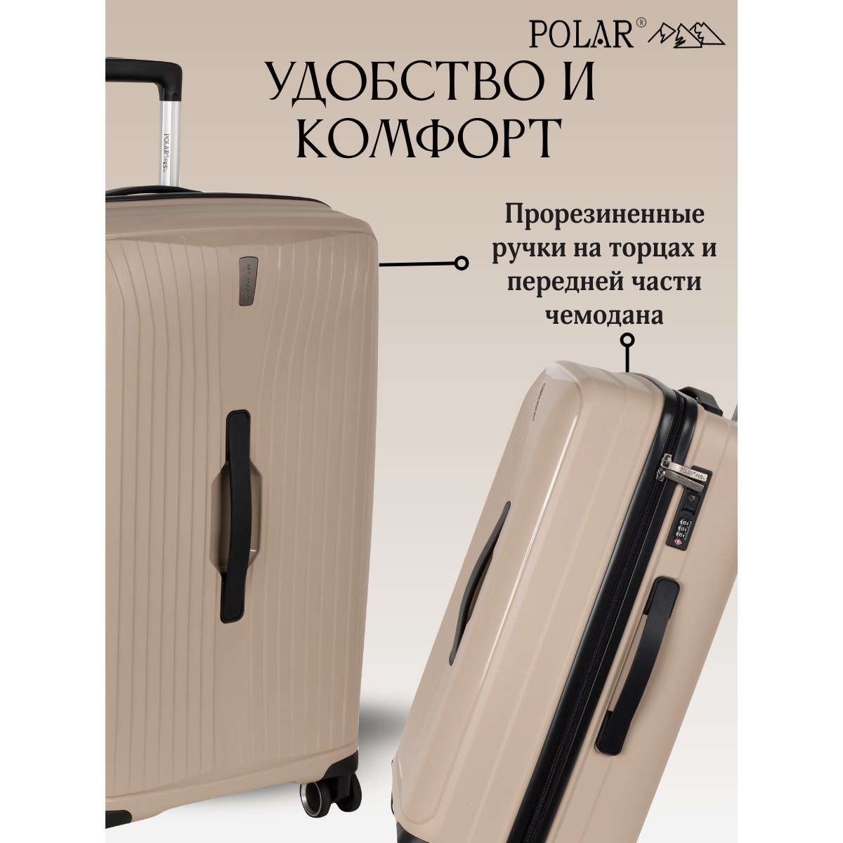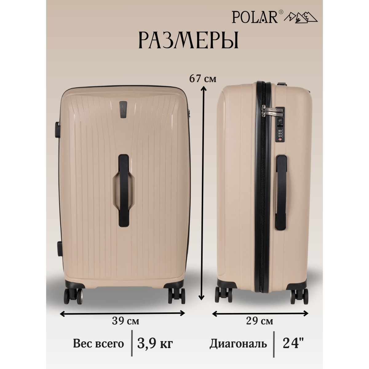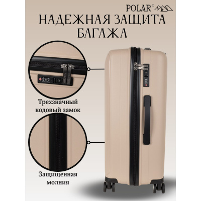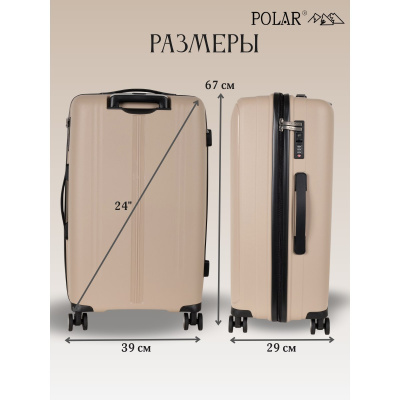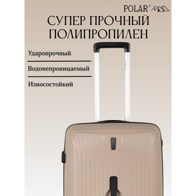 Чемодан малый фирмы POLAR, размер М, выполнен из PP (полипропилен). Основное отделение разделено на две части. Одно имеет фиксирующие ремни, второе на молнии. Выдвигающаяся ручка расположена внутри корпуса чемодана, что способствует большей прочности и защите от ударов при разгрузке/погрузке чемодана. Выдвигающаяся ручка фиксируется в трех положениях. Есть кодовый замок. Надежные 4 колеса.