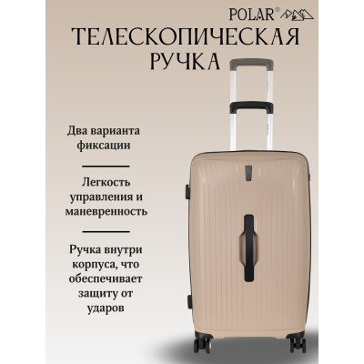 Чемодан малый фирмы POLAR, размер М, выполнен из PP (полипропилен). Основное отделение разделено на две части. Одно имеет фиксирующие ремни, второе на молнии. Выдвигающаяся ручка расположена внутри корпуса чемодана, что способствует большей прочности и защите от ударов при разгрузке/погрузке чемодана. Выдвигающаяся ручка фиксируется в трех положениях. Есть кодовый замок. Надежные 4 колеса.