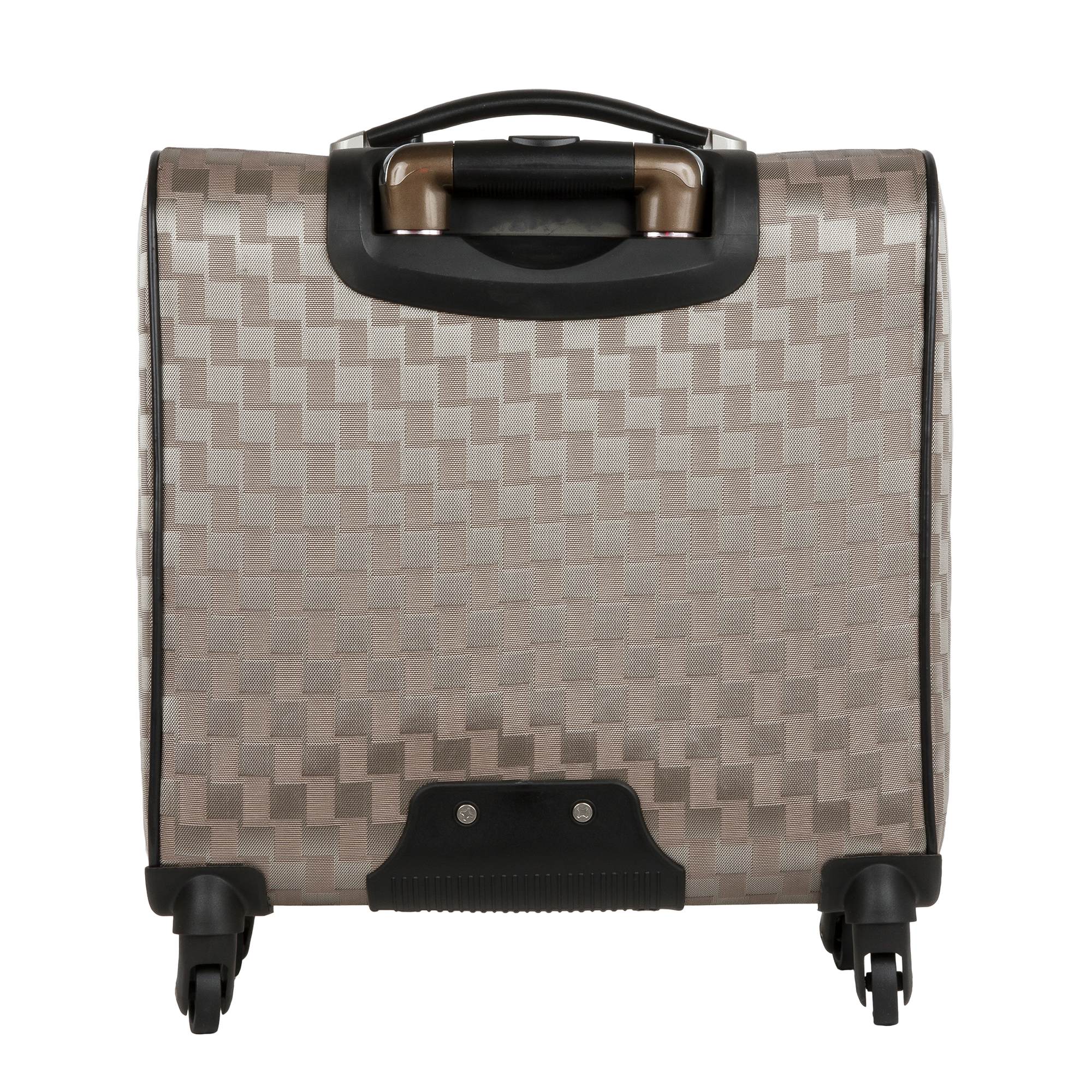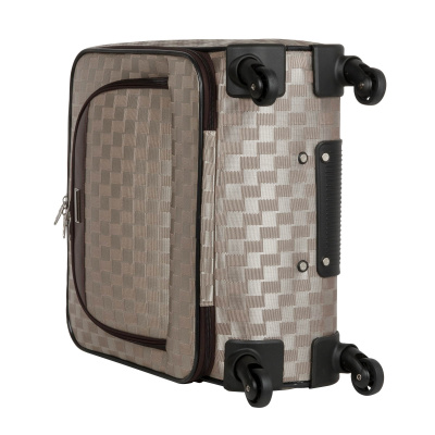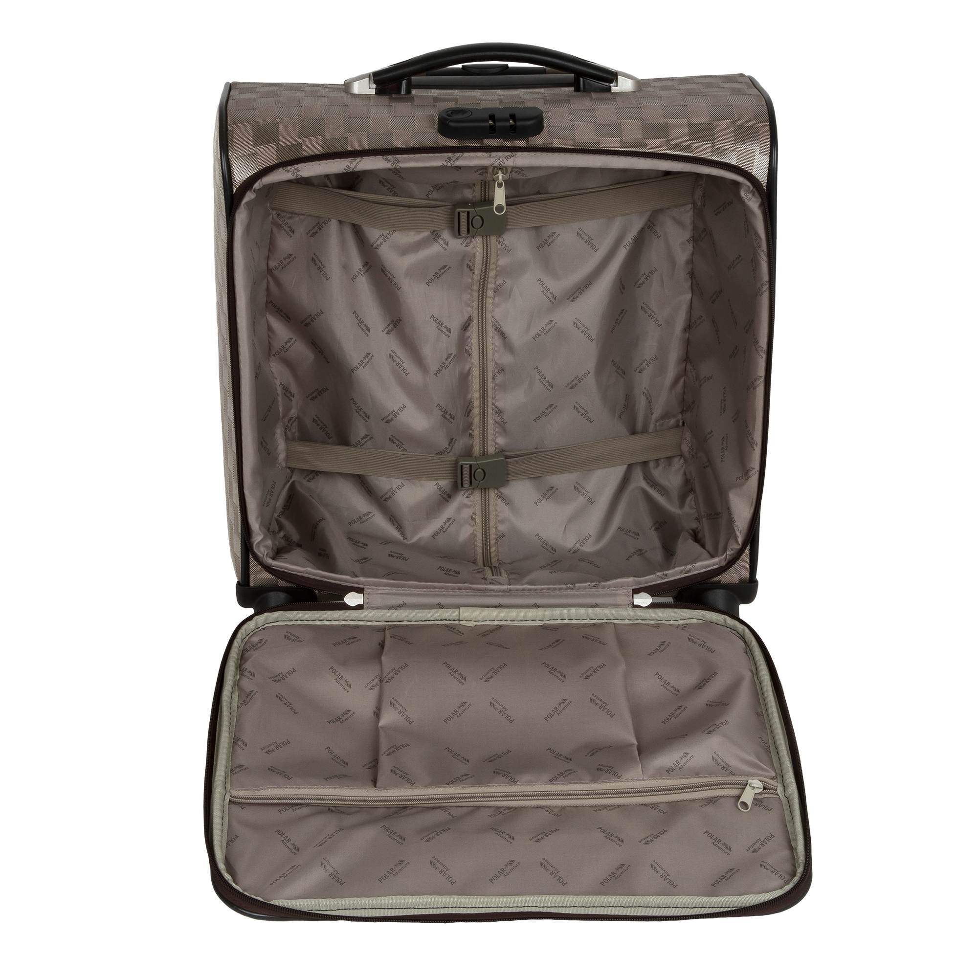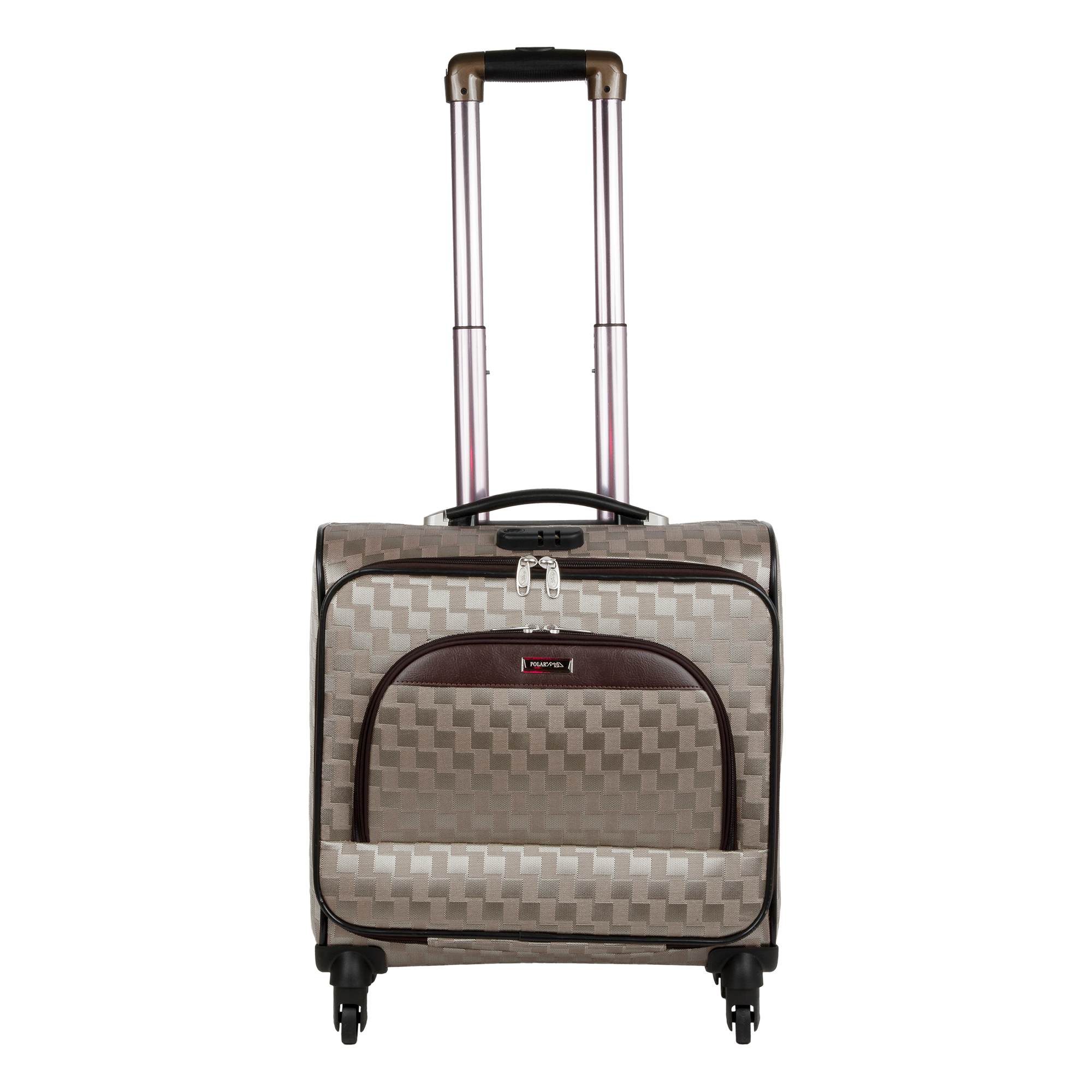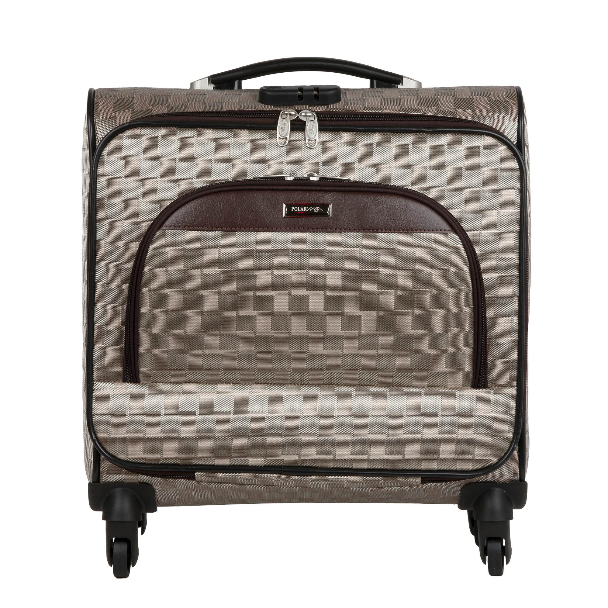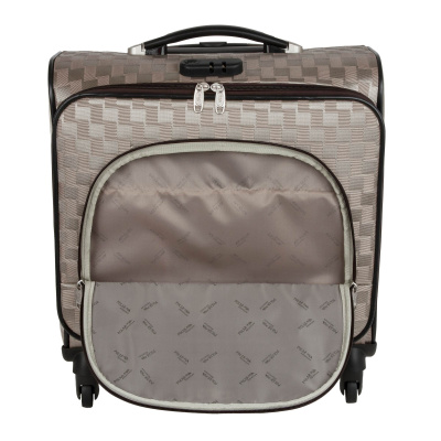 Кейс-пилот от компании "Polar" на четырёх колёсах выполнен из прочного материала (нейлона и полиэстера). Чемодан закрывается на молнию, присутствует также встроенный кодовый замок.Внутри есть одно большое отделение , в котором присутствуют ремни для фиксации вещей и маленький карман на молнии для документов. Снаружи расположен объёмный карман на молнии для мелких вещей. У чемодана есть небольшая ручка для переноски и металлическая ручка, которая выдвигается на 30см.