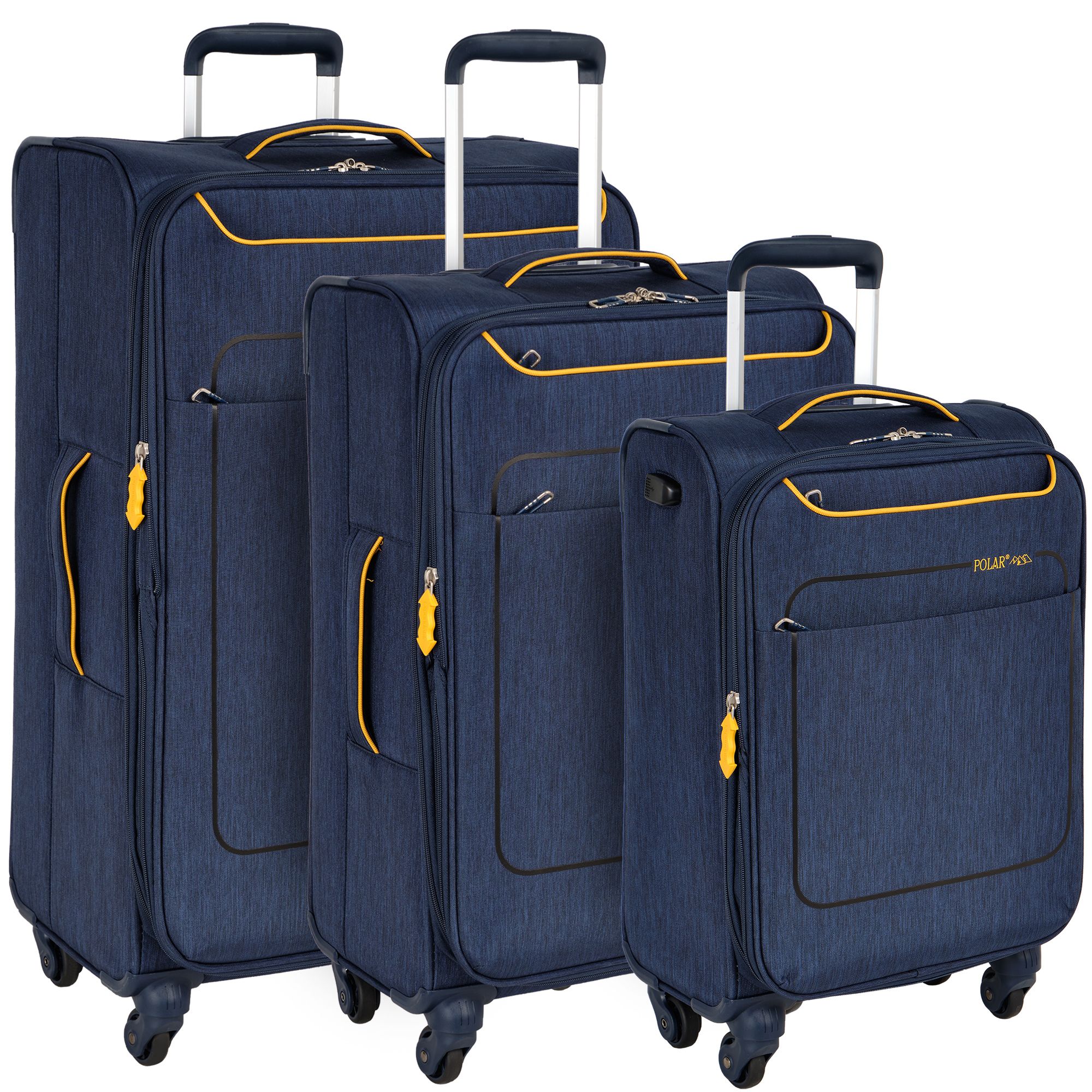 Комплект из трёх суперлегких четырёхколёсных чемоданов POLAR. Основное отделение чемоданов закрывается на молнию. Впереди два кармана и боковой карман на молнии. Четырёхколёсный чемодан более маневренный и удобный по сравнению с двухколёсным - 4 колеса вращаются на 360 градусов.