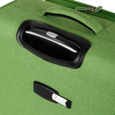 Стильный чемодан модной расцветки имеет в наличии две ручки для переноски сбоку и сверху чемодана, а также выдвижную ручку- тележку.