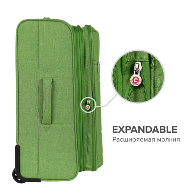 Чемодан закрывается на надежную молнию, на бегунках есть отверстия для кодового замка. Кодовый замок в комплект не входит. Основное отделение можно увеличить в объеме, расстегнув молнию с круглым бегунком (на бегунке подсказка – expandable – расширение), при этом чемодан увеличивается в глубину на 5 см.