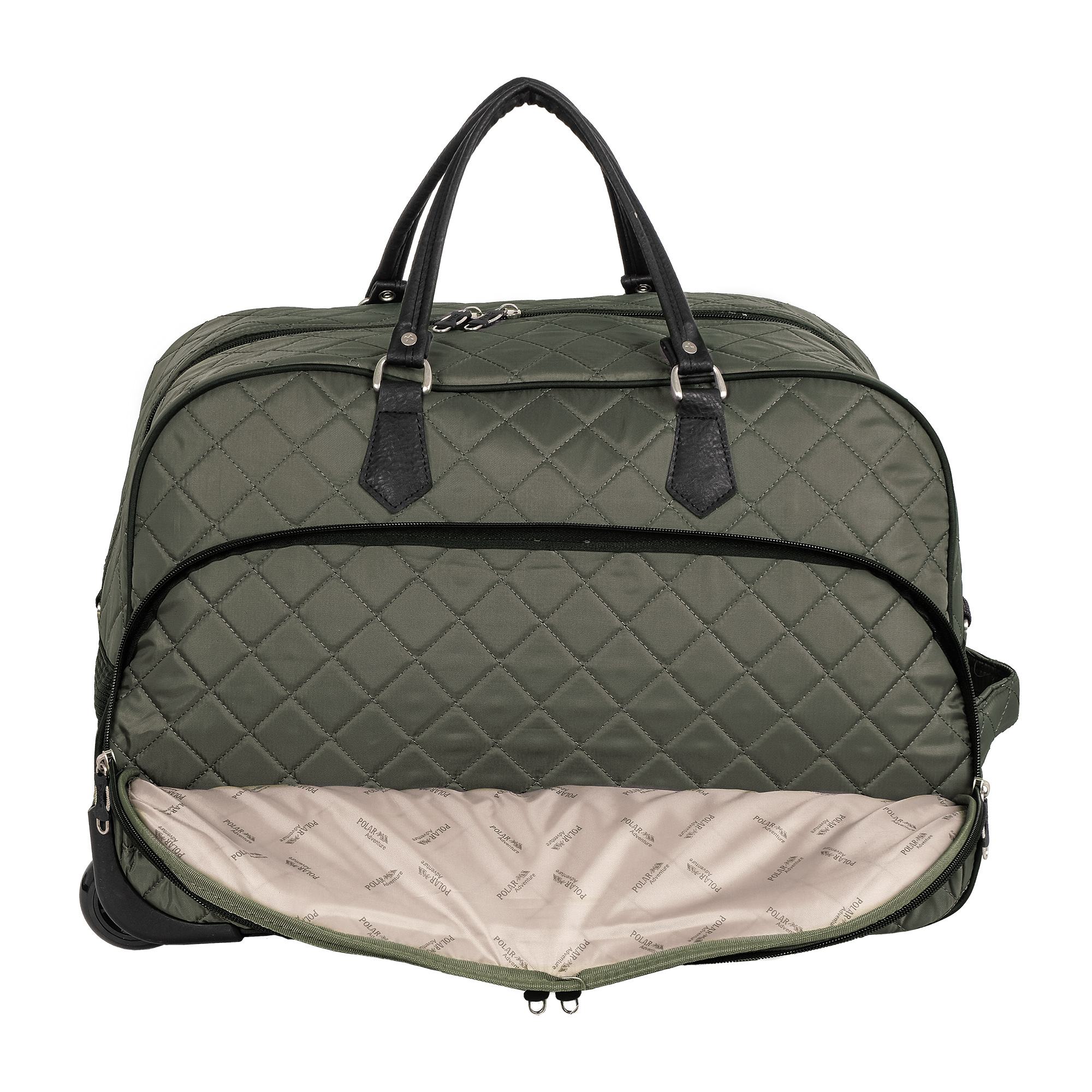 Колесная дорожная сумка Polar. Пластиковые колеса, выдвижная ручка ,выдвигается на 38 см. Имеется съемный плечевой ремень, что бы носить сумку через плечо. Внутри одно большое отделение и один карман сетка для ваших вещей. Два кармана спереди сумки на молнии. Высота ручек 17 см.