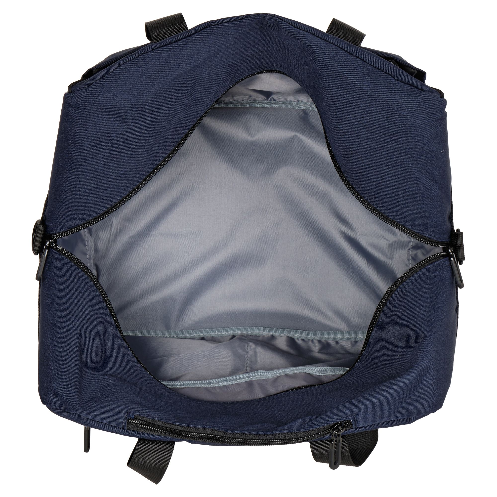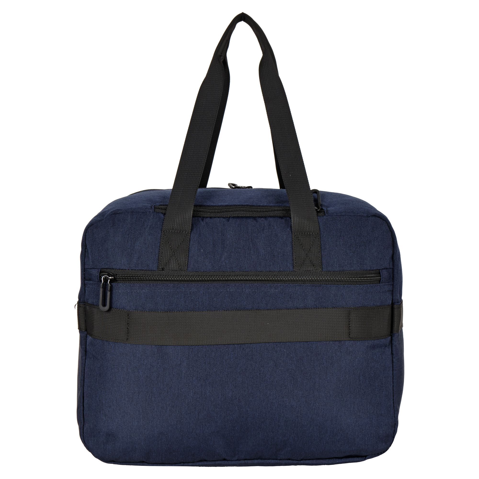 Модель имеет одно основное отделение свободного назначения, внутри карман органайзер, которое закрывается на молнию. Спереди и сзади большие карманы на молнии. У сумки есть две ручки для переноски в руке высотой 27 см и длинный отстегивающийся ремень 123 см, который регулируется по длине. Есть ремень для крепления на чемодан. На дне сумки пластиковые ножки, чтобы дно оставалось чистым.