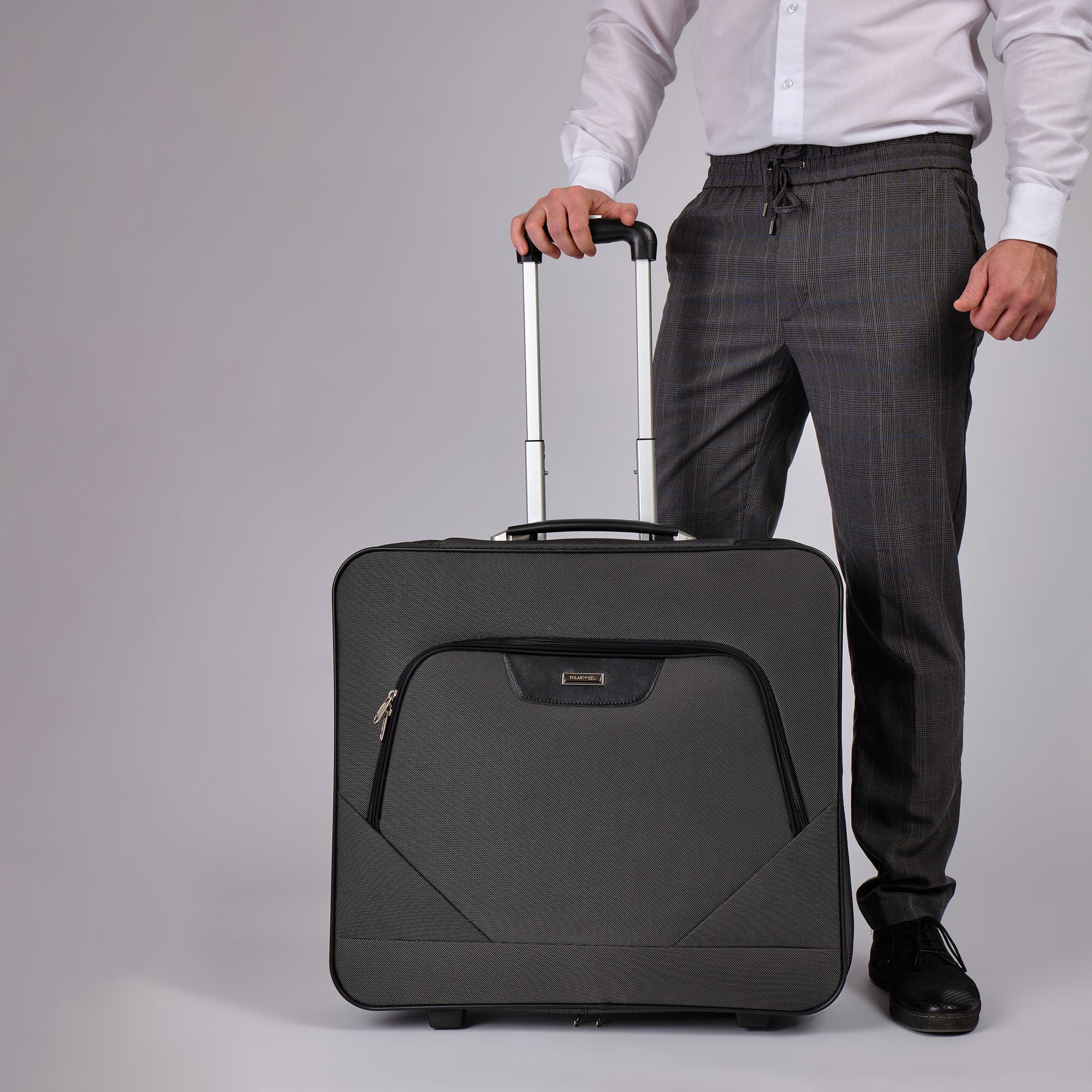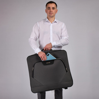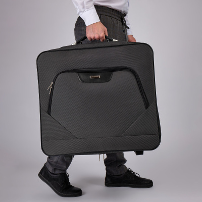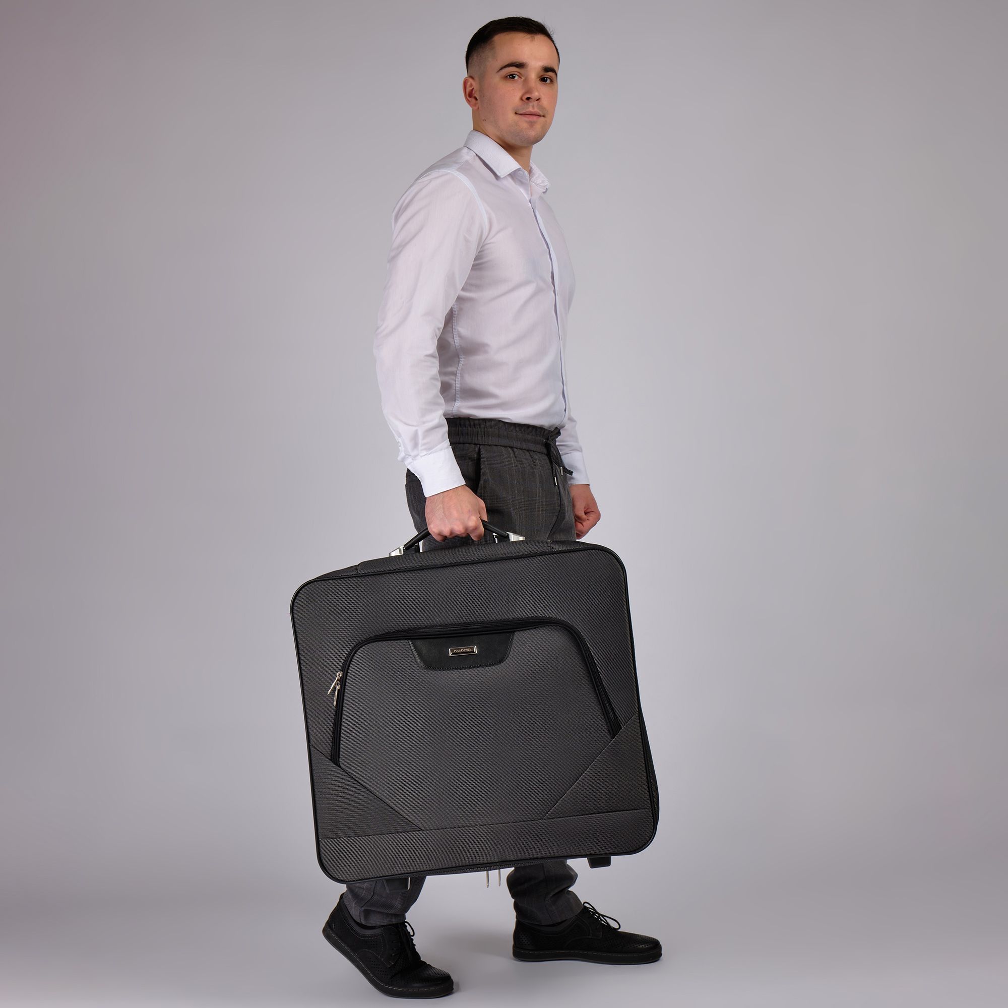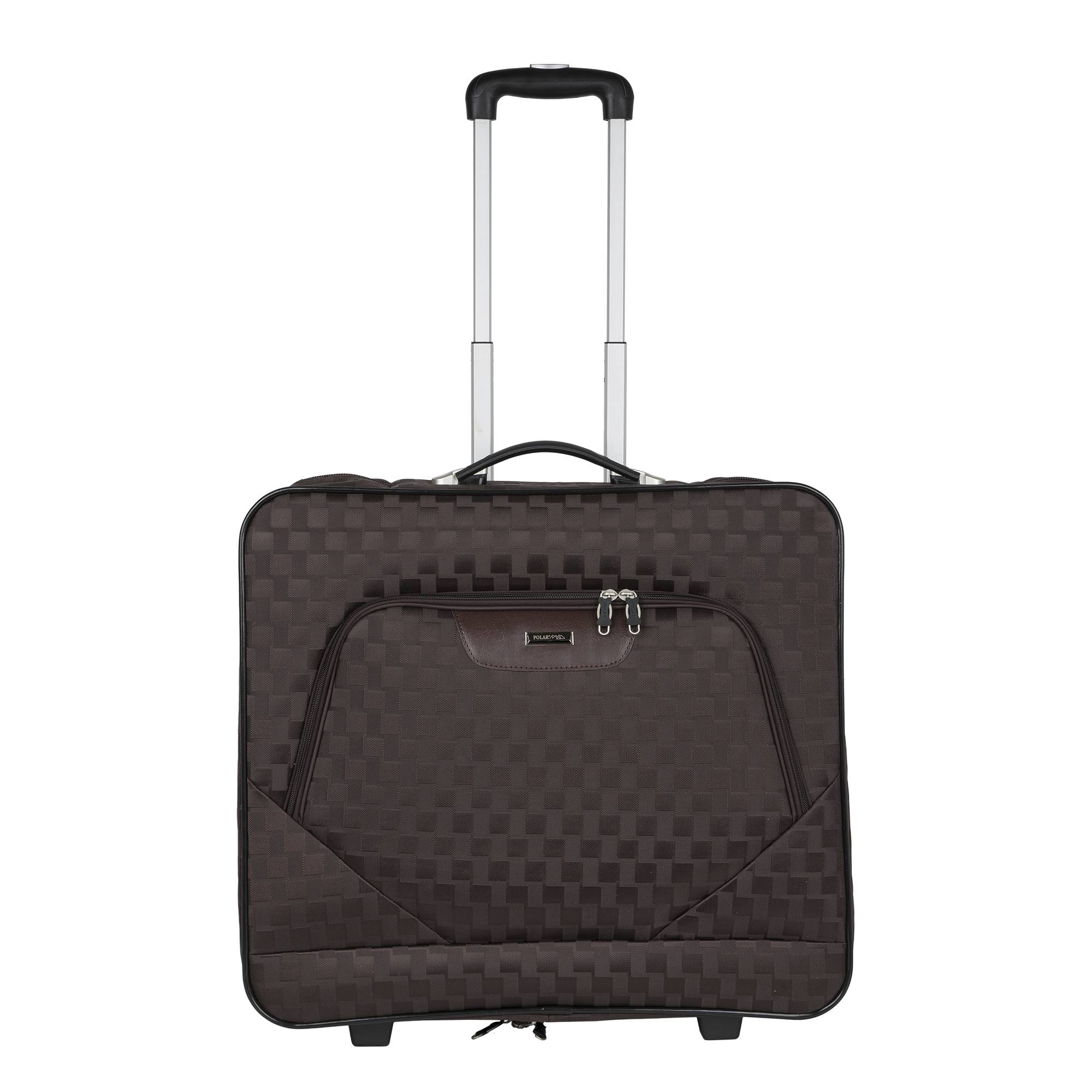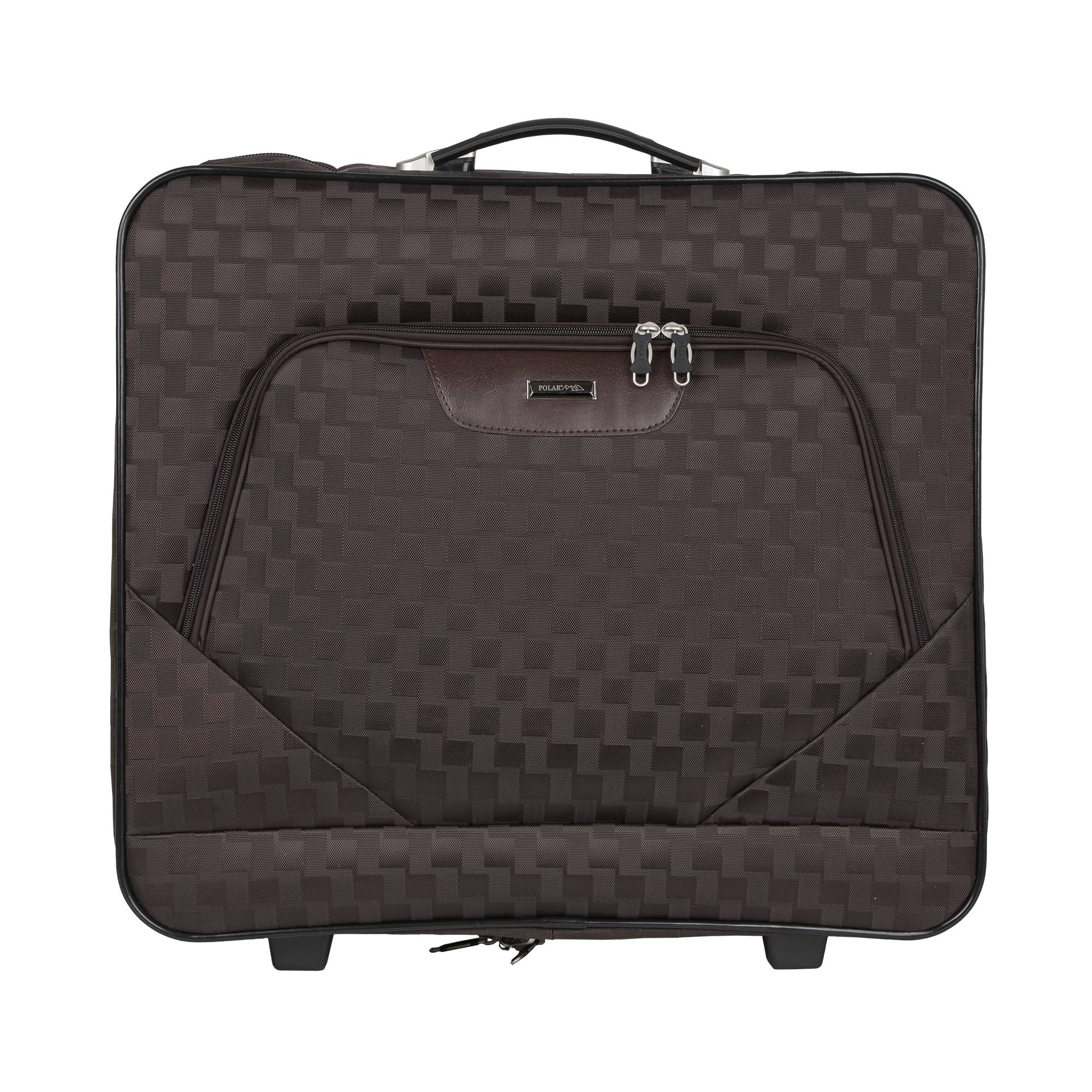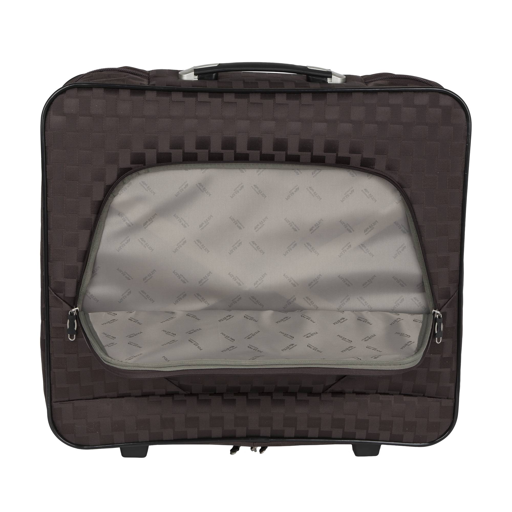 Портплед фирмы Polar на двух колёсах выполнен из полиэстера и предназначен для перевозки деловых костюмов в командировке. Портплед состоит из основного отделения в форме чехла , внутри основного отделения расположен фиксатор багажа. Снаружи, на передней части портпледа, имеется объёмный накладной карман на молнии. У портпледа есть две ручки (ручка для переноски и выдвижная ручка для перевозки, максимальная высота которой составляет 48см, а также крючок для хранения портпледа в шкафу).