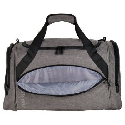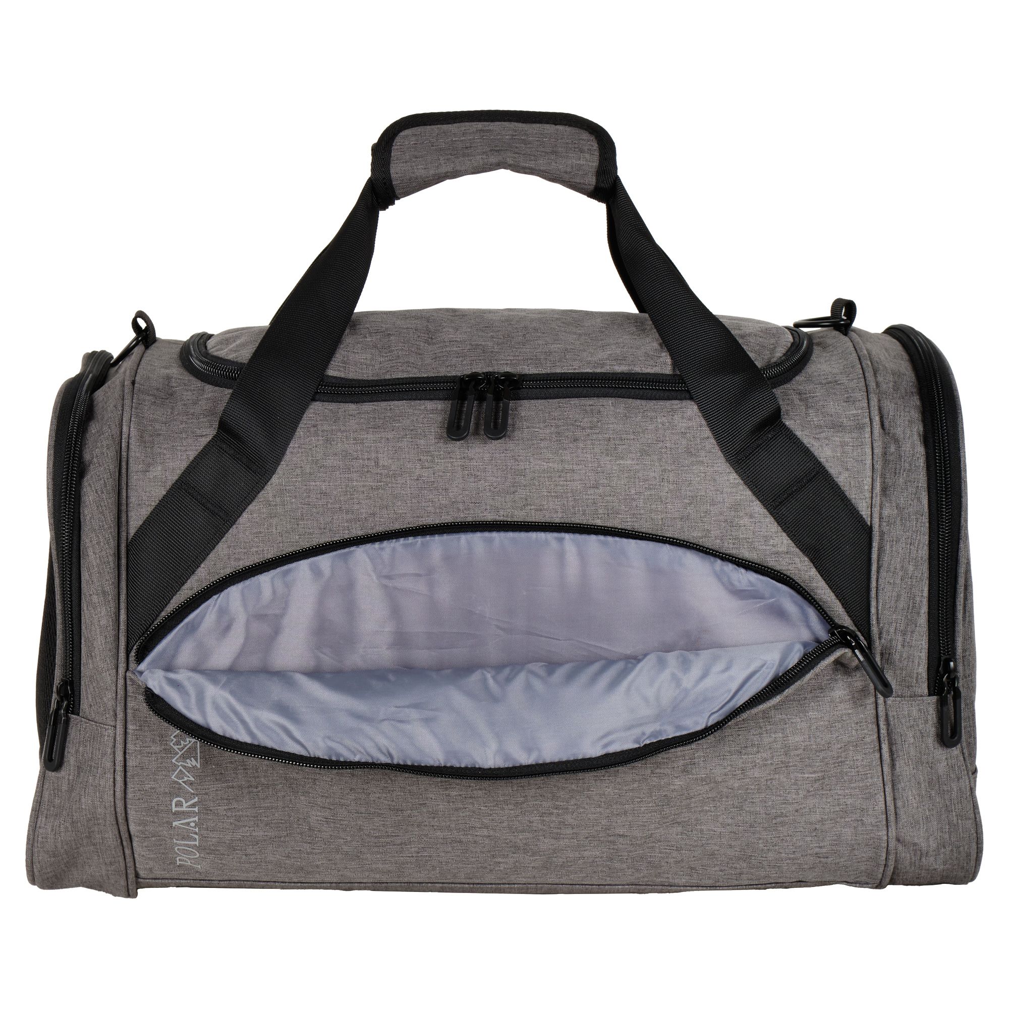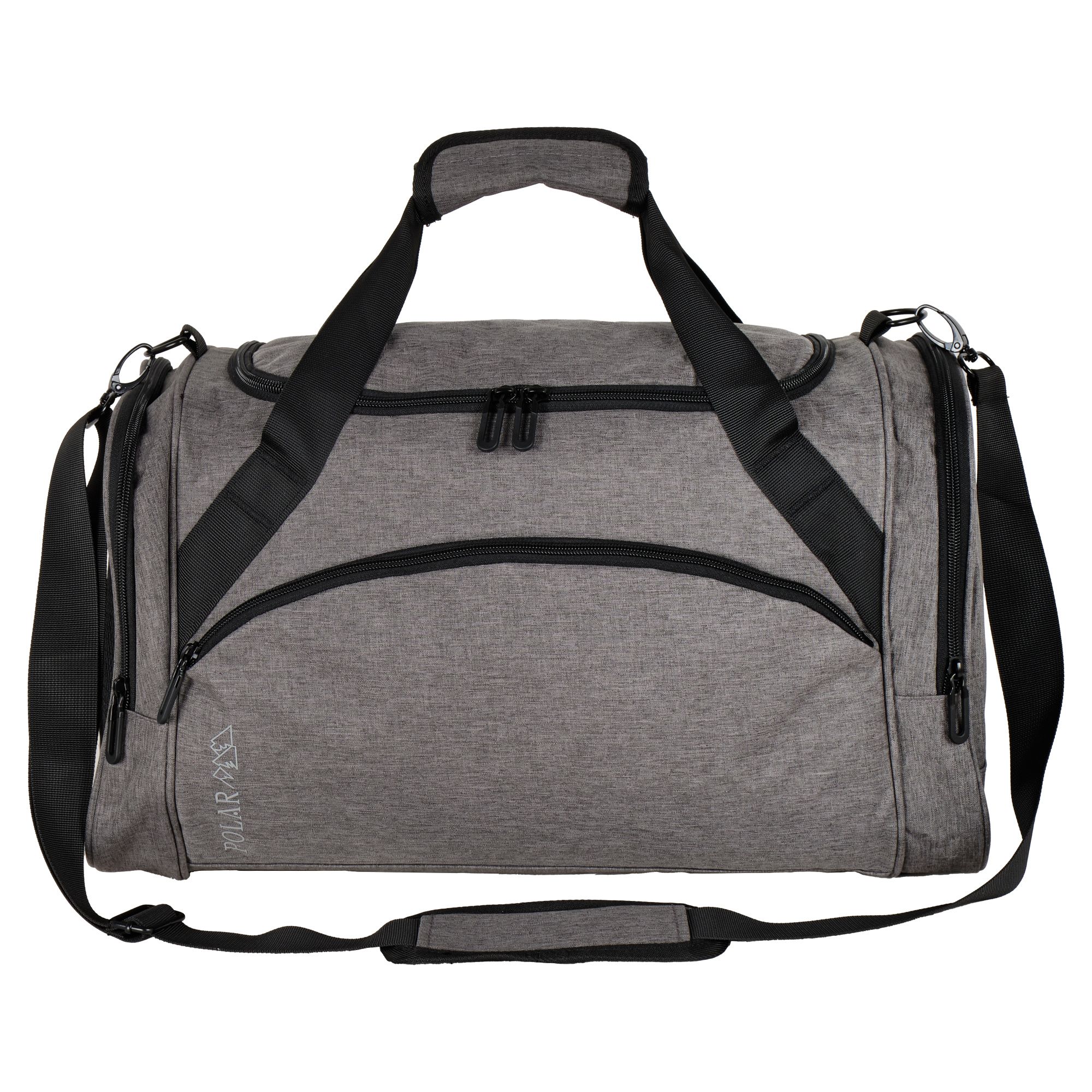 Очень легкая и удобная дорожная сумка фирмы Polar. Состоит из одного большого вместительного отделения, внутри карман на молнии. Спереди сумки карман на молнии и два боковых, один из них сетчатый карман для обуви. В дорожную сумку легко помещаются спортивная форма, обувь или вещи для поездки. Сумку удобно носить через плечо длина ремня 142 см. Высота ручек 17 см. На дне сумки пластиковые ножки, чтобы дно оставалось чистым.