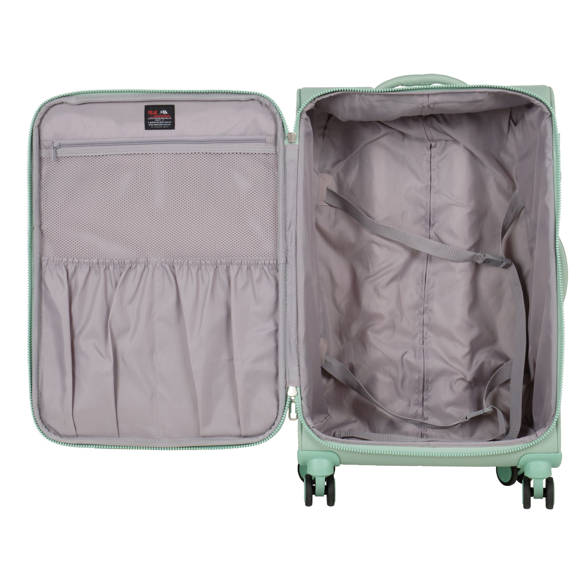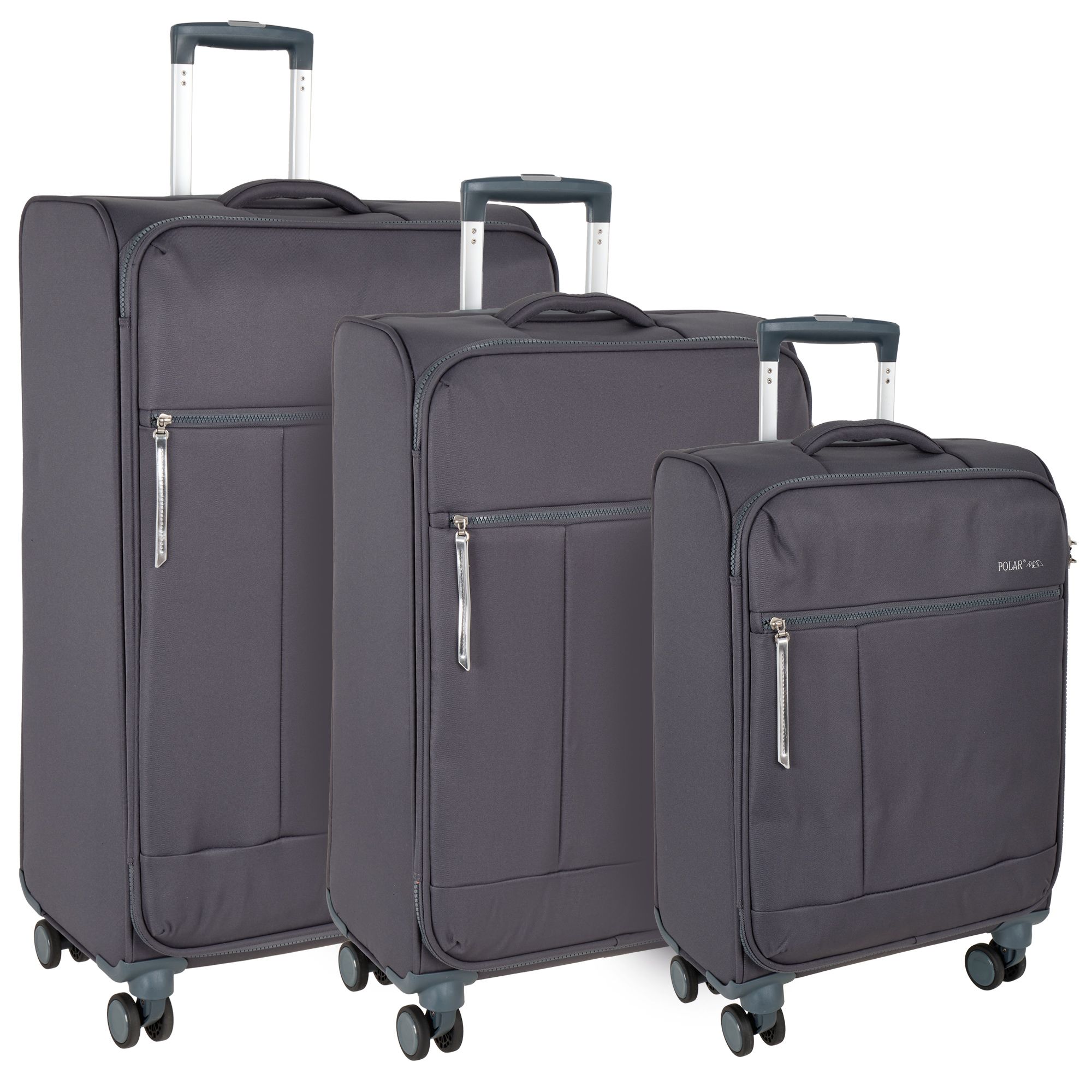 Комплект из трех облегченных чемоданов фирмы Polar с отделкой колес, тележки, молнии в цвете. Чемоданы закрываются по периметру на двухстороннюю широкую молнию. Сверху удобная ручка. Бесшумные и прочные двойные вращающиеся колеса 360 градусов для легкого перемещения и хорошей балансировки. Встроенный кодовый замок TSA, снаружи на передней стенке вместительный карман на молнии. Выдвижная ручка, максимальная высота которой составляет 105 см.
