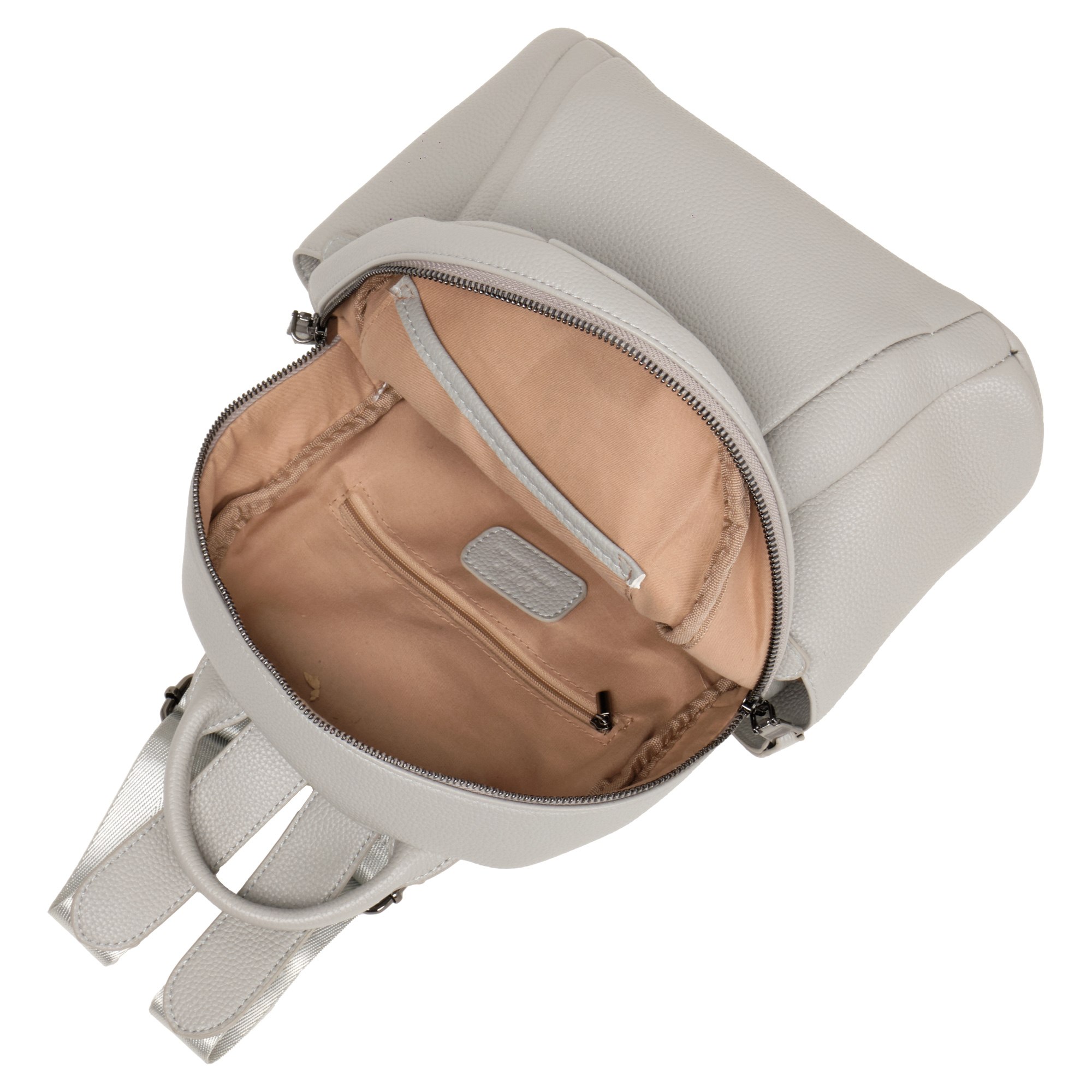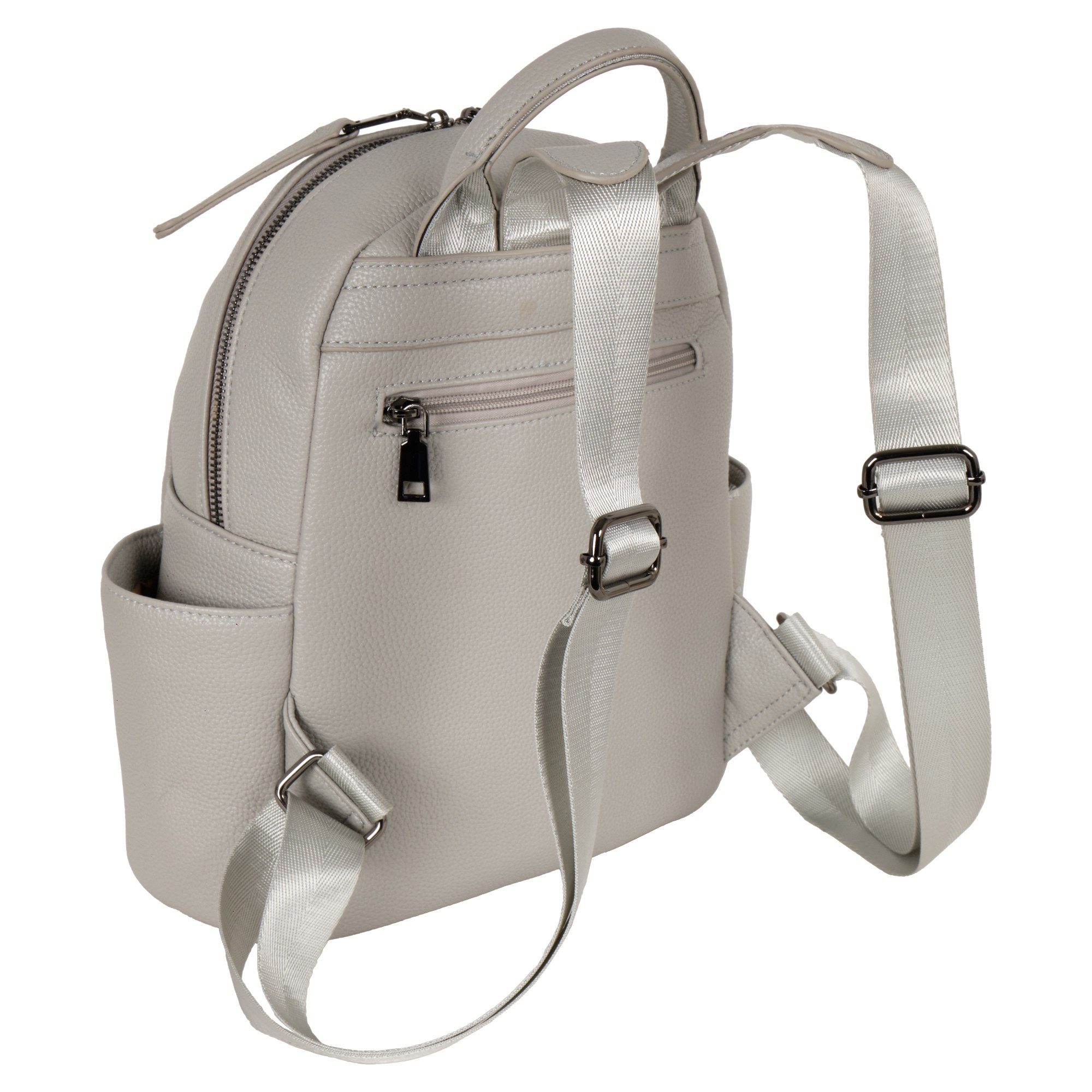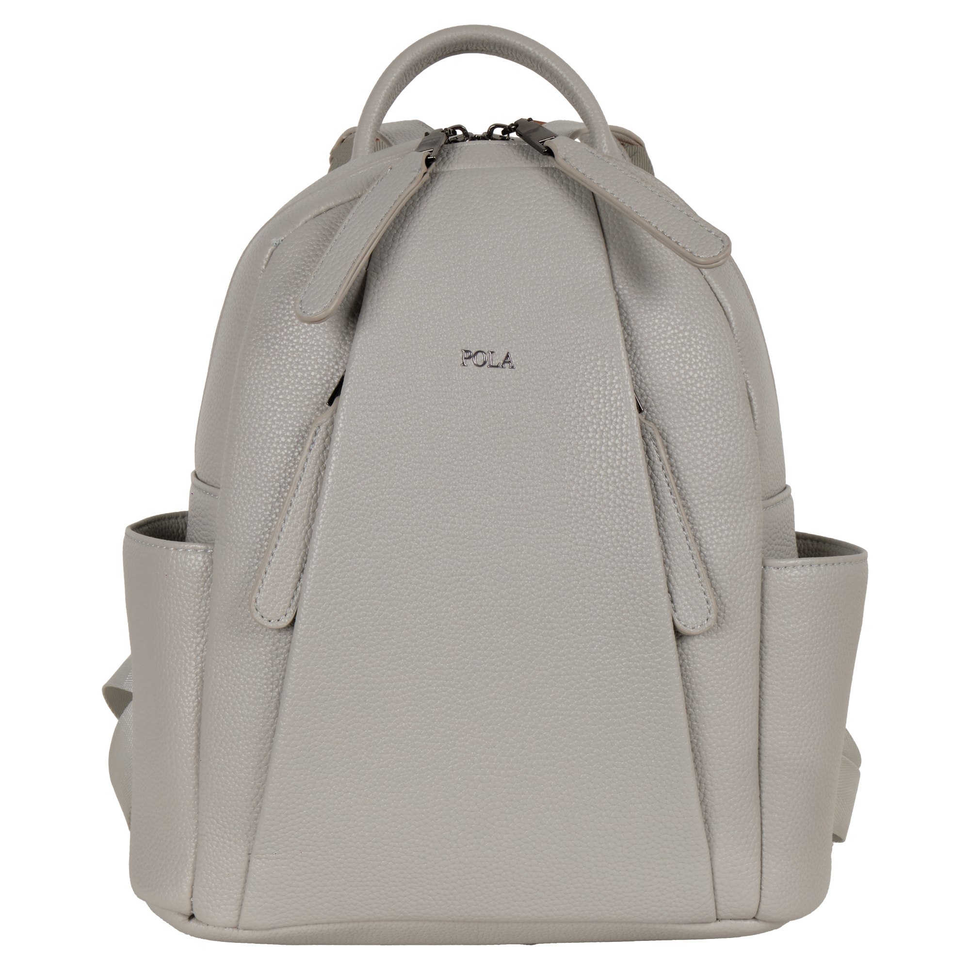 Женский рюкзак фирмы Pola изготовлен из экокожи. Модель отлично подойдет для повседневного ношения и прогулками с друзьями. Основное отделение закрывается на металлическую молнию. Внутри один карман на молнии для карточек, ключей и один открытый. На передней стенке рюкзака два накладных кармана на молнии, два открытых кармашка по бокам. Сзади небольшой карман на молнии. Высота ручки 9 см. Длина лямок 100 см. Цвет фурнитуры- темный никель.