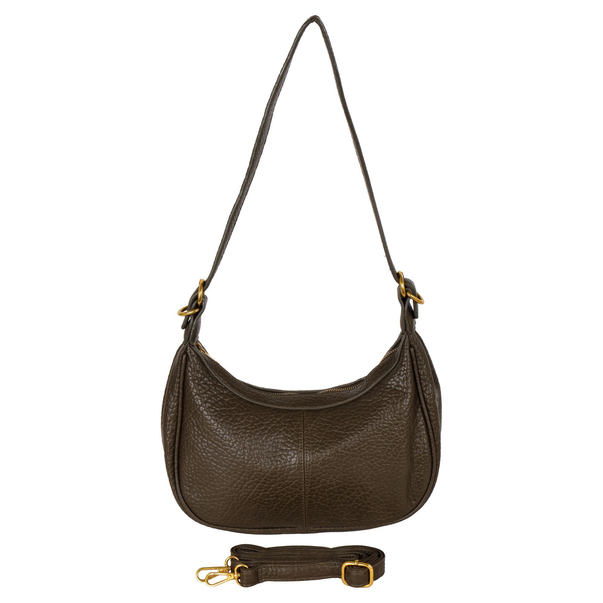 Стильная сумка фирмы POLA выполнена из экокожи. Сумка подойдёт как для выхода в театр, ресторан, так и для прогулки в будние дни в качестве повседневной сумки в виде полумесяца. Основное отделение закрывается на молнию. Внутри есть один карман на молнии и один открытый кармашек. У данной модели два варианта переноски, съемная ручка, высота 41 см и съемный, регулируемый ремешок из экокожи, высота 125 см. Цвет фурнитуры-золото.
