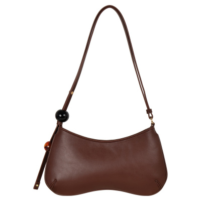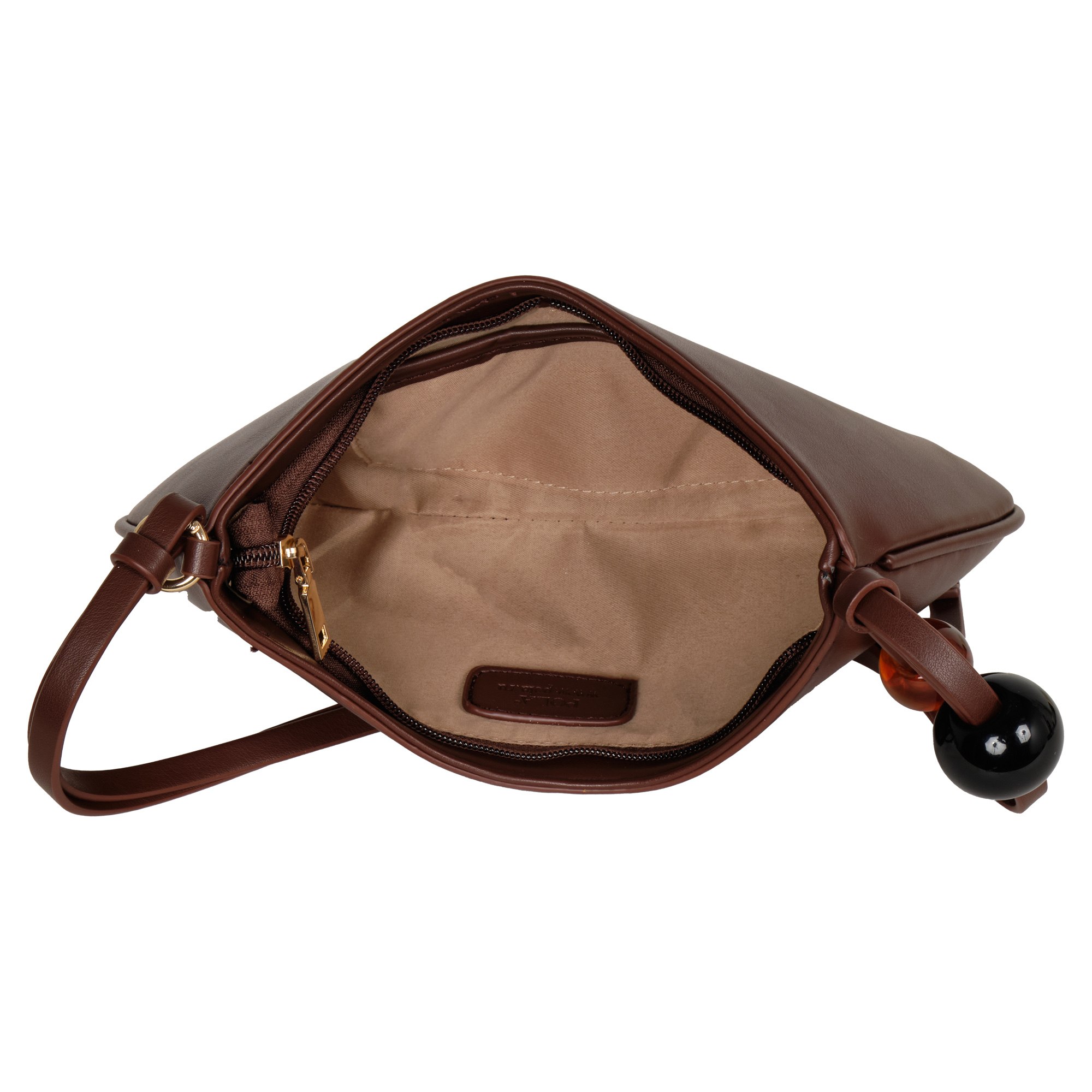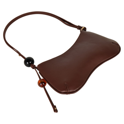 Небольшую сумку фирмы POLA выполнили из гладкой экокожи. Длину узкой двойной ручки, украшенной крупными круглыми бусинами, можно регулировать, поэтому аксессуар удобно носить и в руке, и на плече. Максимальная высота ручки 38 см. В основное отделение, закрывающееся молнией, поместятся смартфон, кошелек и ключи. Внутри один открытый кармашек. Цвет фурнитуры-золото.