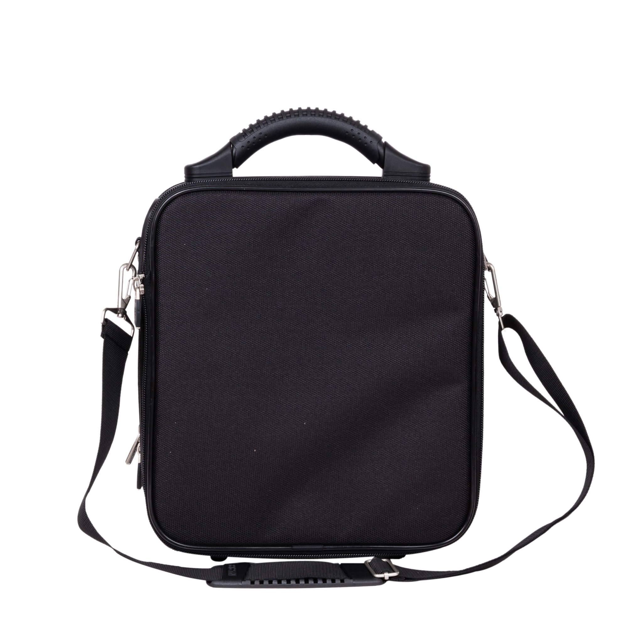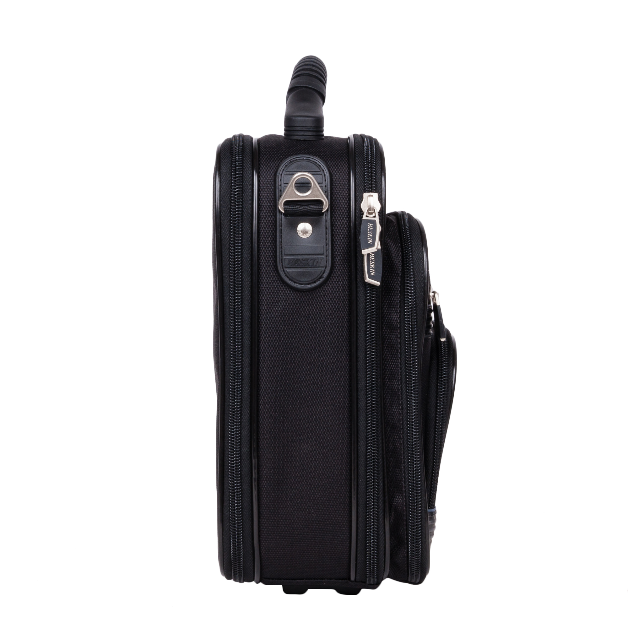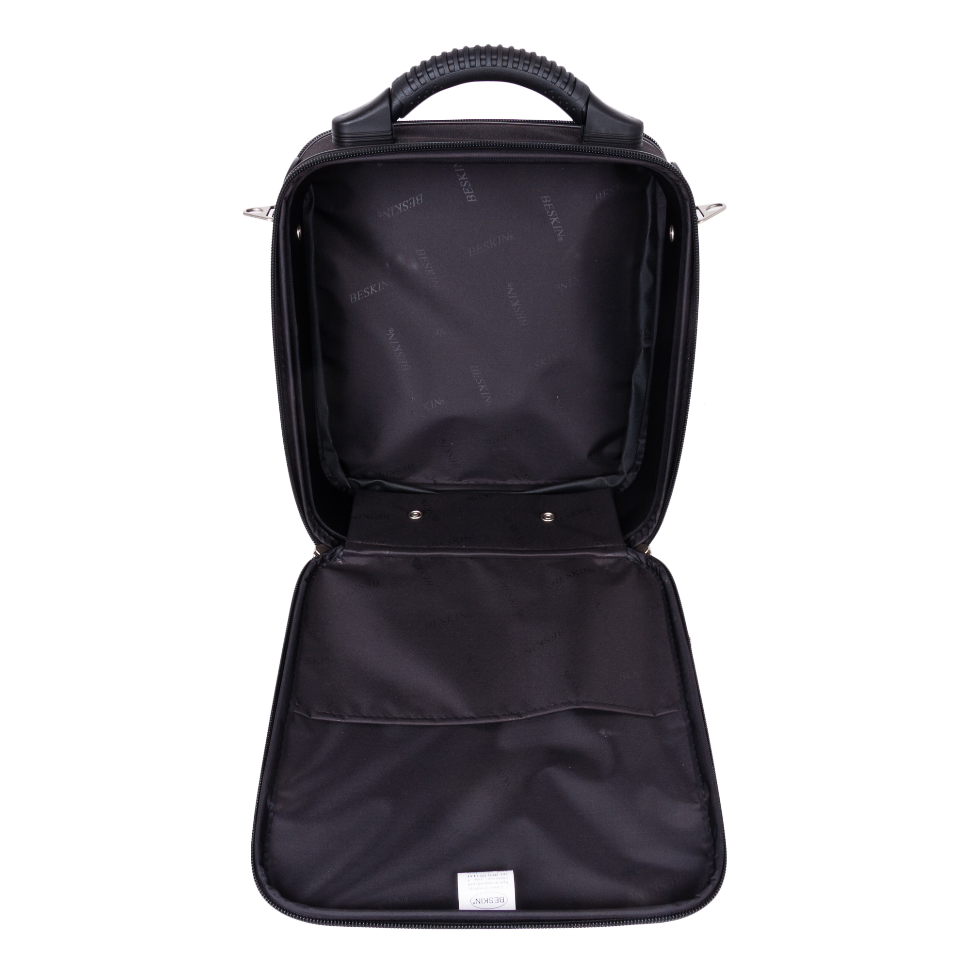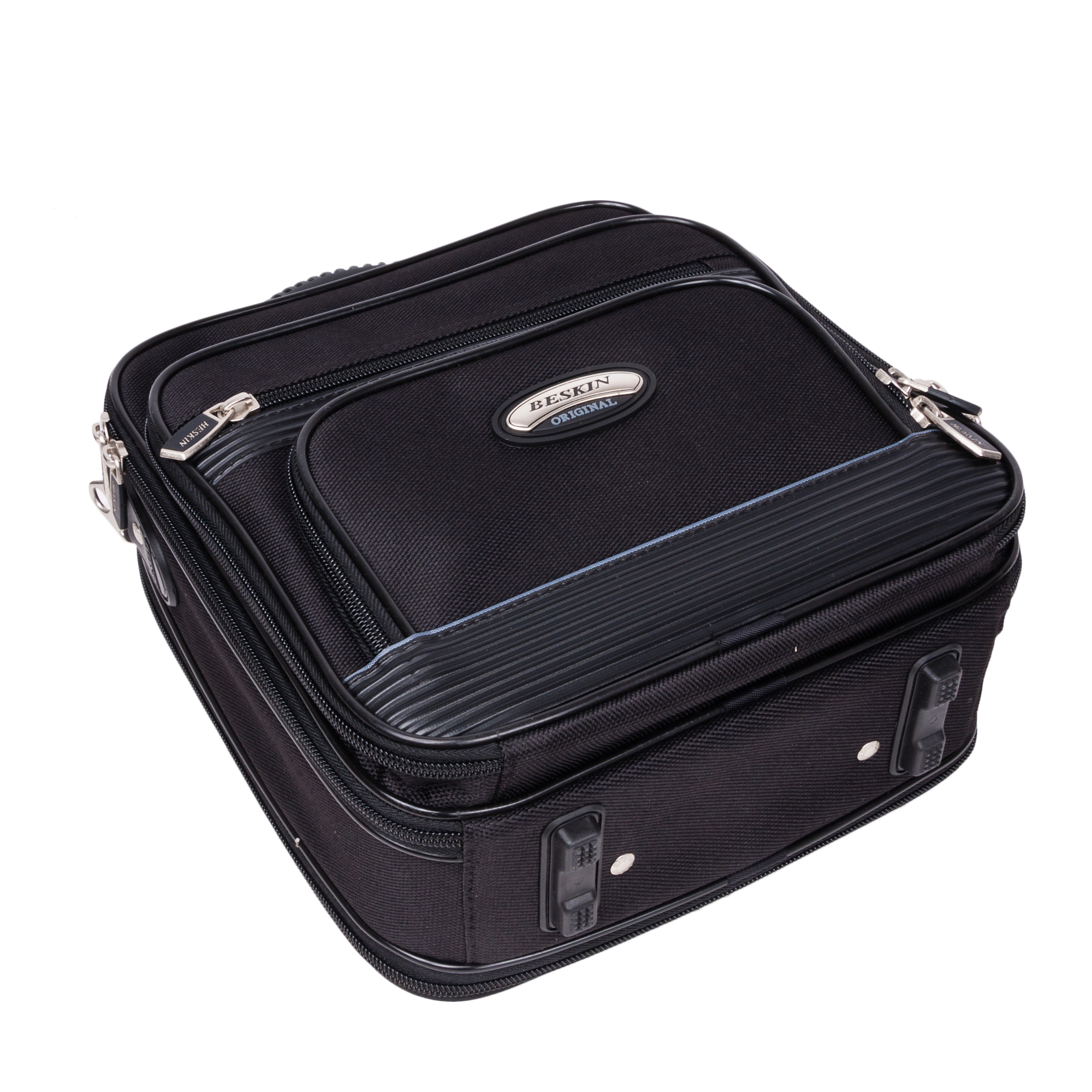 Каркасный кейс компании BESKIN. Внутри основного отделения расположен небольшой открытый карман. Спереди большой накладной карман на молнии, внутри которого открытые карманы для небольших предметов и канцелярии. На внешней стороне кармана два небольших кармана на молнии. Основное отделение можно увеличить на 5 см., расстегнув молнию по периметру. В комплекте съемный плечевой ремень.