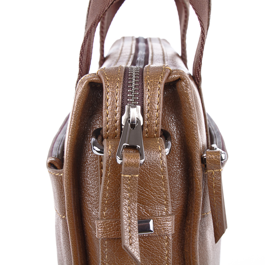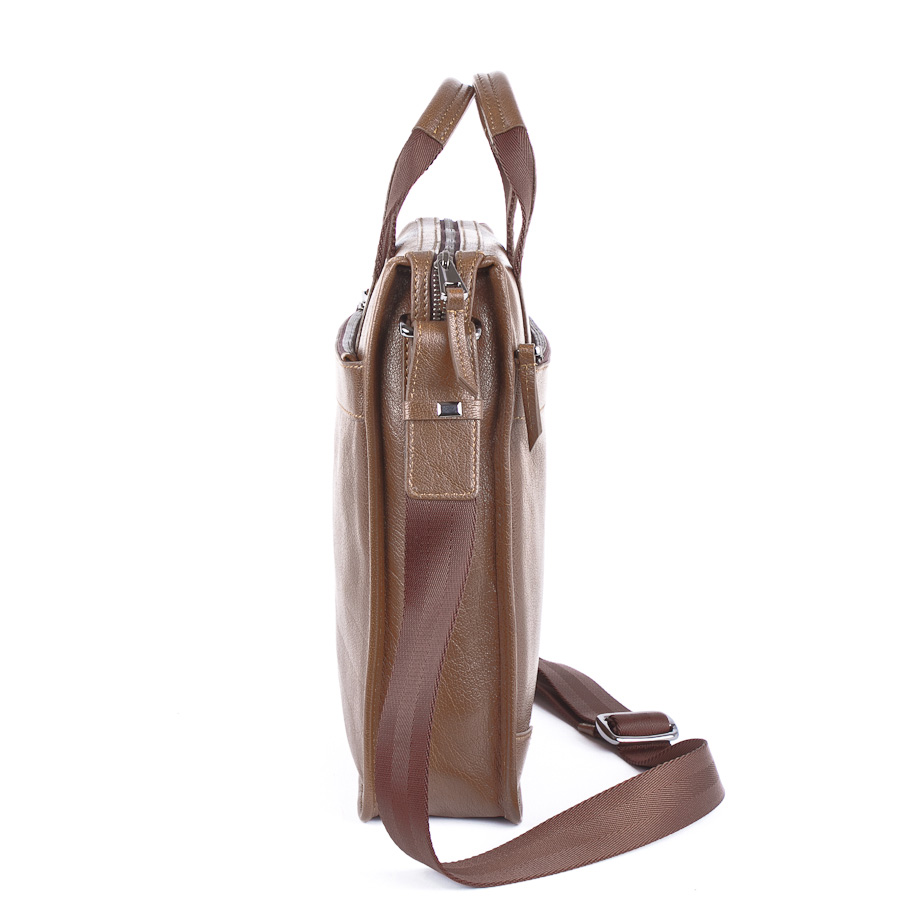 Сумка мужская кожаная Pola. Одно основное отделение на молнии и два на молнии впереди и сзади сумки. В основном отделении два дополнительных на молнии для ценных вещей и отделении для канцелярии. Имеется плечевой ремень из нейлона в сочетании с кожаными вставками.