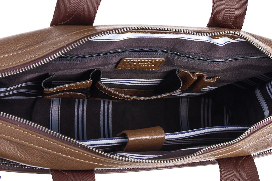 Сумка мужская кожаная Pola. Одно основное отделение на молнии и два на молнии впереди и сзади сумки. В основном отделении два дополнительных на молнии для ценных вещей, отделении для канцелярии и специальный карман для ноутбука или планшета, фиксирующийся на липучке. Имеется плечевой ремень из нейлона в сочетании с кожаными вставками.