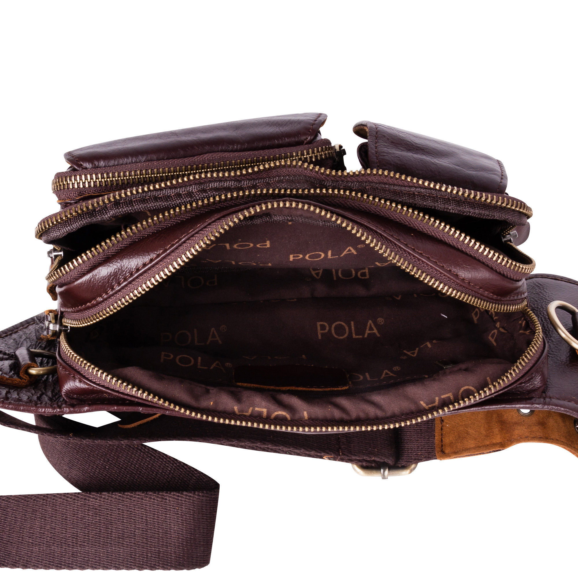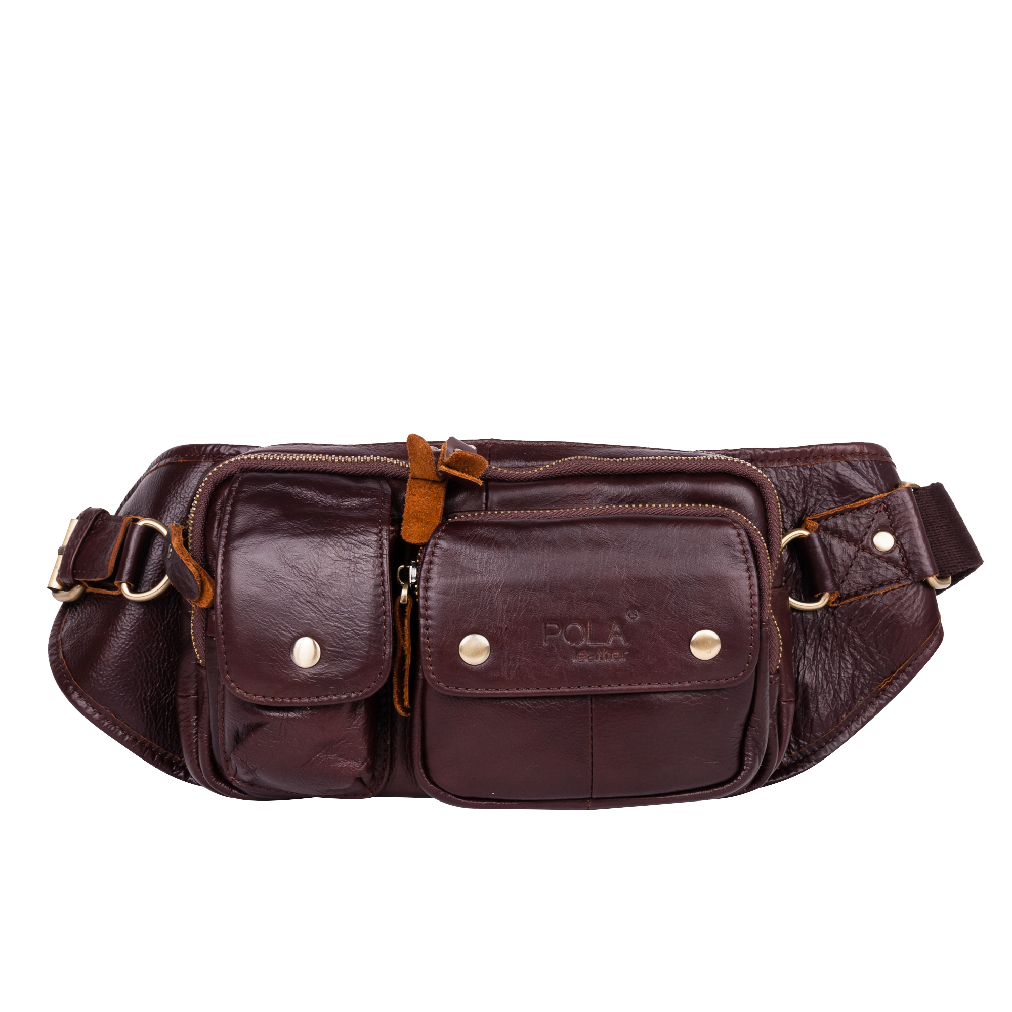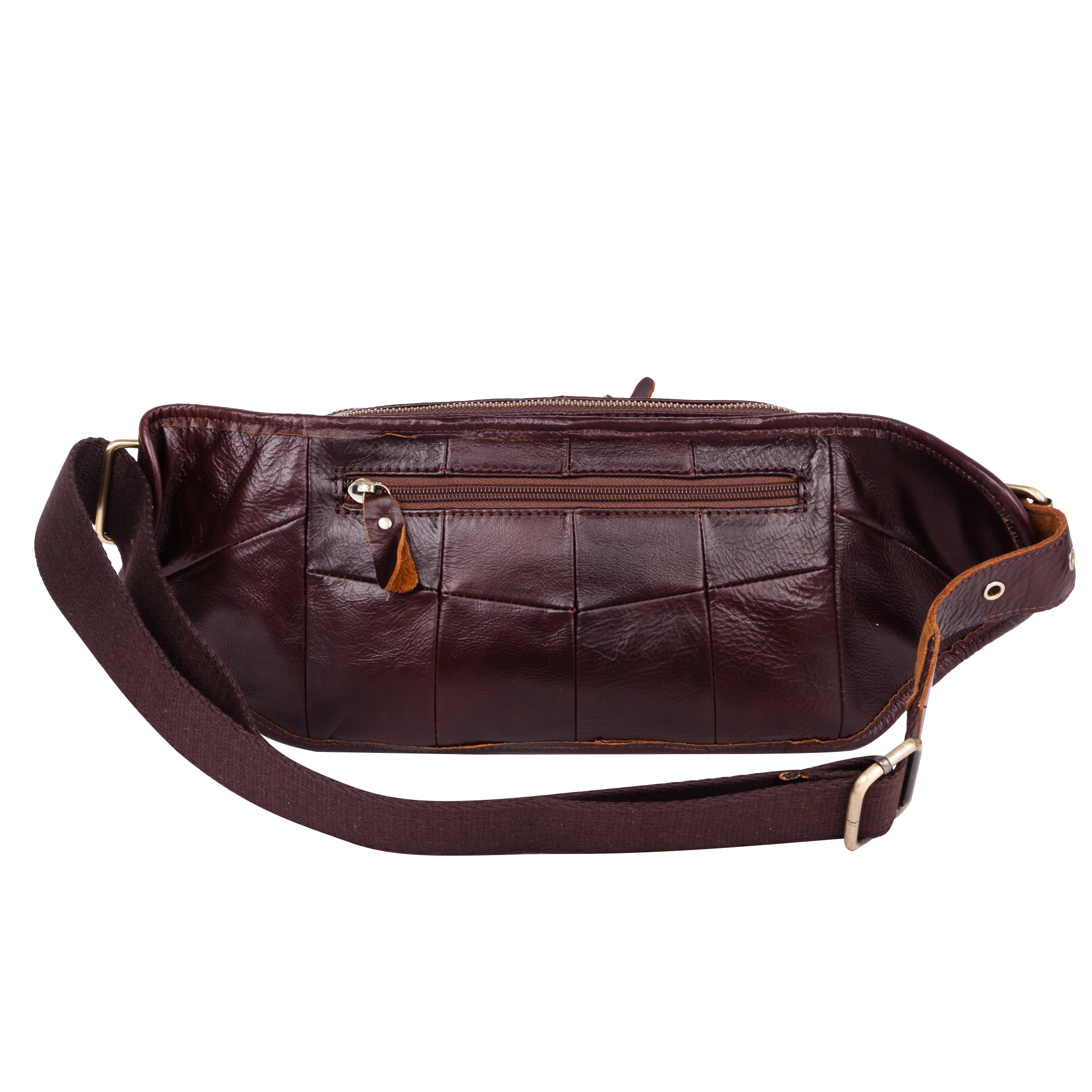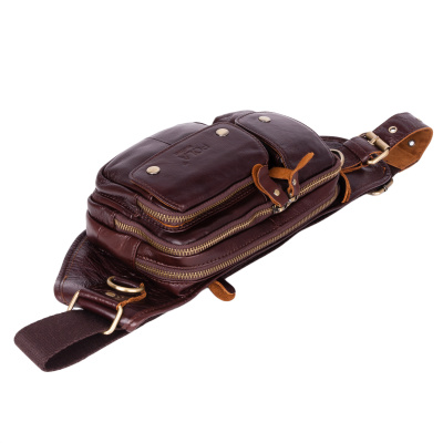 Кожаная мужская сумка на пояс. Состоит из двух отделений на молнии. Внутри — один карман на молнии и два открытых кармана. Снаружи — дополнительный карман на молнии сзади сумки и два кармана спереди сумки. Пояс регулируется, максимальный объем 140 см.