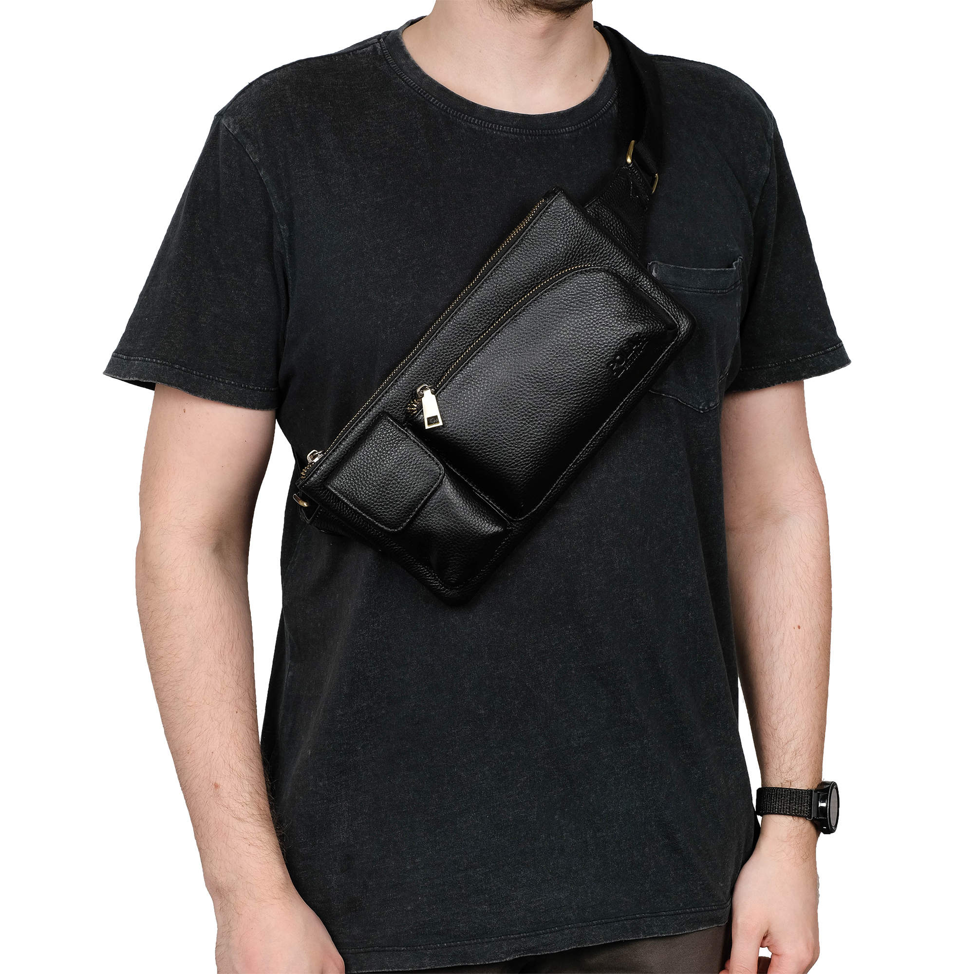 Кожаная мужская сумка Polar на пояс. Состоит из одного отделения на молнии. Внутри — один карман на молнии и два открытых кармана. Снаружи — дополнительный карман на молнии сзади сумки и два накладных кармана спереди сумки. Пояс регулируется, максимальный объем 140 см .