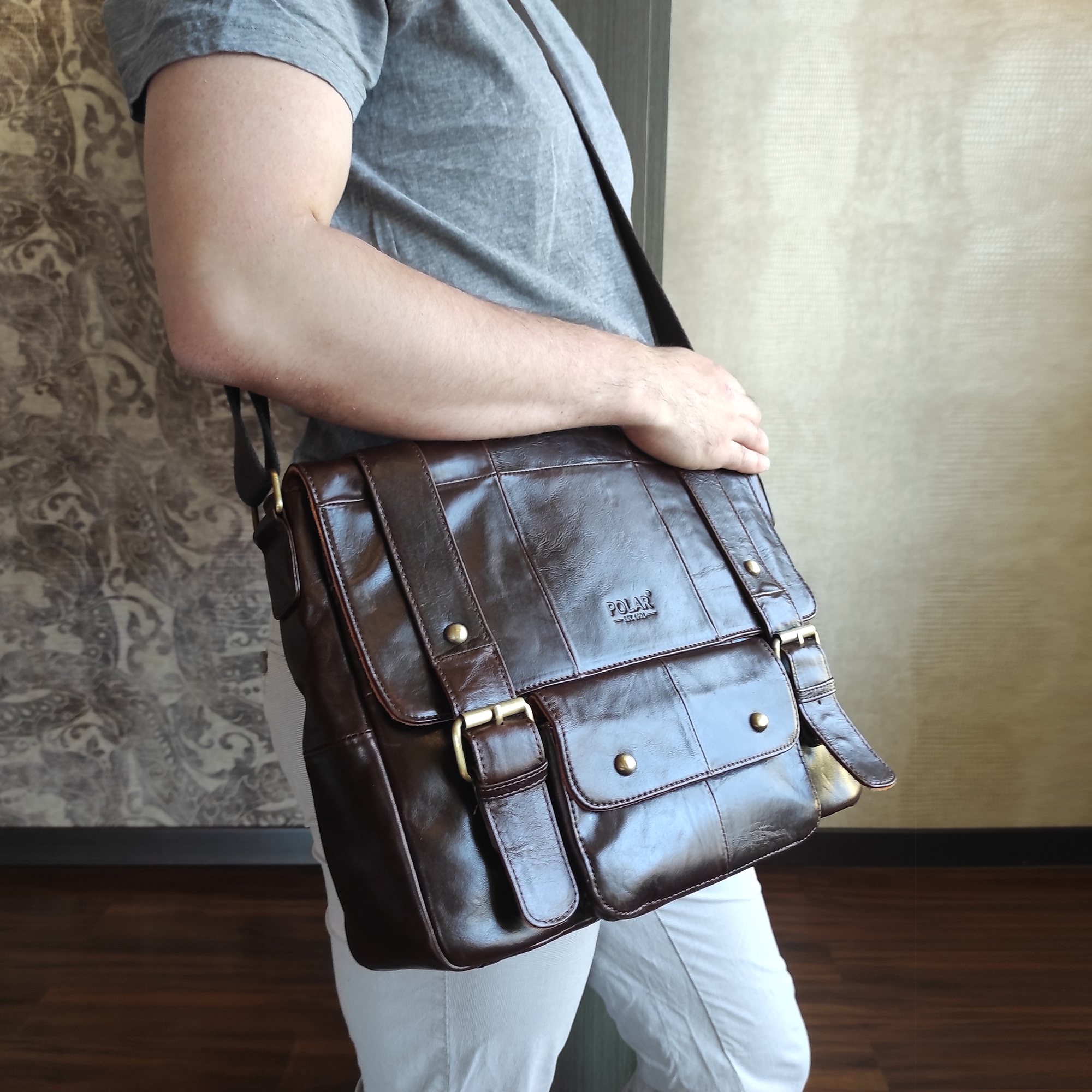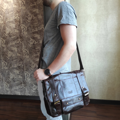 Мужская сумка Polar из натуральной кожи. Сумка открывается клапан на магнитной кнопке. Застежка на молнию. Внутри - два отдела, разделенных карманом на молнии. Карман на молнии для документов. Карман для телефона и ключей. Снаружи - карман на молнии сзади сумки. Спереди сумки под клапаном один кармашек закрывается на магнитную кнопку. Удобный плечевой ремень который регулируется по необходимой Вам длине масимальная 145 см.