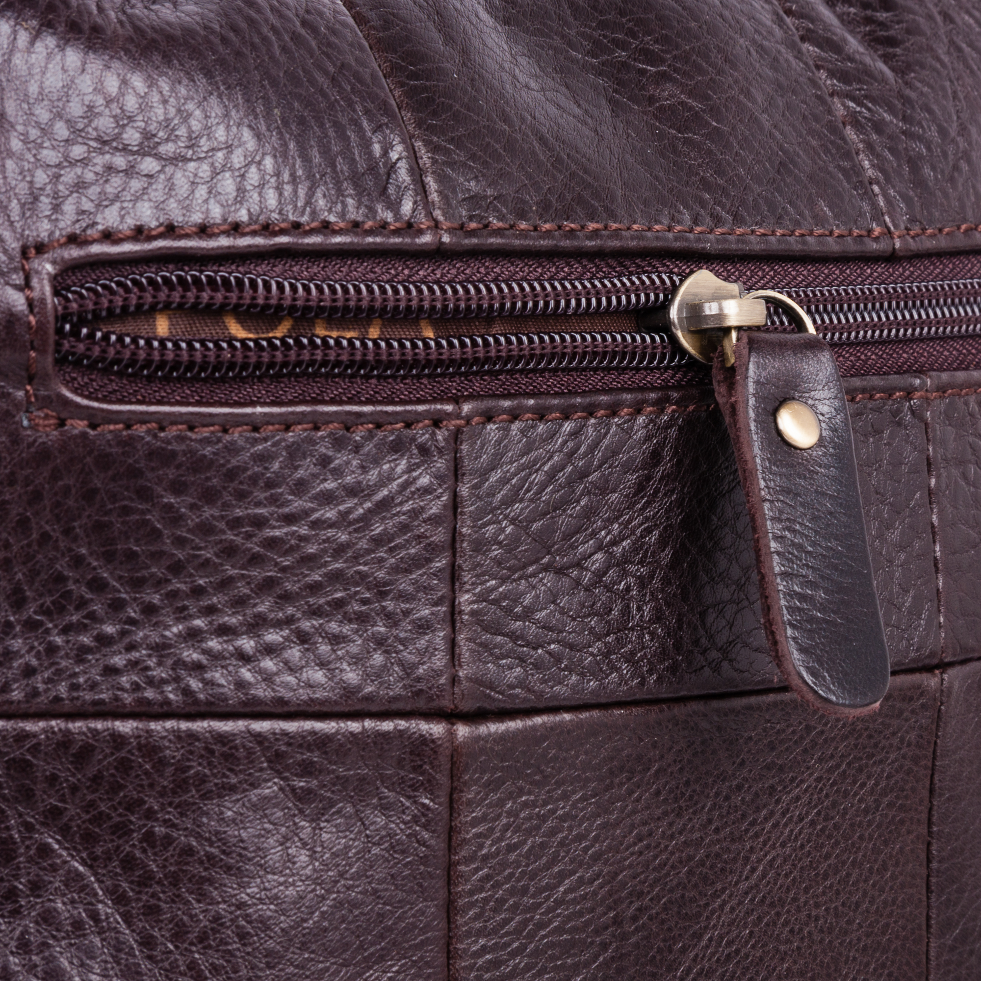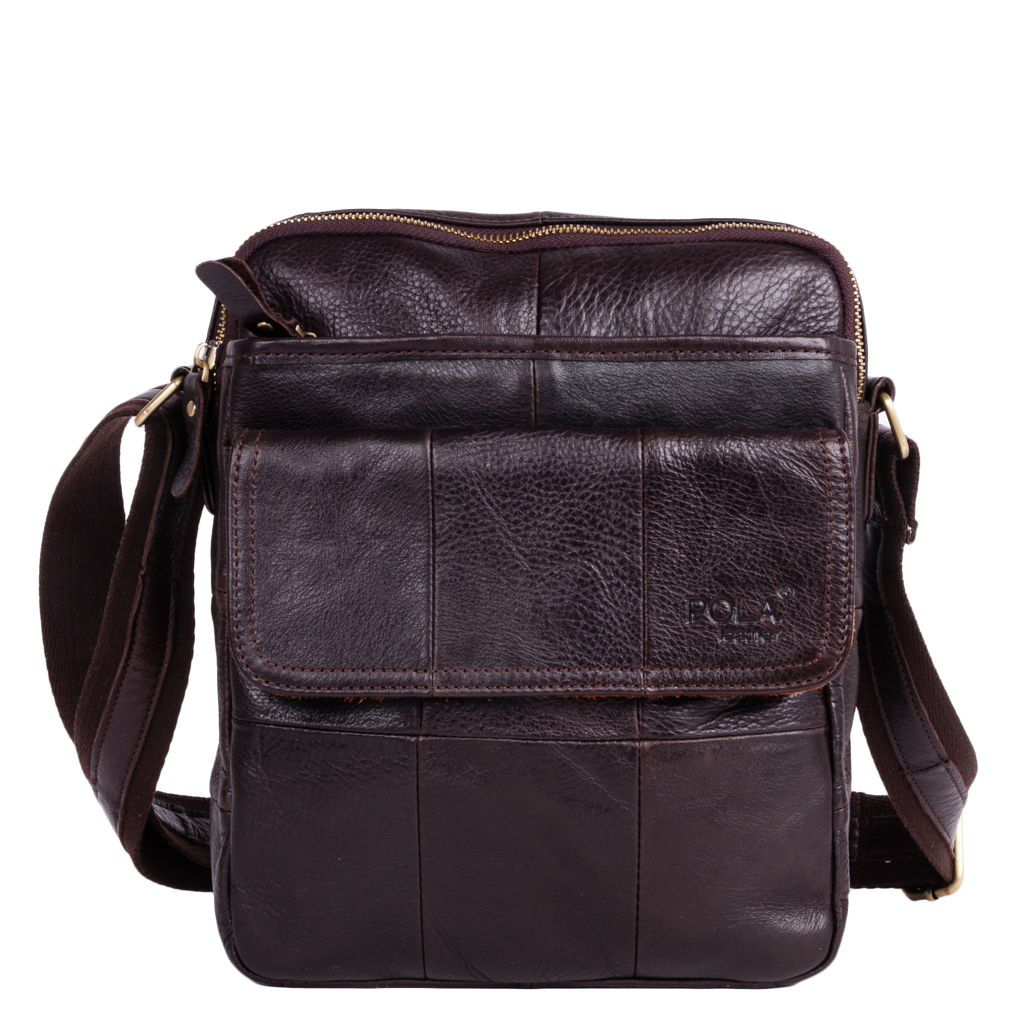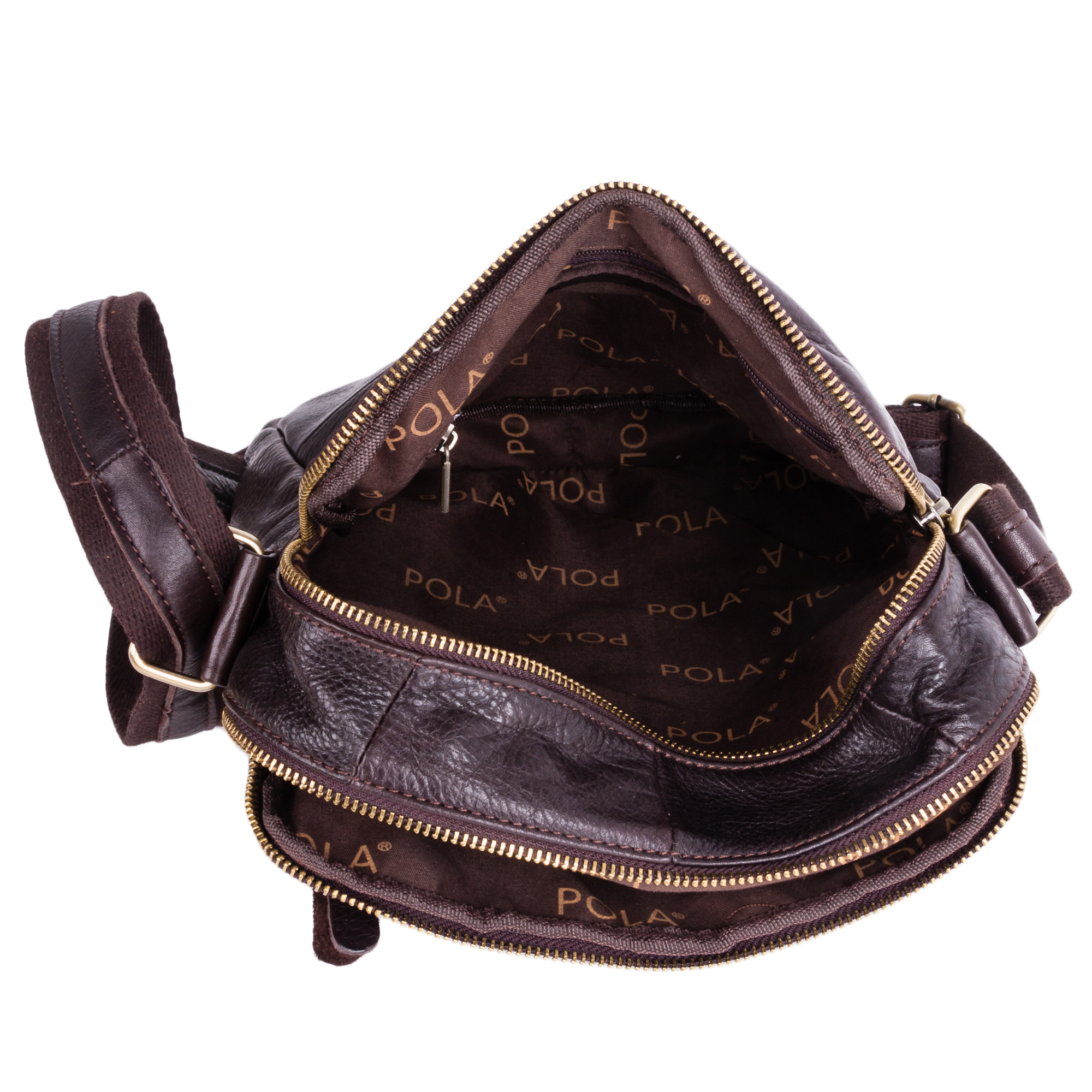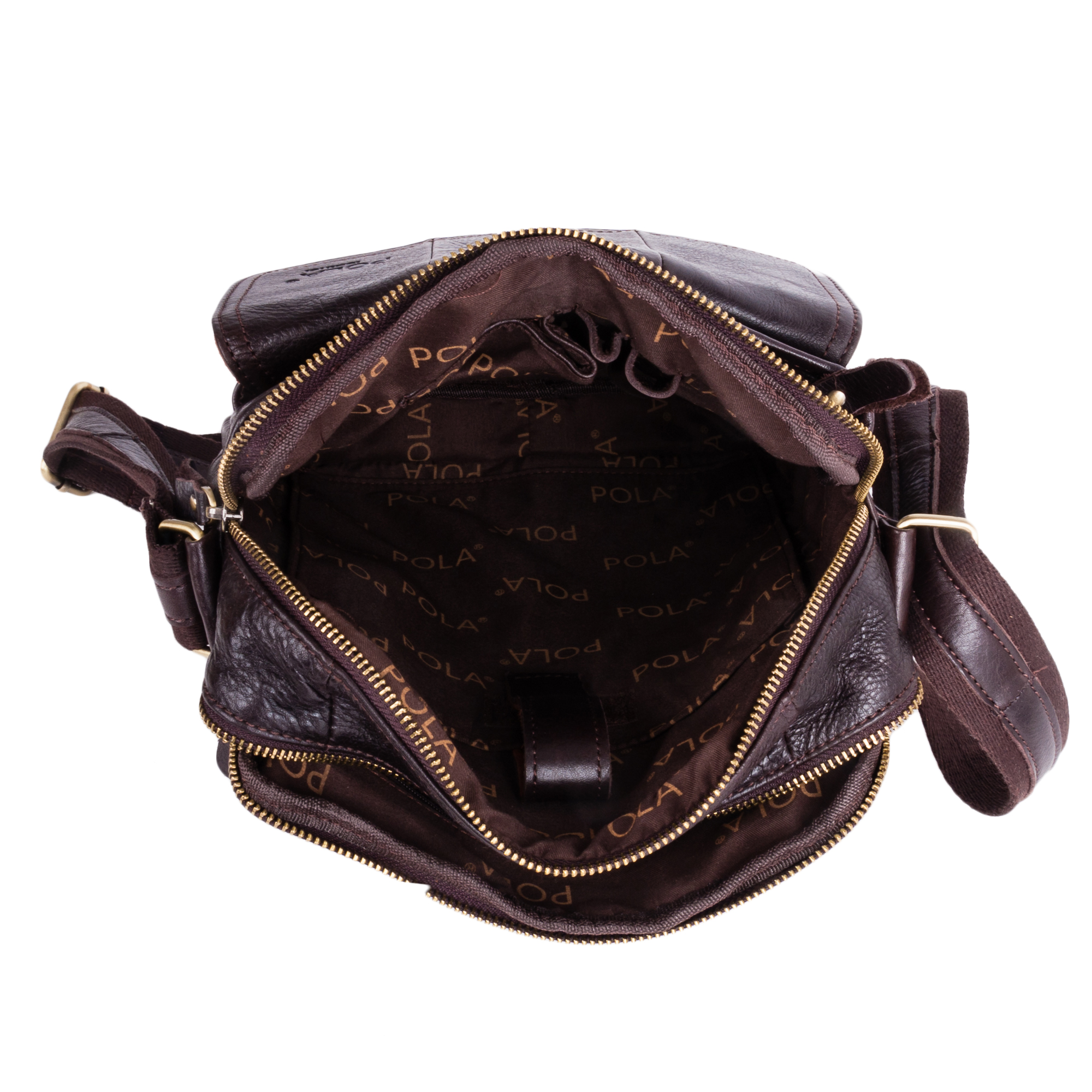 Сумка-планшет Pola выполнен из натуральной кожи. Два основных отделения закрывается на молнию. Внутри — один карман на молнии и карман на липучке. На лицевой стороне сумки один карман на молнии, второй карман закрывается клапаном на магнитной кнопке. Плечевой ремень несъемный.