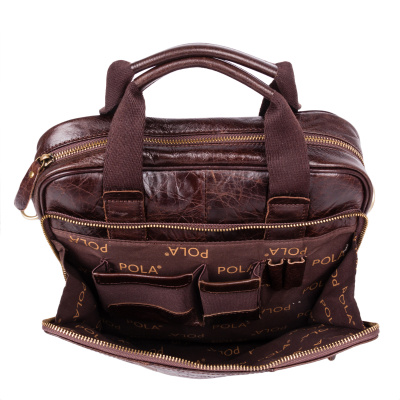 Сумка мужская Pola выполнена из натуральной кожи. Основное отделение закрывается на молнию. Внутри — одно отделение для документов формата А4, кармана на молнии и два открытых кармана. Снаружи — кармана на молнии с органайзером и карман на молнии сзади сумки. В комплекте есть съемный, регулируемый плечевой ремень.