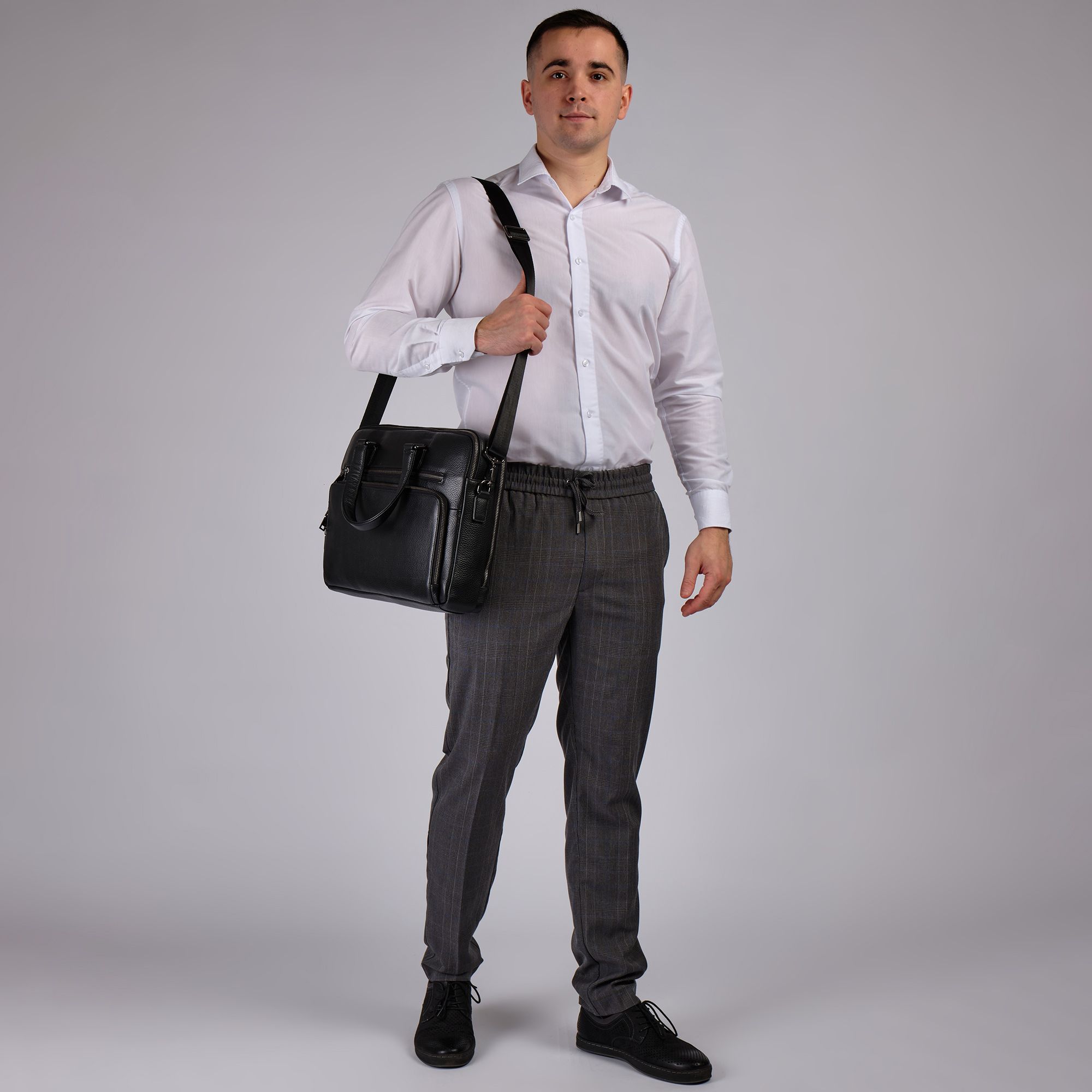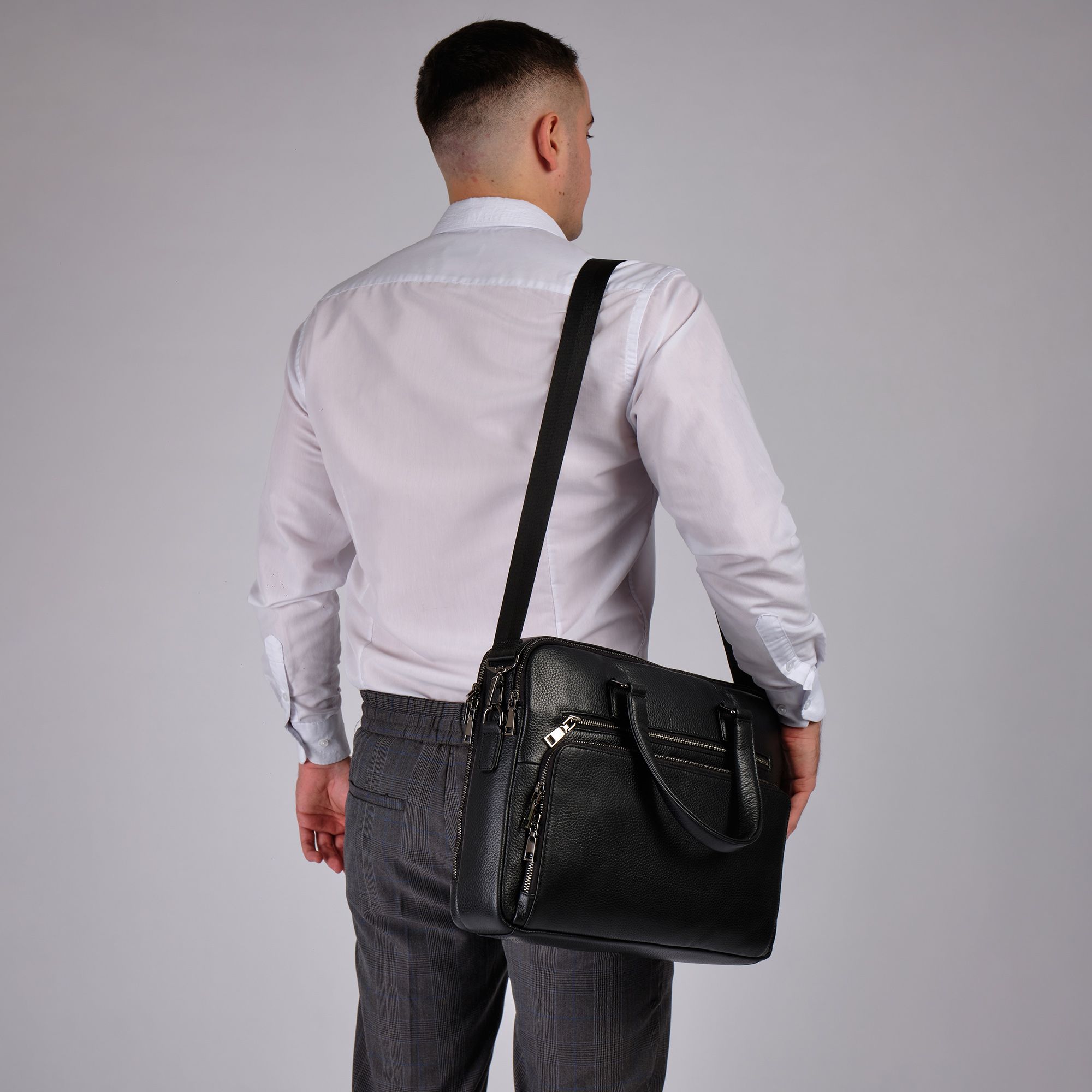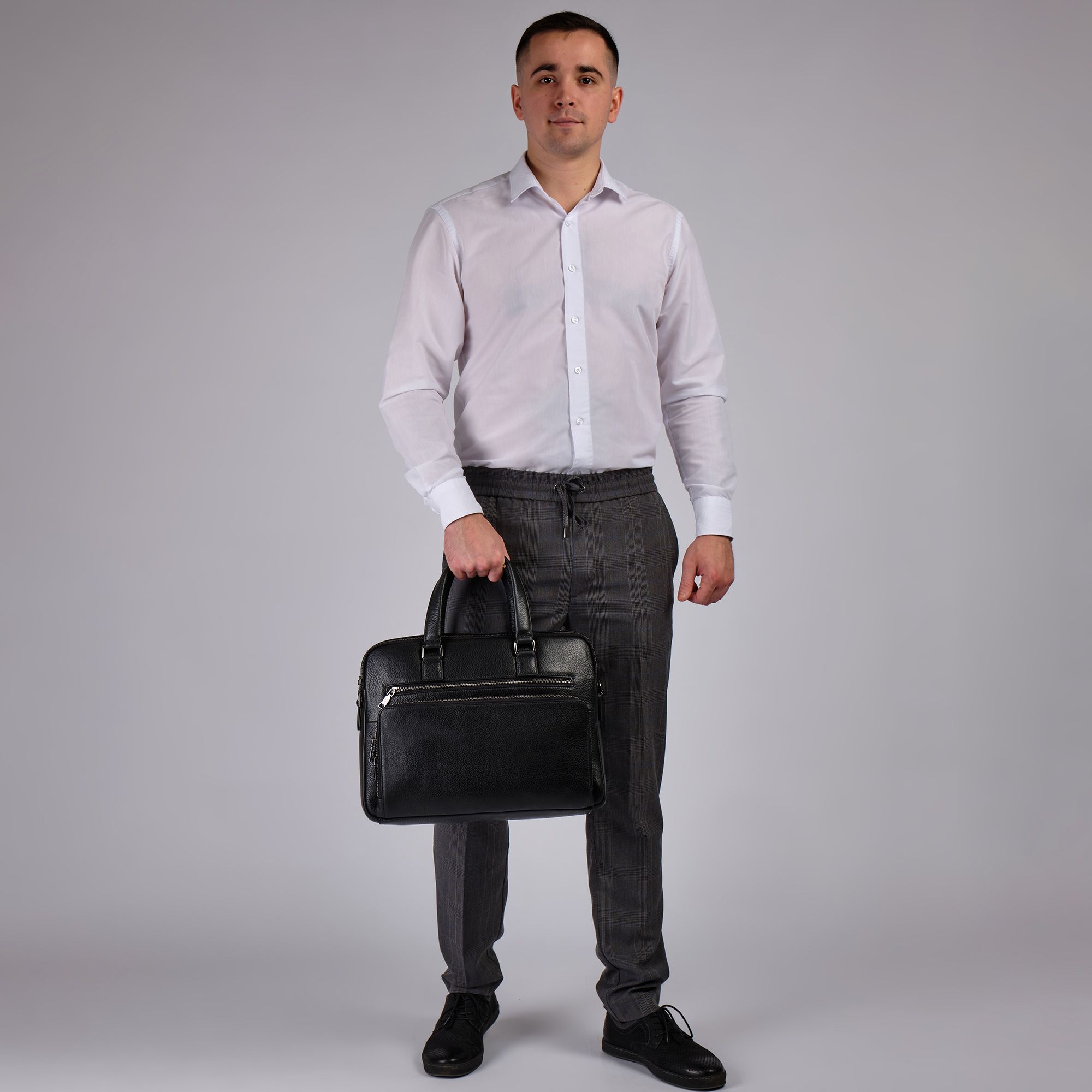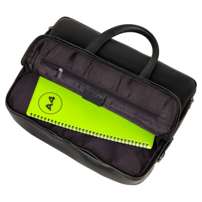 Мужской портфель фирмы Polar из высококачественной натуральной кожи. Черный цвет подчеркивает его классический вид, а также делает возможным легко сочетать его с любым стилем одежды. Подходит для деловых встреч, офисной работы, для учебы в институт и командировок. Портфель имеет два основных отделения, которые закрываются на металлическую молнию. Внутри есть отделение для электронных устройств или ноутбука с диагональю до 13,3” и открытый кармашек. Модель вмещает формат A4. Спереди есть большой вместительный карман на молнии. Сзади сумки есть также карман на молнии. Высота ручек 18 см, в комплекте есть регулируемый наплечный ремень, максимальная длина 153 см.