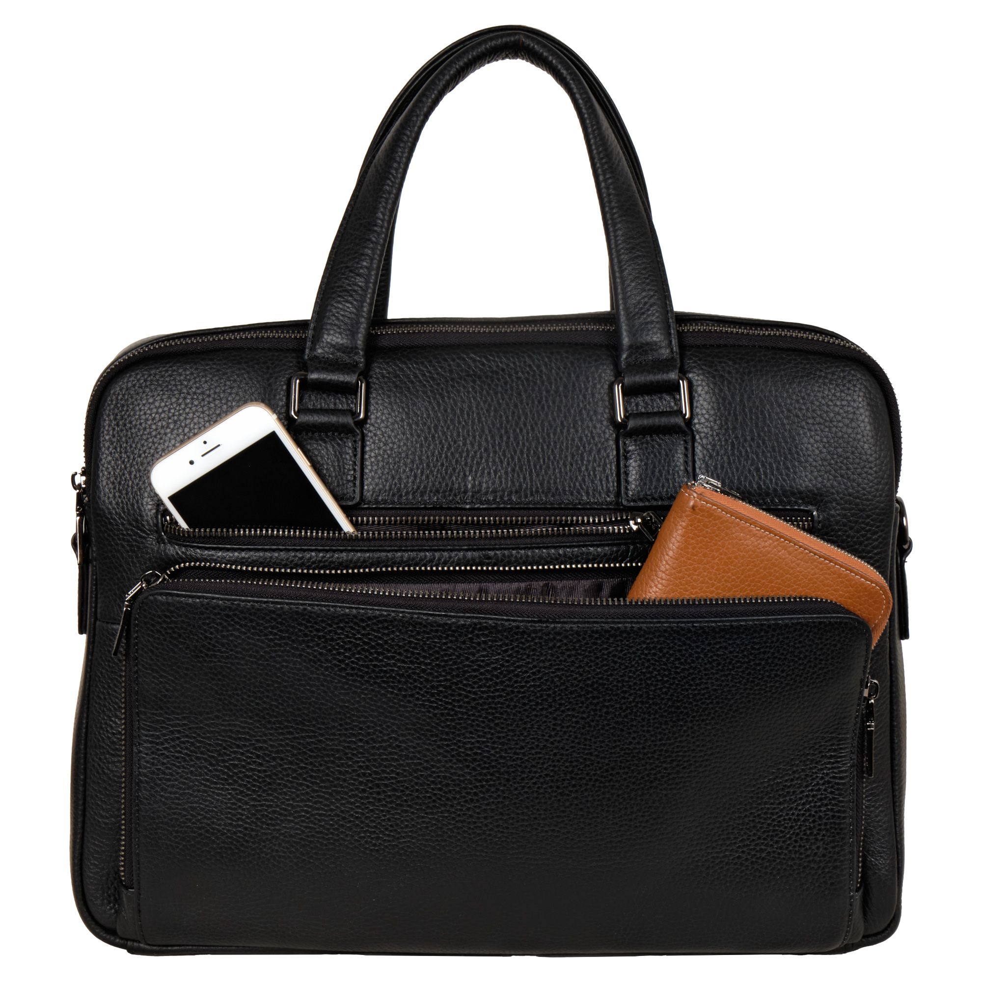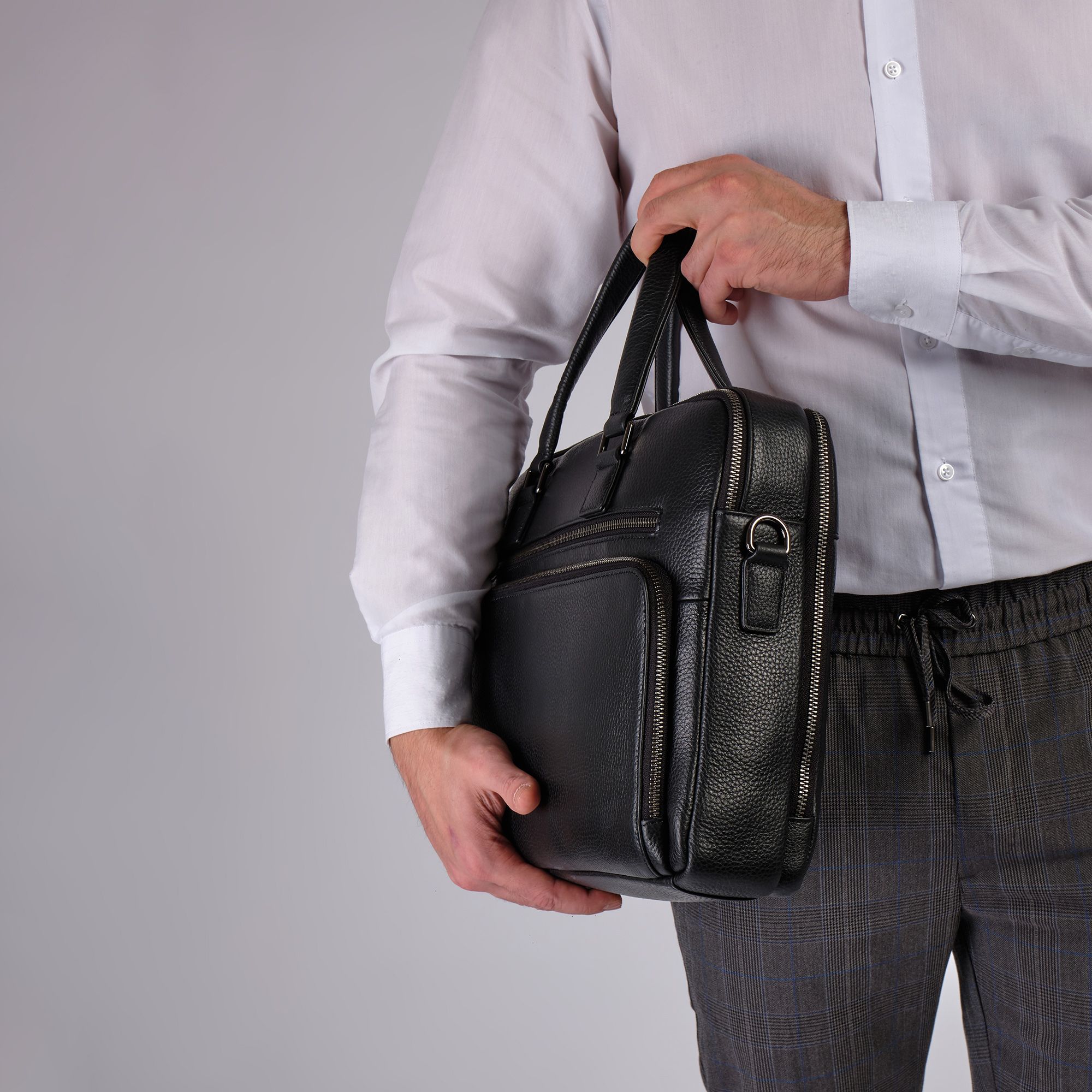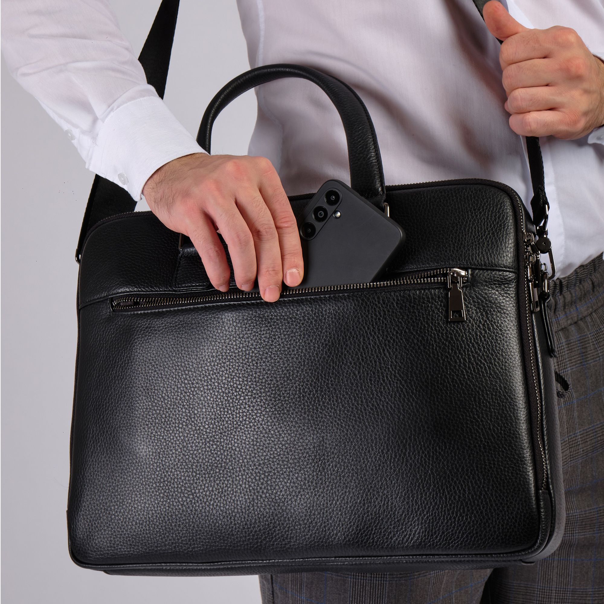 Мужской портфель фирмы Polar из высококачественной натуральной кожи. Черный цвет подчеркивает его классический вид, а также делает возможным легко сочетать его с любым стилем одежды. Подходит для деловых встреч, офисной работы, для учебы в институт и командировок. Портфель имеет два основных отделения, которые закрываются на металлическую молнию. Внутри есть отделение для электронных устройств или ноутбука с диагональю до 13,3” и открытый кармашек. Модель вмещает формат A4. Спереди есть большой вместительный карман на молнии. Сзади сумки есть также карман на молнии. Высота ручек 18 см, в комплекте есть регулируемый наплечный ремень, максимальная длина 153 см.