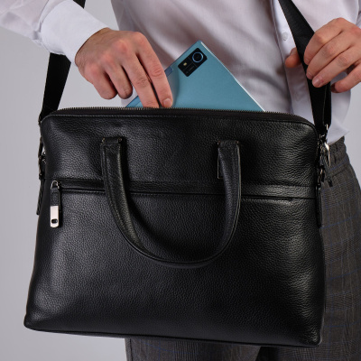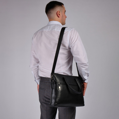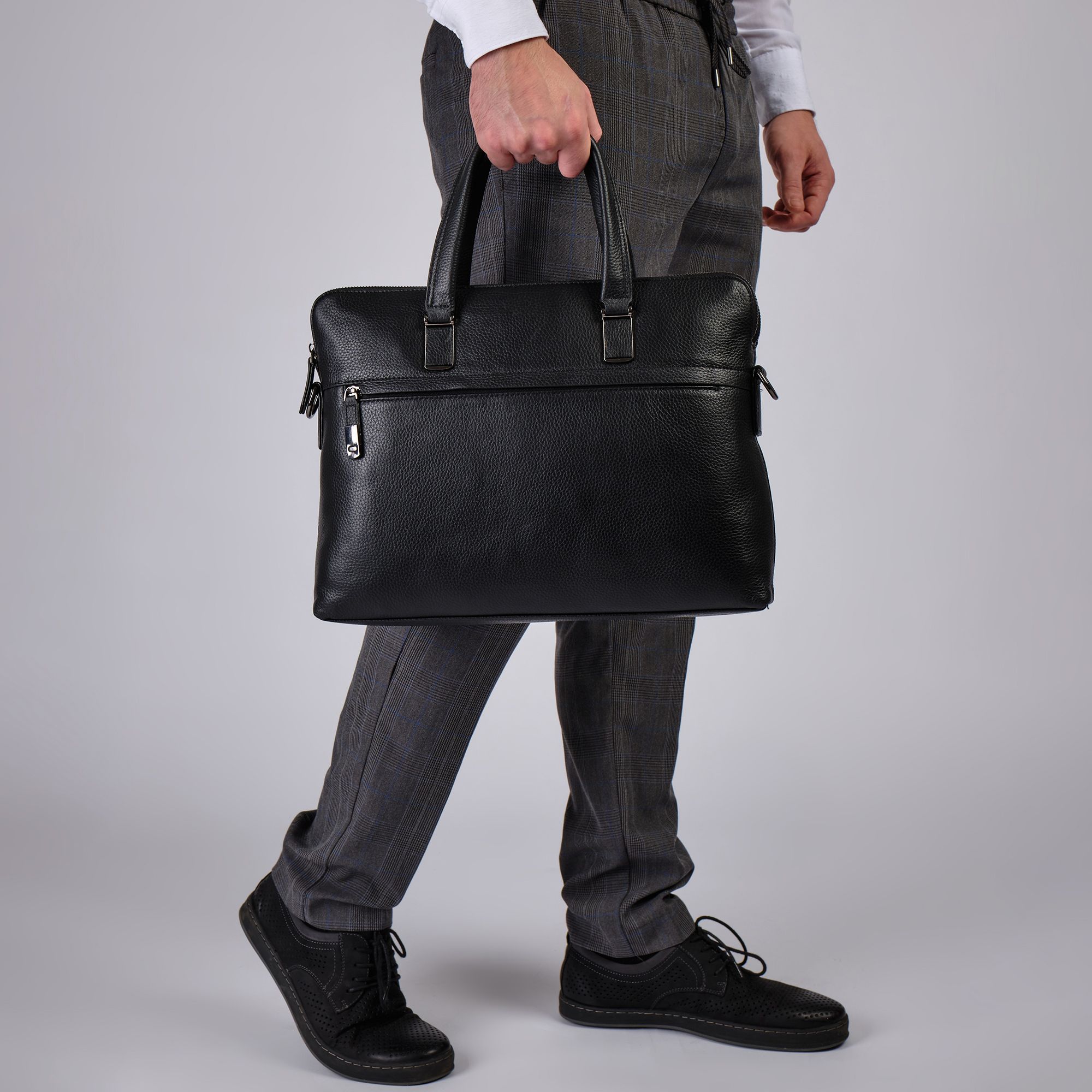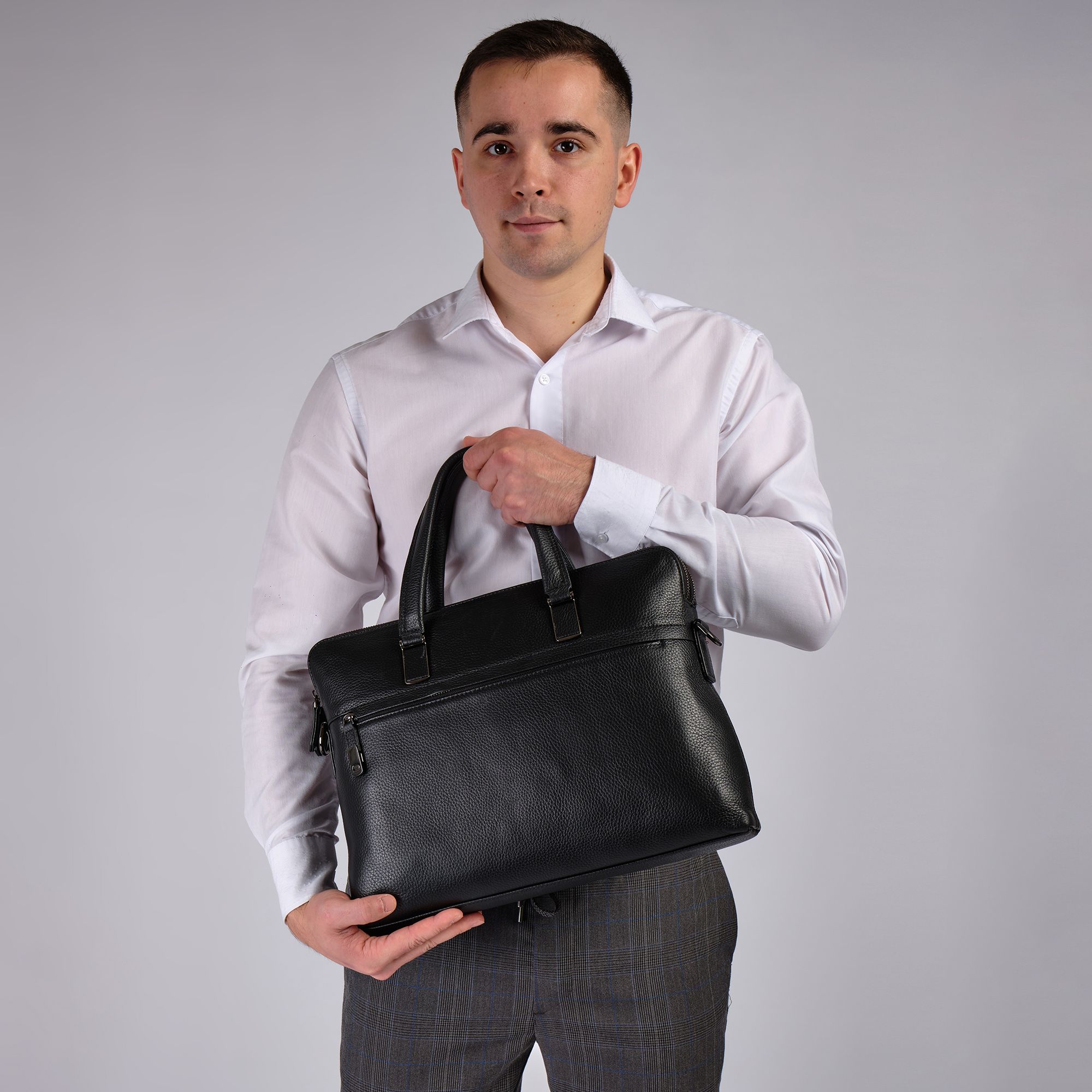 Мужской портфель торговой марки Polar из высококачественной натуральной кожи. Черный цвет подчеркивает его классический вид, а также делает возможным легко сочетать его с любым стилем одежды. Подходит для деловых встреч, офисной работы, для учебы в институт и командировок. Портфель имеет два основных отделения, которые закрываются на металлическую молнию. Внутри отделение для электронных устройств или ноутбука с диагональю до 13,3” и открытый кармашек. Модель вмещает формат A4. На задней стенке сумки есть карман на молнии. Высота ручек 17 см, в комплекте есть регулируемый наплечный ремень с мягким наплечником, максимальная длина 153 см.