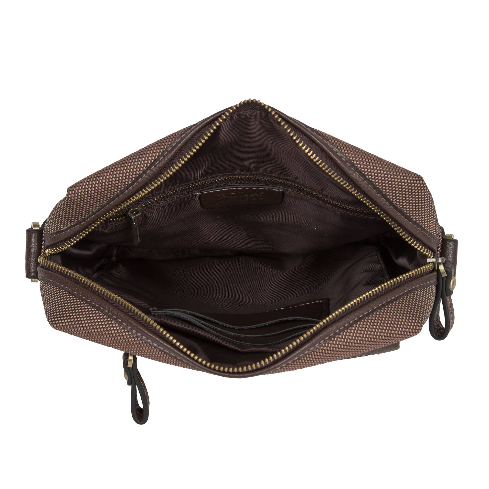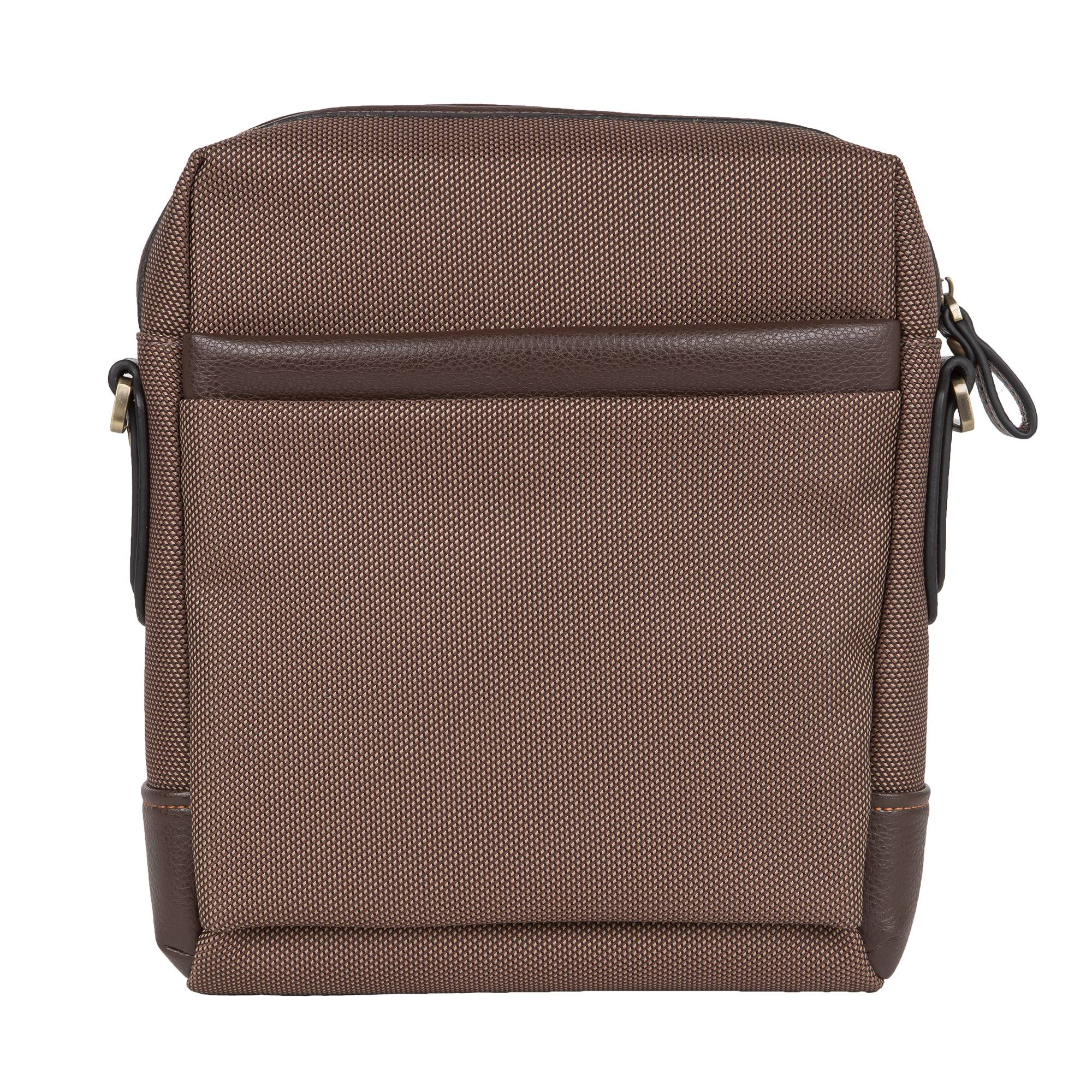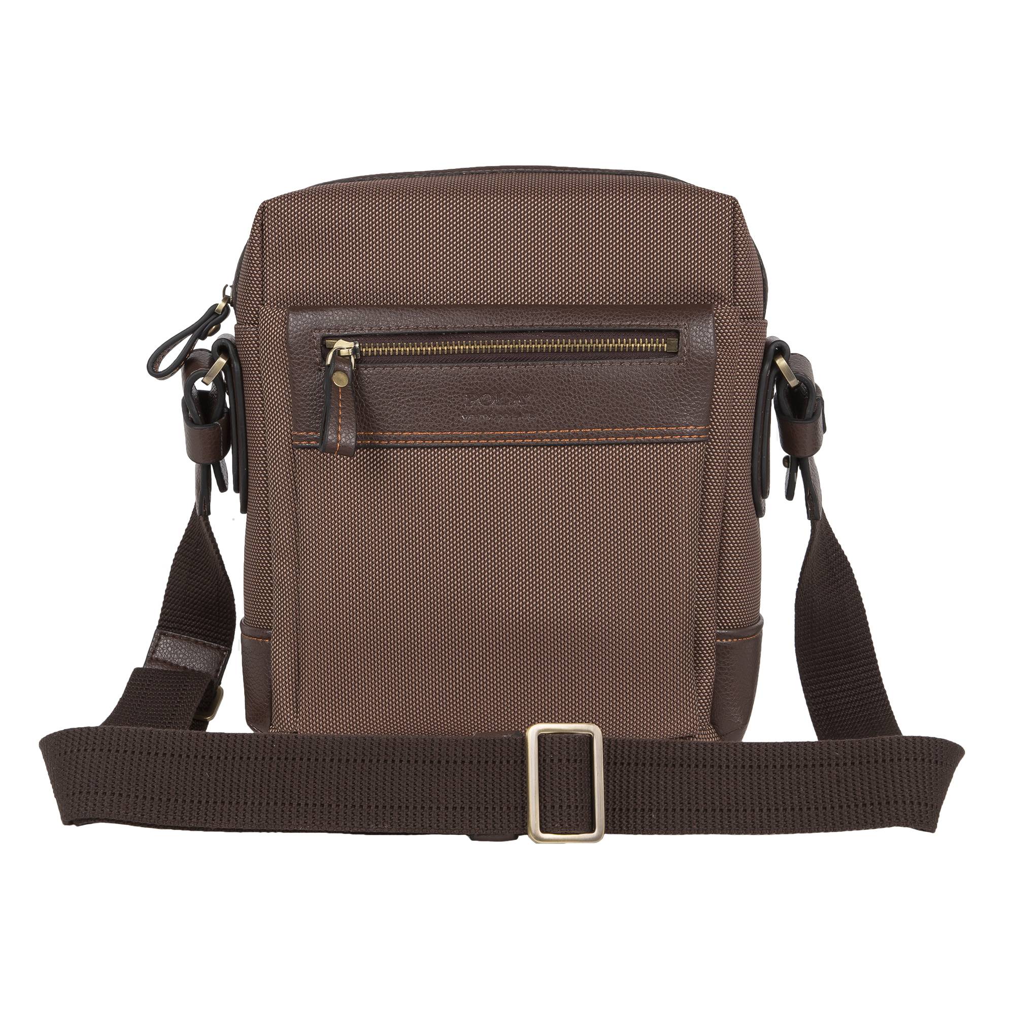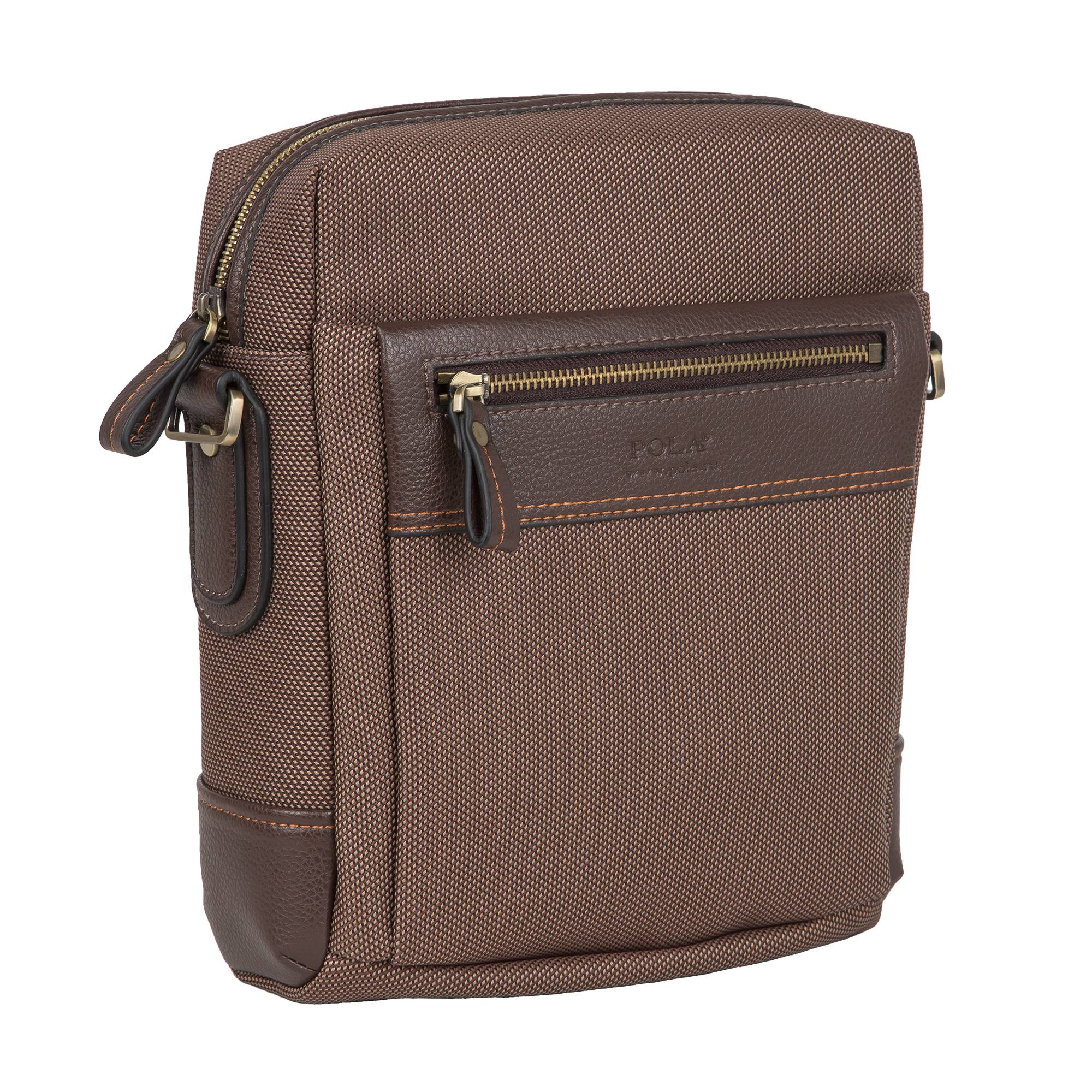 Мужская сумка POLA Выполнена из полиэстер со вставками из натуральной кожи. Внутри одно отделение и несколько для канцелярии и визиток. Снаружи два кармана на молнии на передней стенке и один на обратной стороне сумки. Имеется регулируемый плечевой ремень.