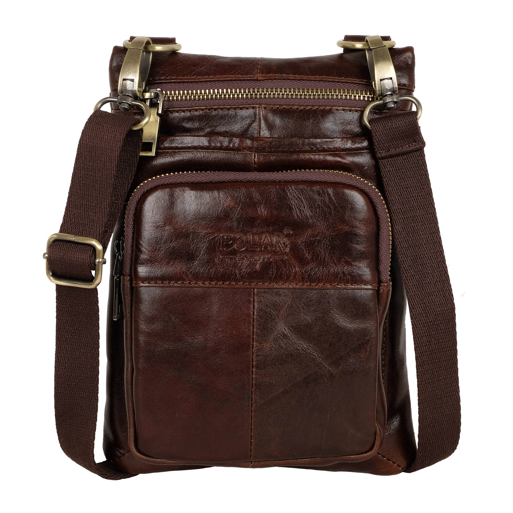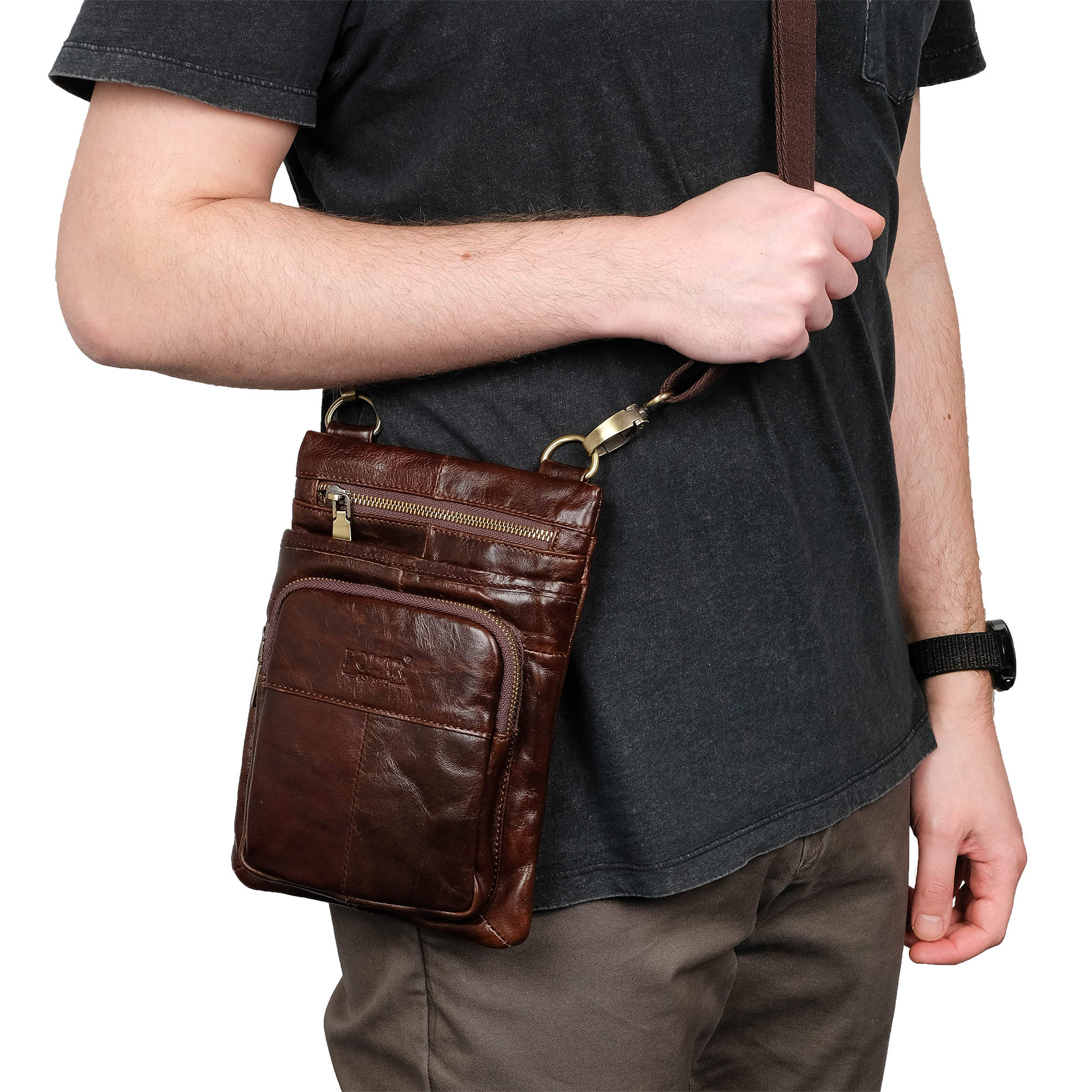 Мужская кожаная Polar сумочка с ремнем на плечо и креплением на ремень. Основное отделение на молнии с карманом на молнии для ценных документов. На лицевой части сумки два кармана на молнии. Ремень отстегивается. Максимальная длина 145 см.