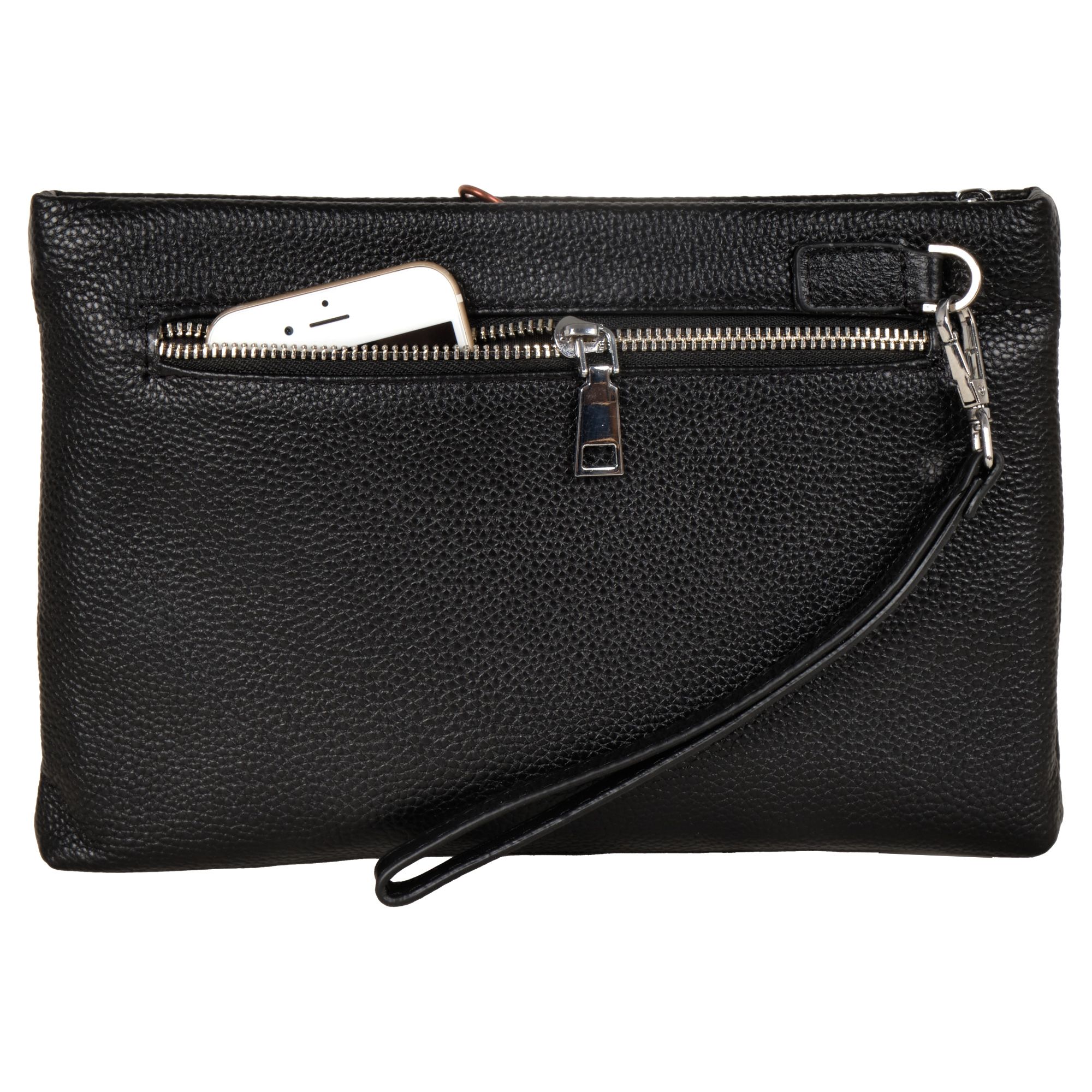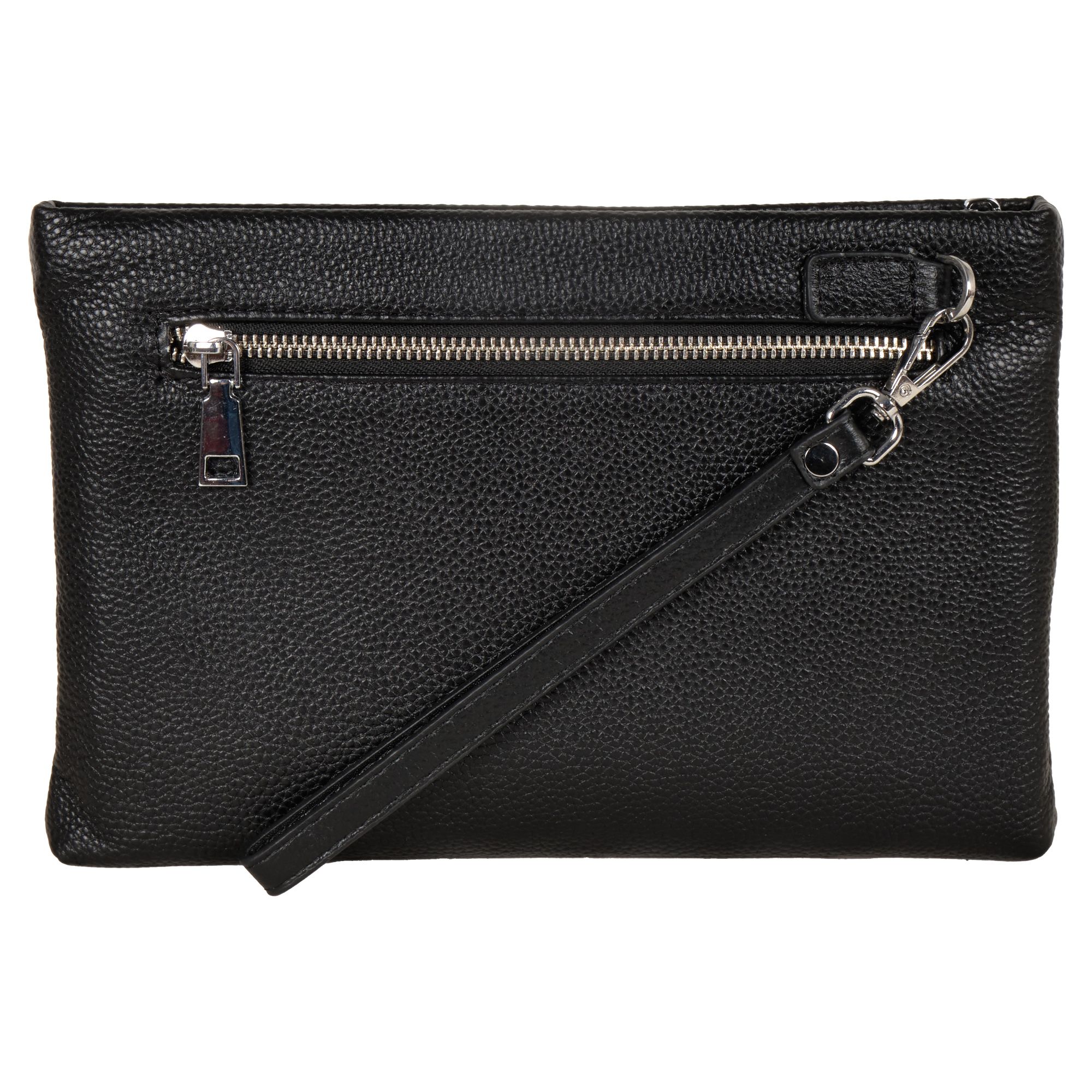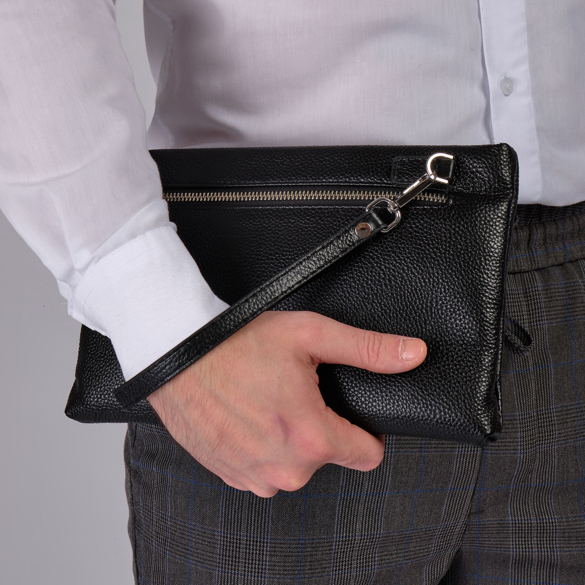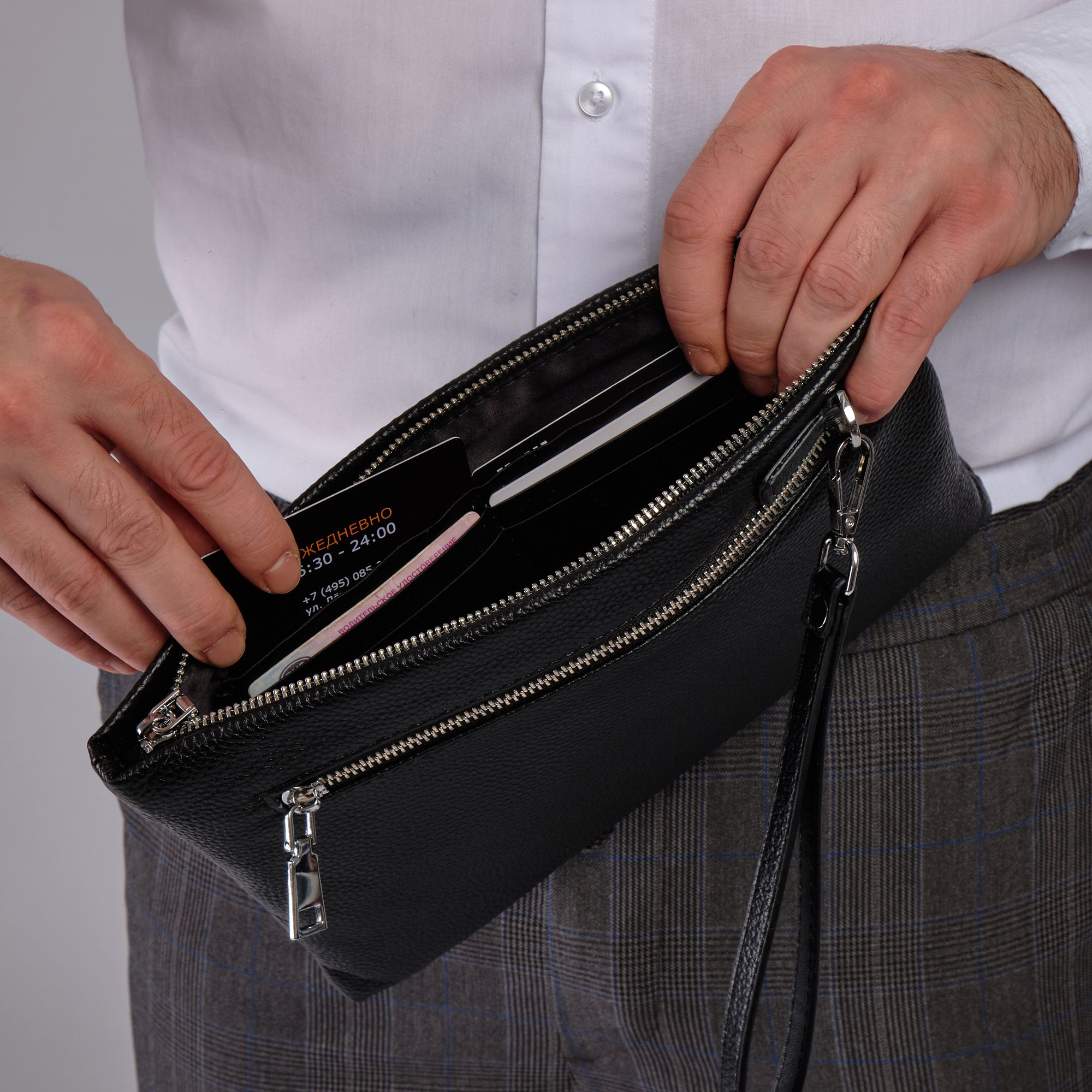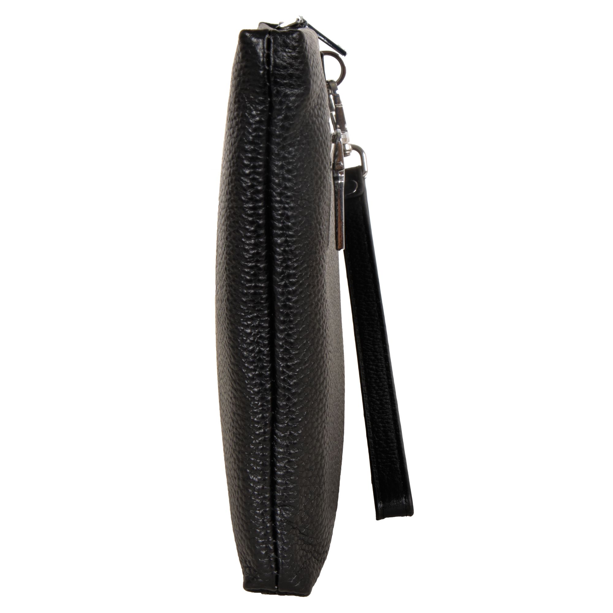 Мужской черный клатч Polar из высококачественной натуральной кожи. Барсетка – основное отделение, закрывается на металлическую молнию. Внутри один карман на молнии, и 6 отсеков для пластиковых карт, визиток, документов и телефона. Сзади сумки небольшой кармашек на молнии. Изготовлено и произведено в России. Данный кошелек - унисекс, с ремнем на руку. Подойдет как для женщин, так и для мужчин. Цвет фурнитуры-серебро.