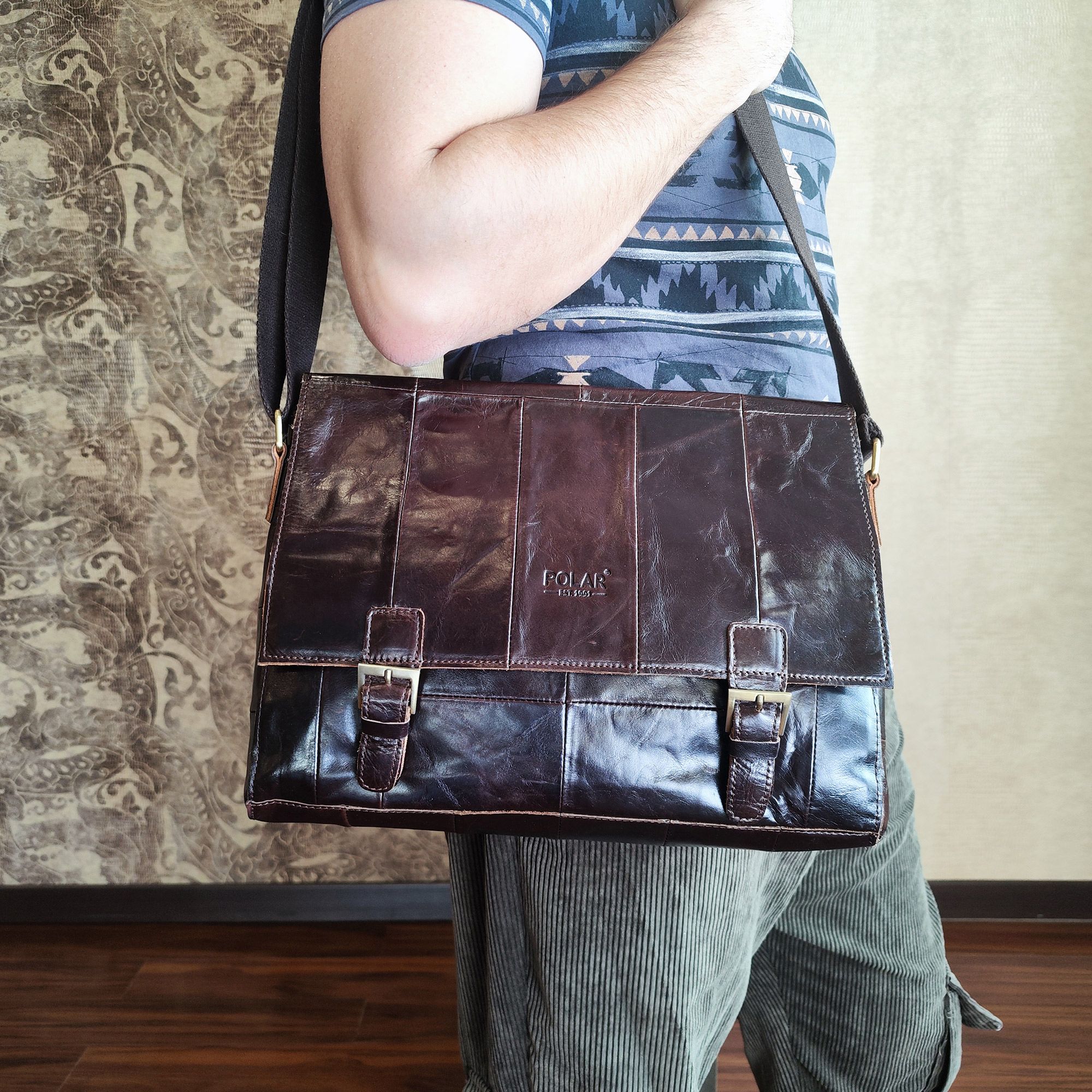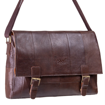 Мужская сумка POLA из натуральной кожи. Три отделения. Застежка на молнию. Внутри: 2 кармана на молнии под документы, карман под телефон и ключи. Отделение под визитные карточки. Снаружи- карман на молнии сзади сумки. Три кармашка спереди сумки. Удобный плечевой ремень, который регулируется по необходимой Вам длине.