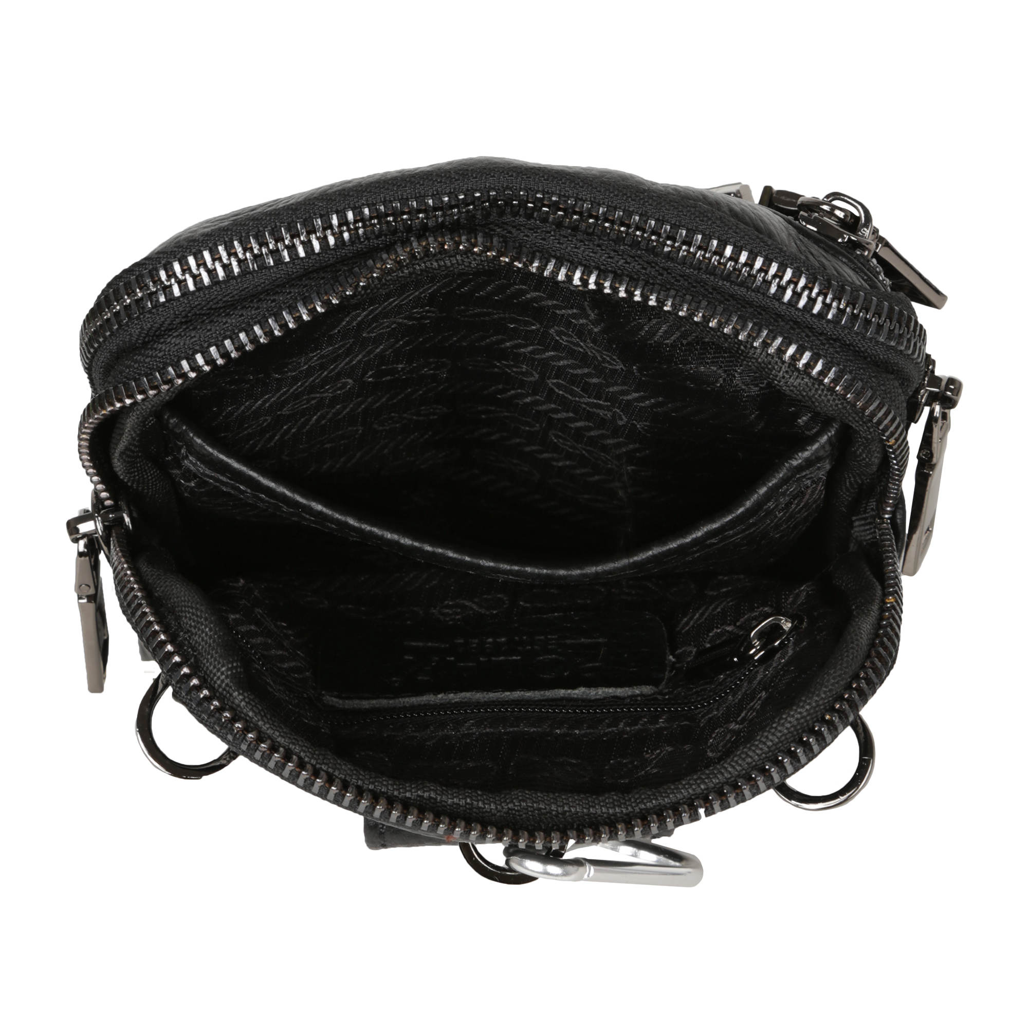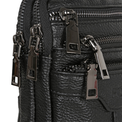 Основное отделение закрывается на молнию. Внутри два отделения, разделенные между собой карманом- перегородкой и потайной карман на молнии. На передней стенке сумки два кармана на молнии.