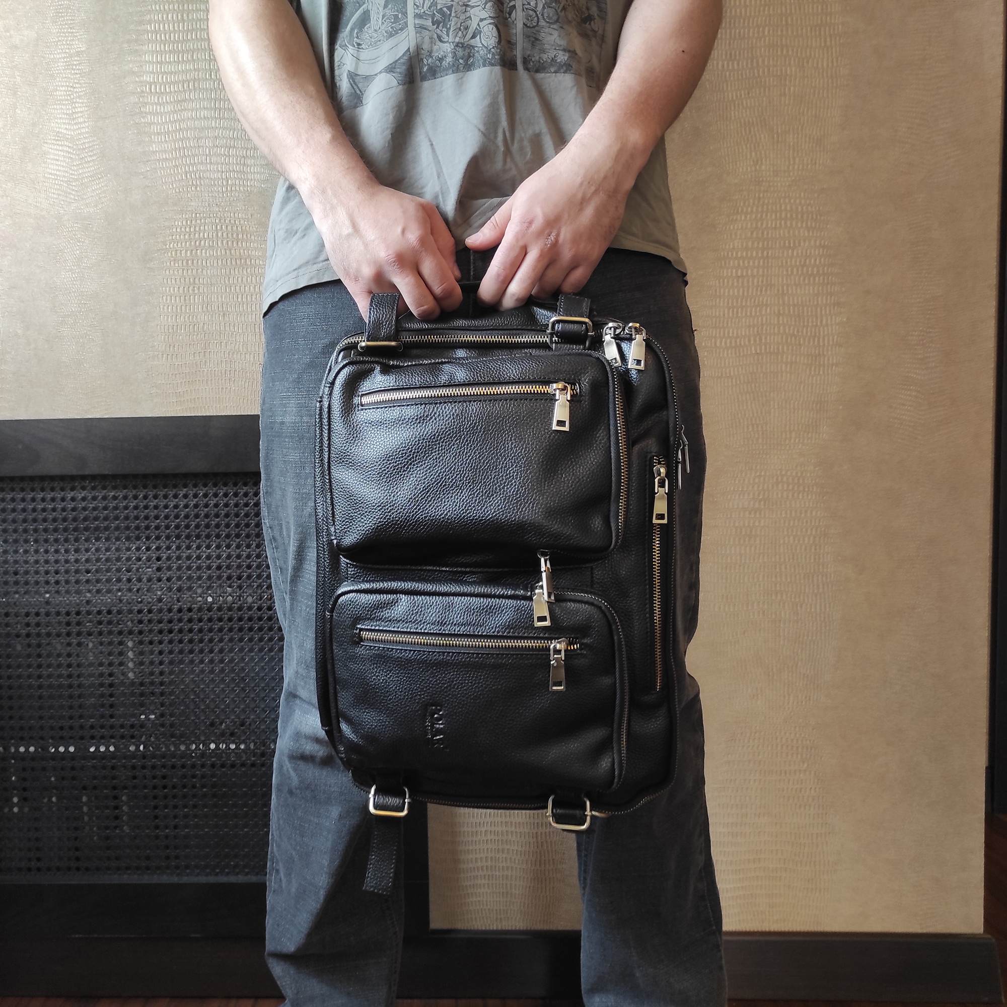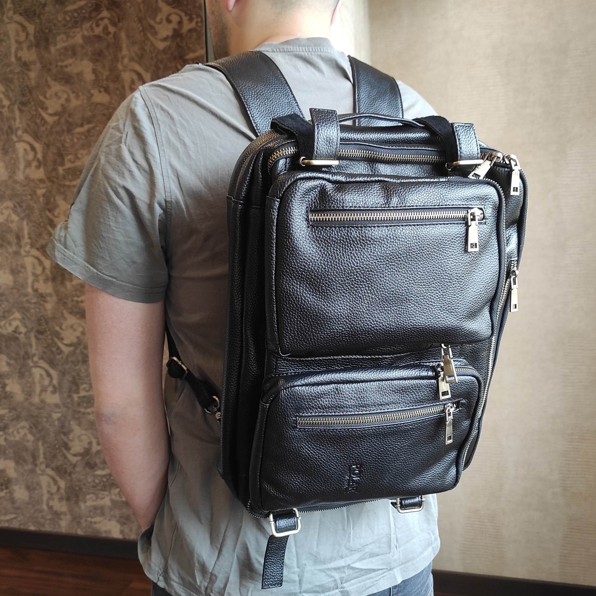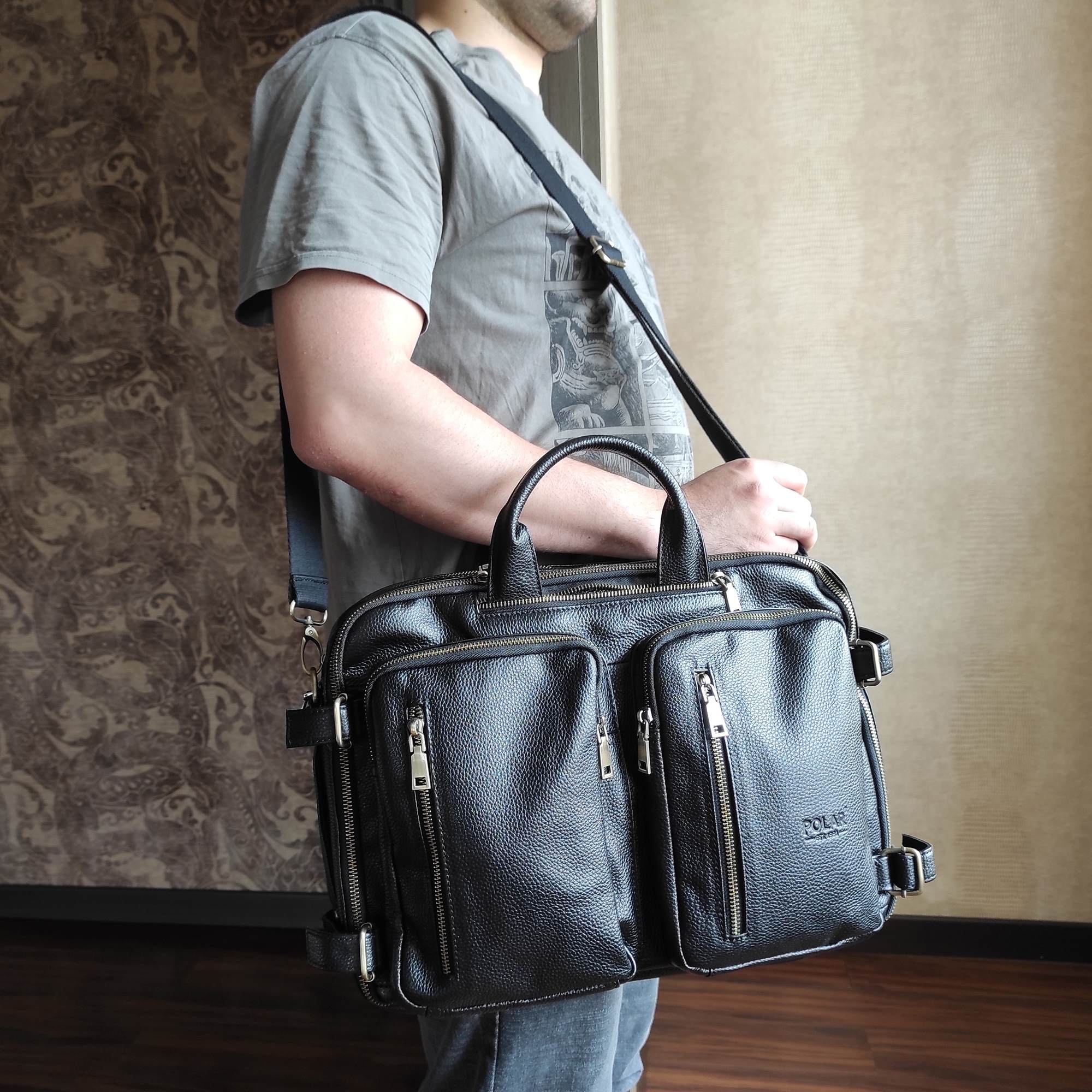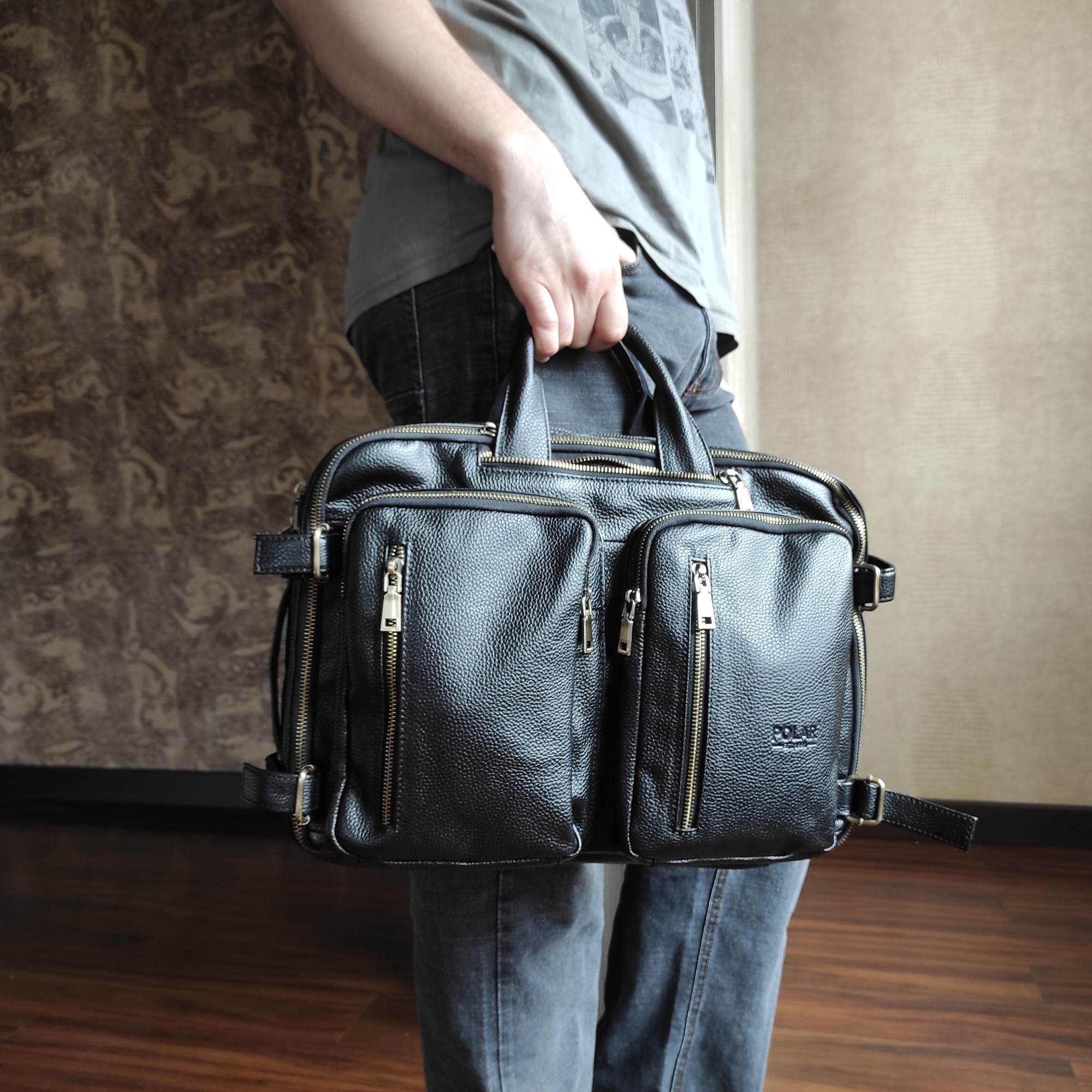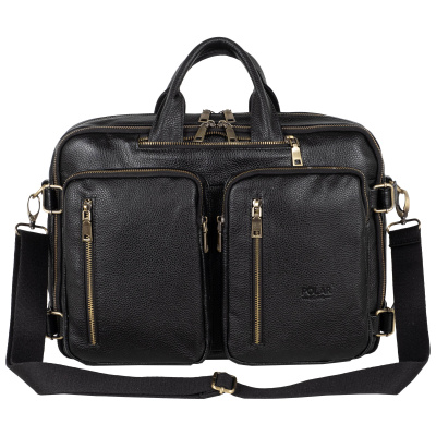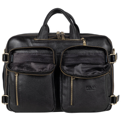 Мужская сумка-трансформер Polar из натуральной кожи. Главной особенностью данной модели является то, что её можно использовать, как сумку, так и рюкзак, для этого достаточно вытащить лямки. Внутри два отдела: для документов и для ноутбука до 15,6″. В сумке огромное количество карманов и отделений. На задней стенке сумки спрятаны под молнию рюкзачные лямки, которые можно достать, расстегнув молнию. Два накладных кармашка спереди на молнии. Удобный плечевой ремень, который регулируется по необходимой Вам длине.