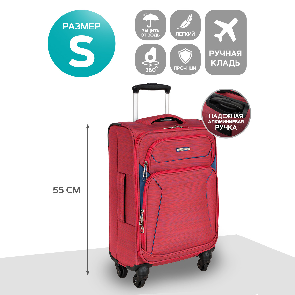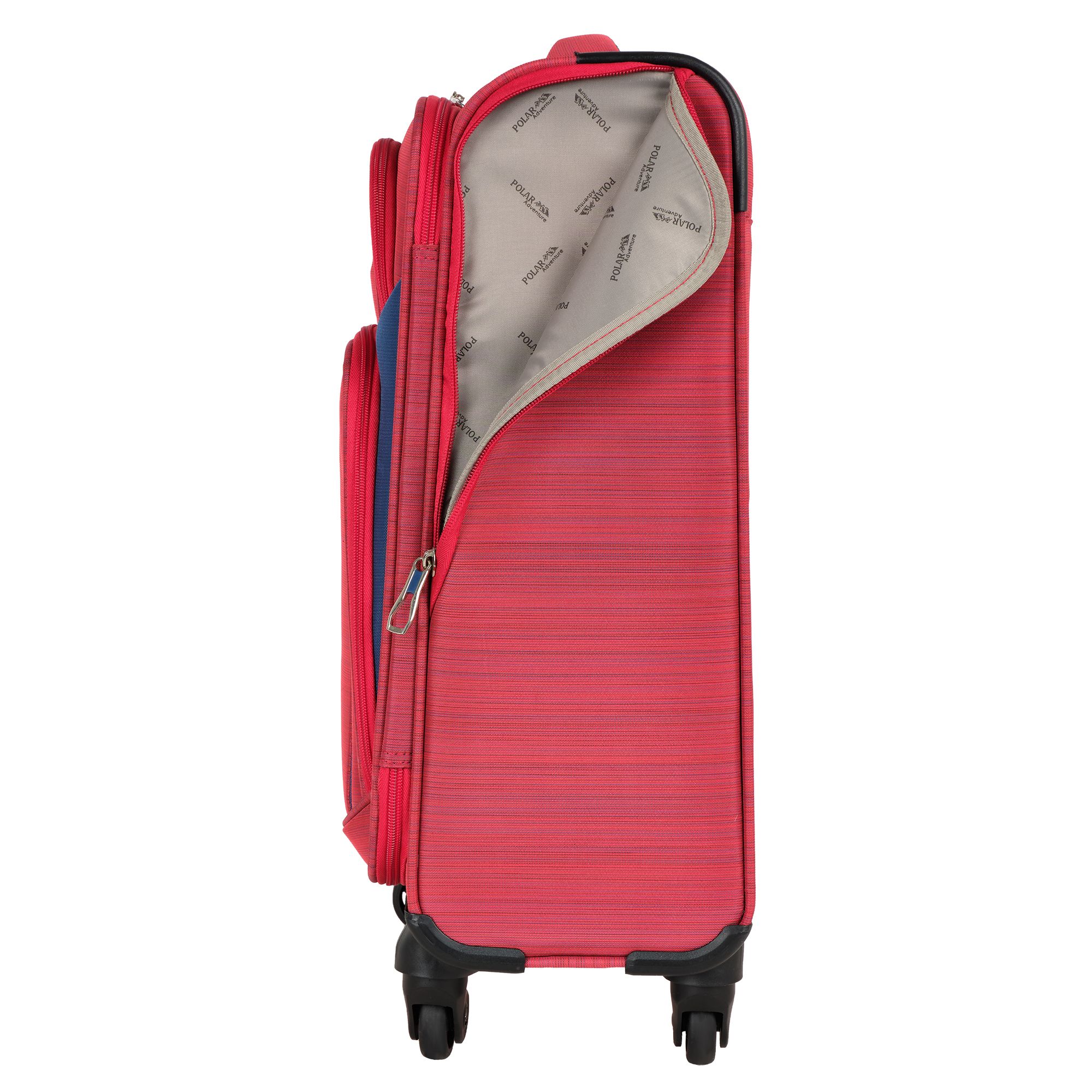 Суперлегкий четырёхколёсный чемодан POLAR. Основное отделение чемодана закрывается на молнию. Впереди два кармана и боковой карман на молнии. Четырёхколёсный чемодан более маневренный и удобный по сравнению с двухколёсным - 4 колеса вращаются на 360 градусов.