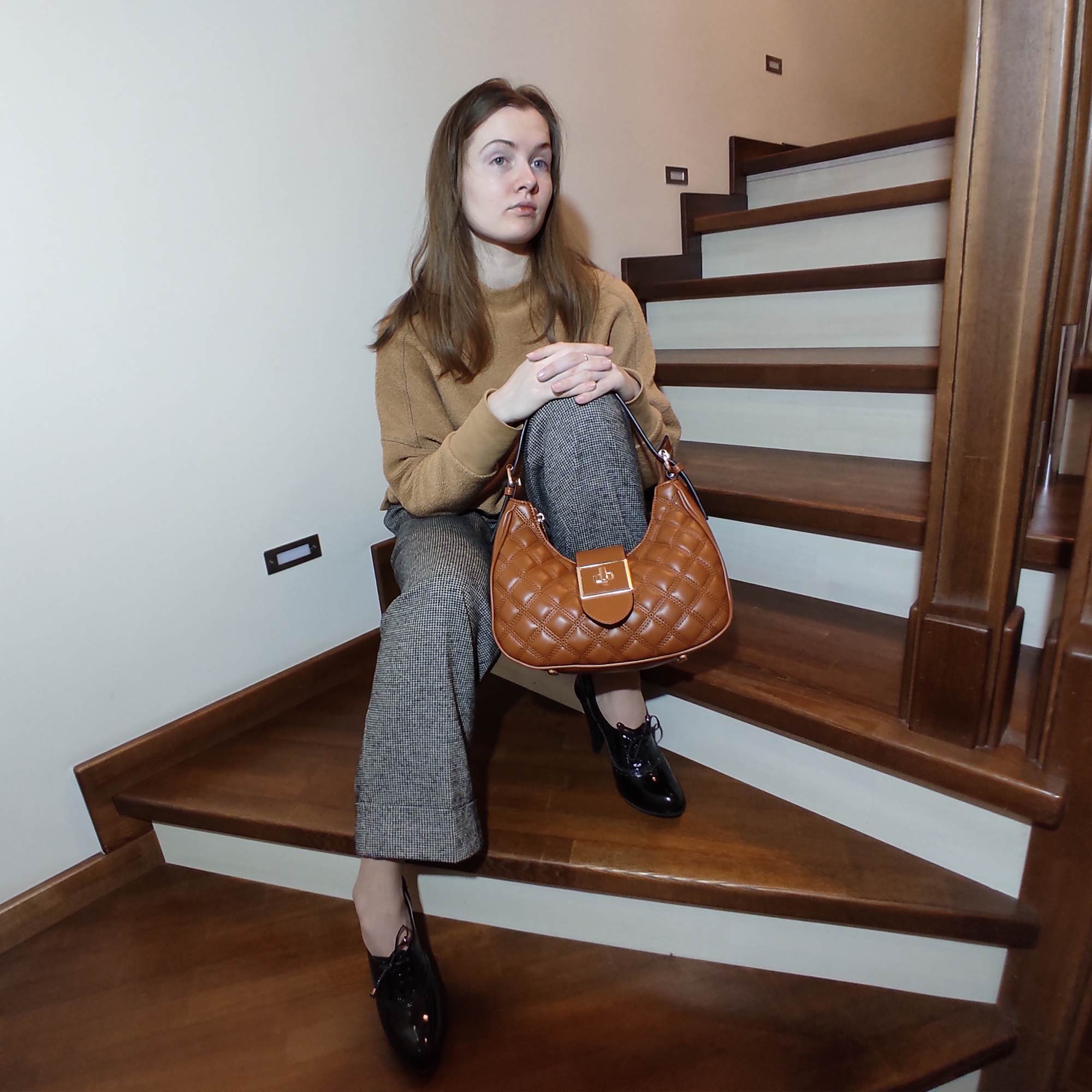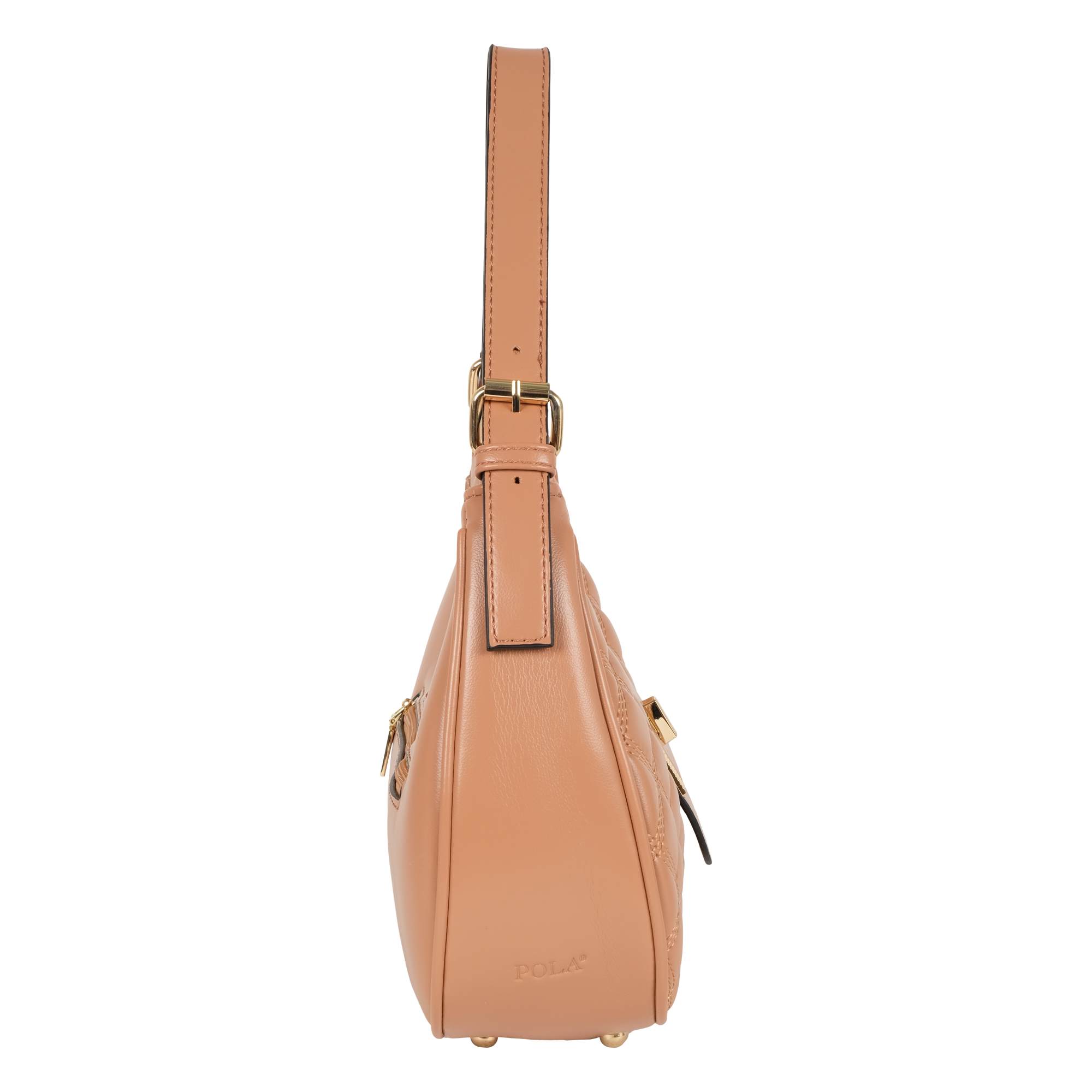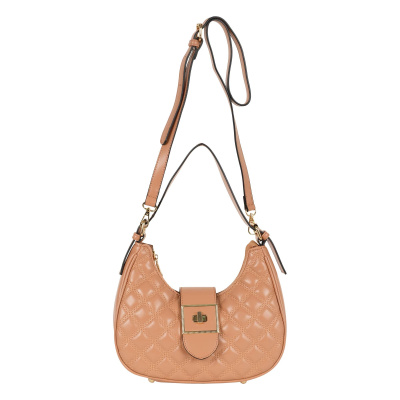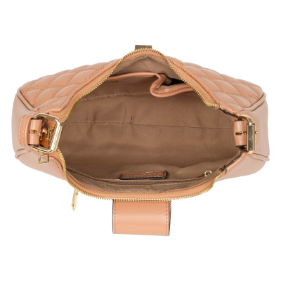 Миниатюрная, стильная сумочка фирмы Pola выполнена из экокожи со стеганым узором. Аксессуар закрывается поворотным замком, внутренний карман застегивается молнией. В основном отделении, есть карман на молнии для карточек, ключей и два открытых кармашка. Сзади врезной карман на молнии. У сумки есть регулируемая ручка для переноски, высота которой составляет 25 см и съёмный, тонкий, съемный, регулируемый ремешок, длина которого- 115 см. Благодаря которым аксессуар можно носить разными способами. Цвет фурнитуры-золото.